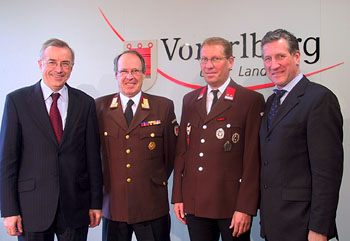 LH Sausgruber und LR Schwärzler mit Landesfeuerwehrinspektor Welte und seinem designierten Nachfolger Hubert Vetter