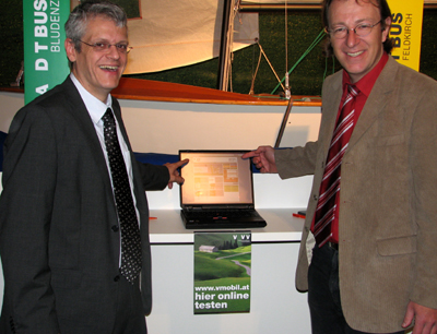 Dornbirn (VLK) - Ergänzend zum persönlichen und telefonischen Service der Mobilitätsanbieter und der Gemeinden wird die Bus- und Bahn-Service-Seite im Internet www.vmobil.at in den nächsten Monaten konsequent zum Vorarlberger Mobilitätsportal ausgebaut. Denn wer gut unterwegs sein will, braucht die richtigen Informationen dazu – rund um die Uhr, rasch verfügbar und ortsunabhängig. Der Geschäftsführer des Verkehrsverbunds Vorarlberg, Christian Österle und Vorarlberg MOBIL-Projektleiter Martin Scheuermaier gaben heute, Freitag, in der Halle 7 der Dornbirner Frühjahrsmesse die Details dazu bekannt.