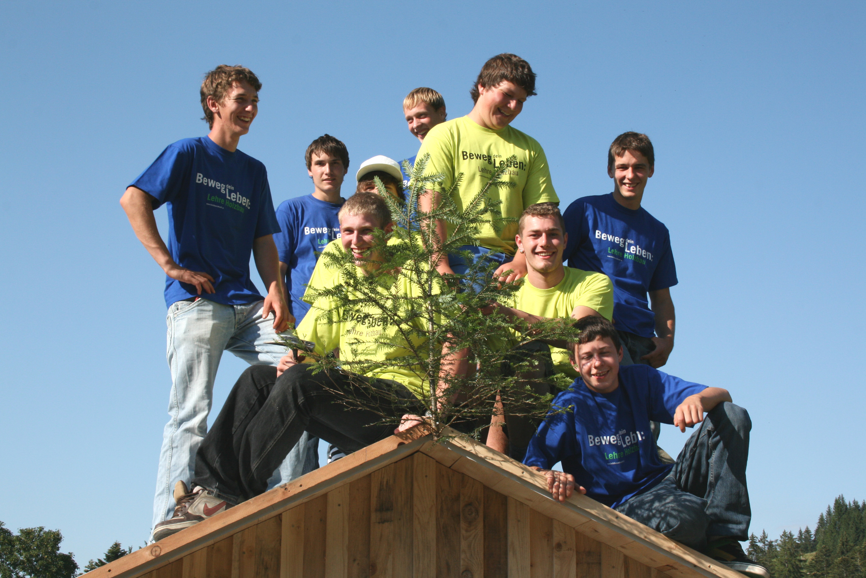 "holzbau_zukunft" – Ausbildungsprojekt der Vorarlberger Zimmerer (im Bild: Die Lehrlinge bei der Firstfeier)