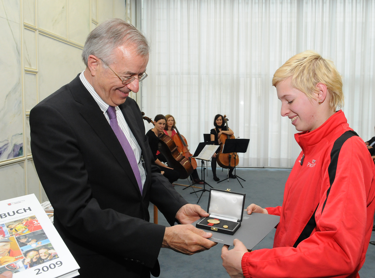 LH Sausgruber überreichte Sportehrenzeichen des Landes (im Bild: LH Sausgruber und Weltmeisterin Lisa Frick)