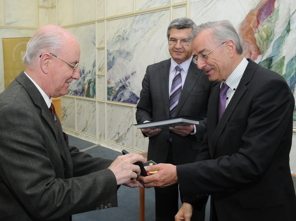 Drei Persönlichkeiten durften das Ehrenzeichen des Landes für Verdienste um den Vorarlberger Sport in Gold entgegennehmen: Herbert Prodinger, Walter Trampitsch (beide aus Dornbirn) und Armin Welte (Frastanz):