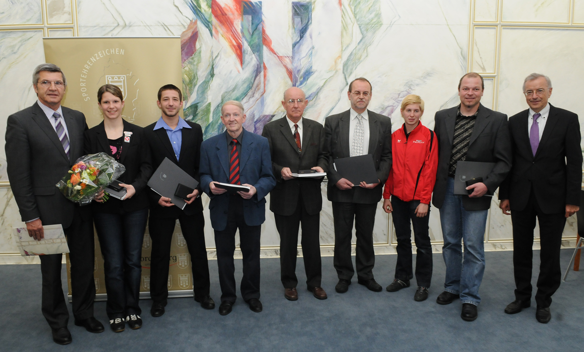 Bregenz (VLK) – Im Montfortsaal des Landhauses überreichten Landeshauptmann Herbert Sausgruber und Sportlandesrat Siegi Stemer heute, Montag, eine Reihe von Sportehrenzeichen. "Mit den Auszeichnungen würdigen wir einerseits die großartigen Leistungen der Sportlerinnen und Sportler in Vorarlberg und andererseits das – vielfach ehrenamtliche – Engagement der heimischen Funktionäre", betonte der Landeshauptmann bei der Übergabe der Ehrenzeichen.