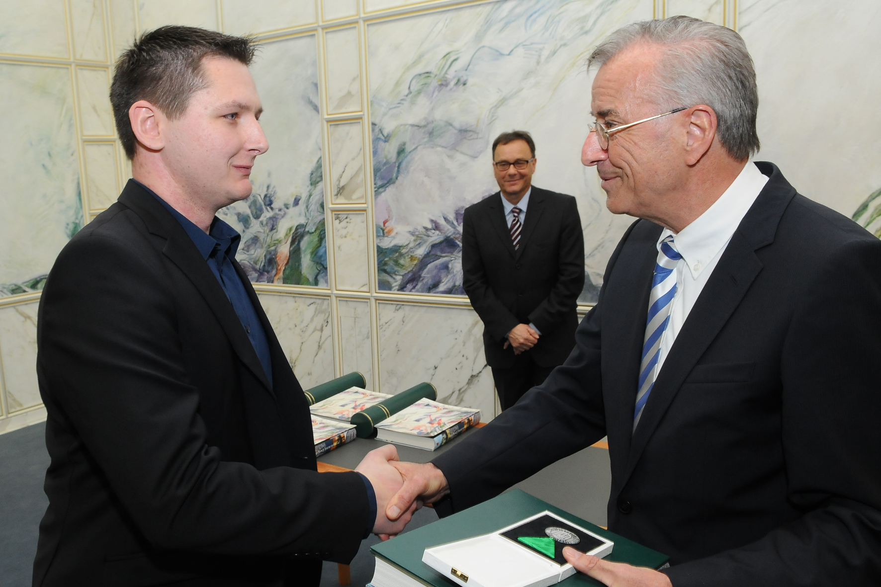 LH Sausgruber überreicht dieLebensrettungsmedaille an Philip-Bruno Malin.
