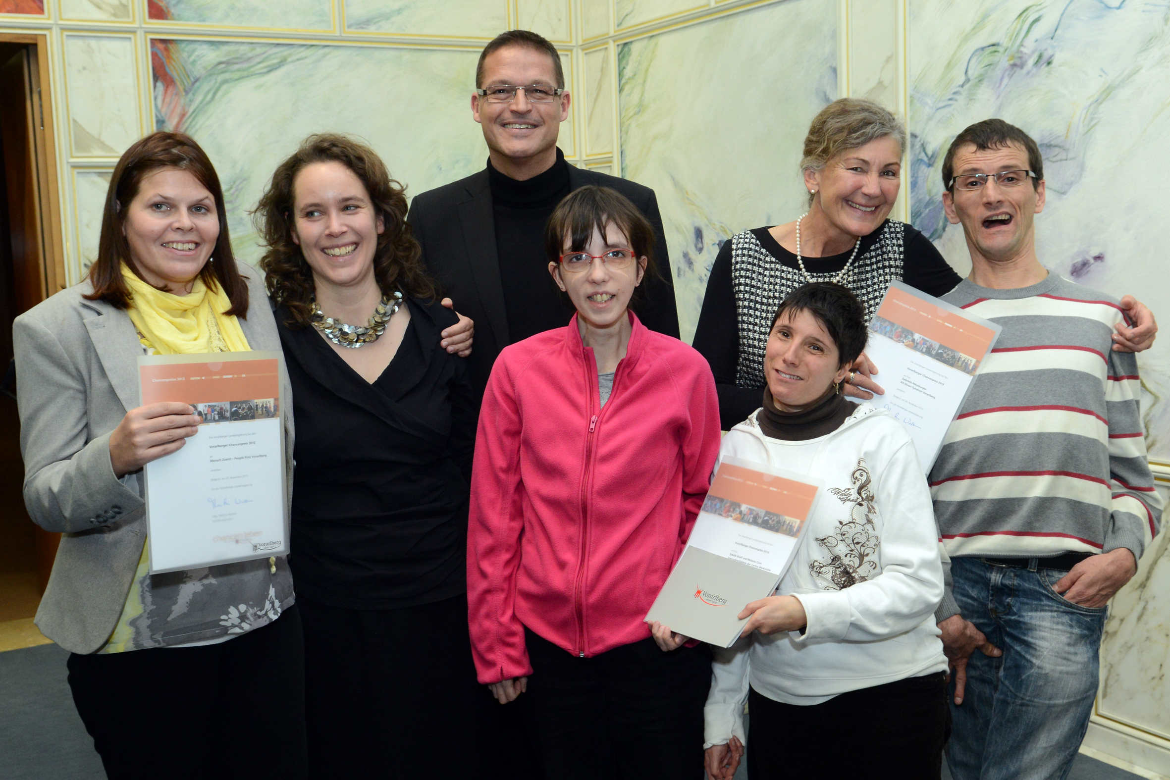 Chancenpreis 2013 ? die Preisträger 1. Platz: Heinz Grabher, Reiz Selbstbestimmt Leben, Dornbirn, (in Vertretung) 2. Platz: Sybille Grafl + Melanie Corn, Sprungbrettlädele der Caritas Werkstätte, Bludenz 2. Platz: Mensch Zuerst ? People First Vorarlberg, Dornbirn 3. Platz: Gabriela Meusburger, AG Down Syndrom Vorarlberg, Hohenems