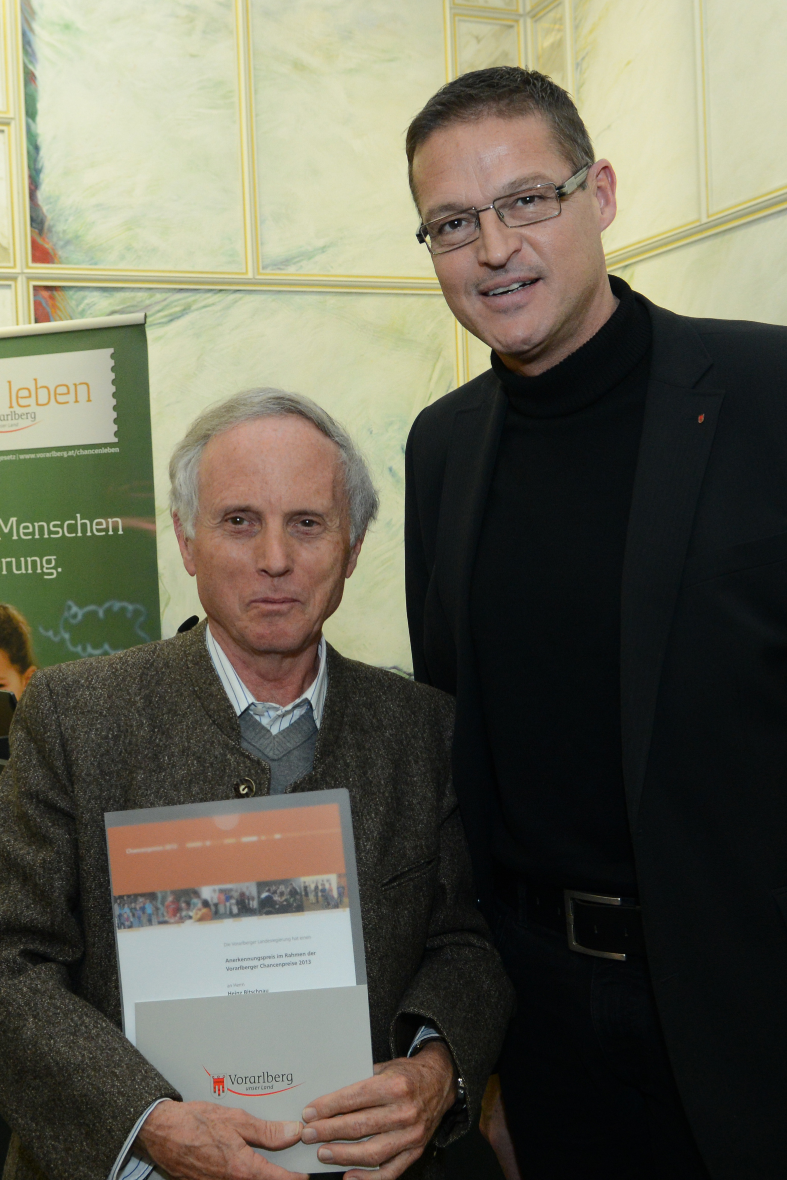Landesrat Christian Bernhard hat heute (Mittwoch, 20. November) im Landhaus in Bregenz den Vorarlberger Chancenpreis 2013 an die Preisträger überreicht. Beim diesjährigen Wettbewerb waren "Ideenstifter für Chancen" gesucht. Eine unabhängige Jury hat aus 70 eingelangten Statements die Preisträger ermittelt. (1. Platz: Heinz Grabher in Vertretung)