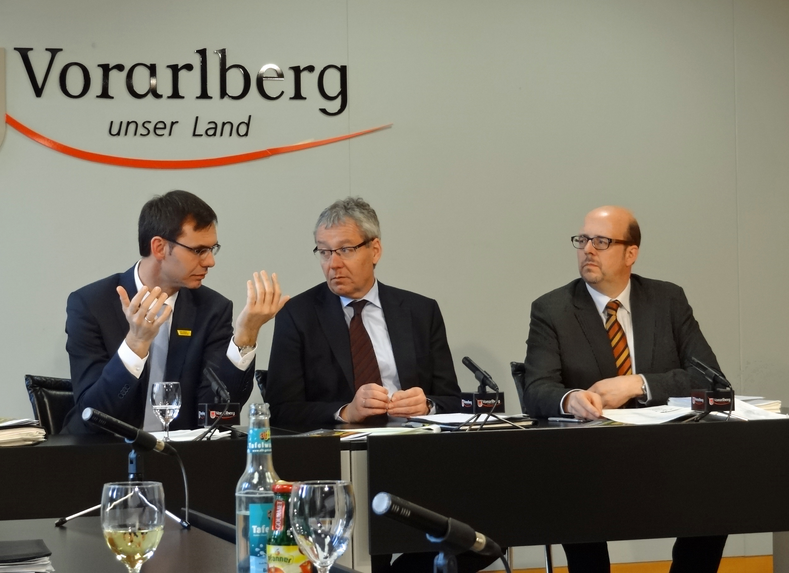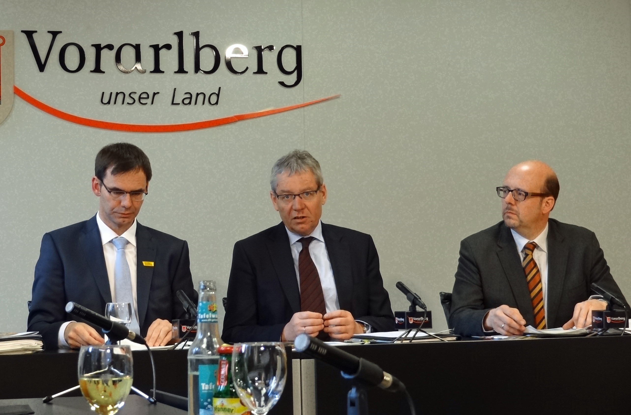 Stellten die neuen Wohnbauförderungsrichtlinien im Neubau vor: LH Markus Wallner, LSth. Karlheinz Rüdisser und Lothar Hinteregger, Vorstand der Wohnbauförderungsabteilung; Foto: VLK//T. Mair, Dienstag, 25. März 2014