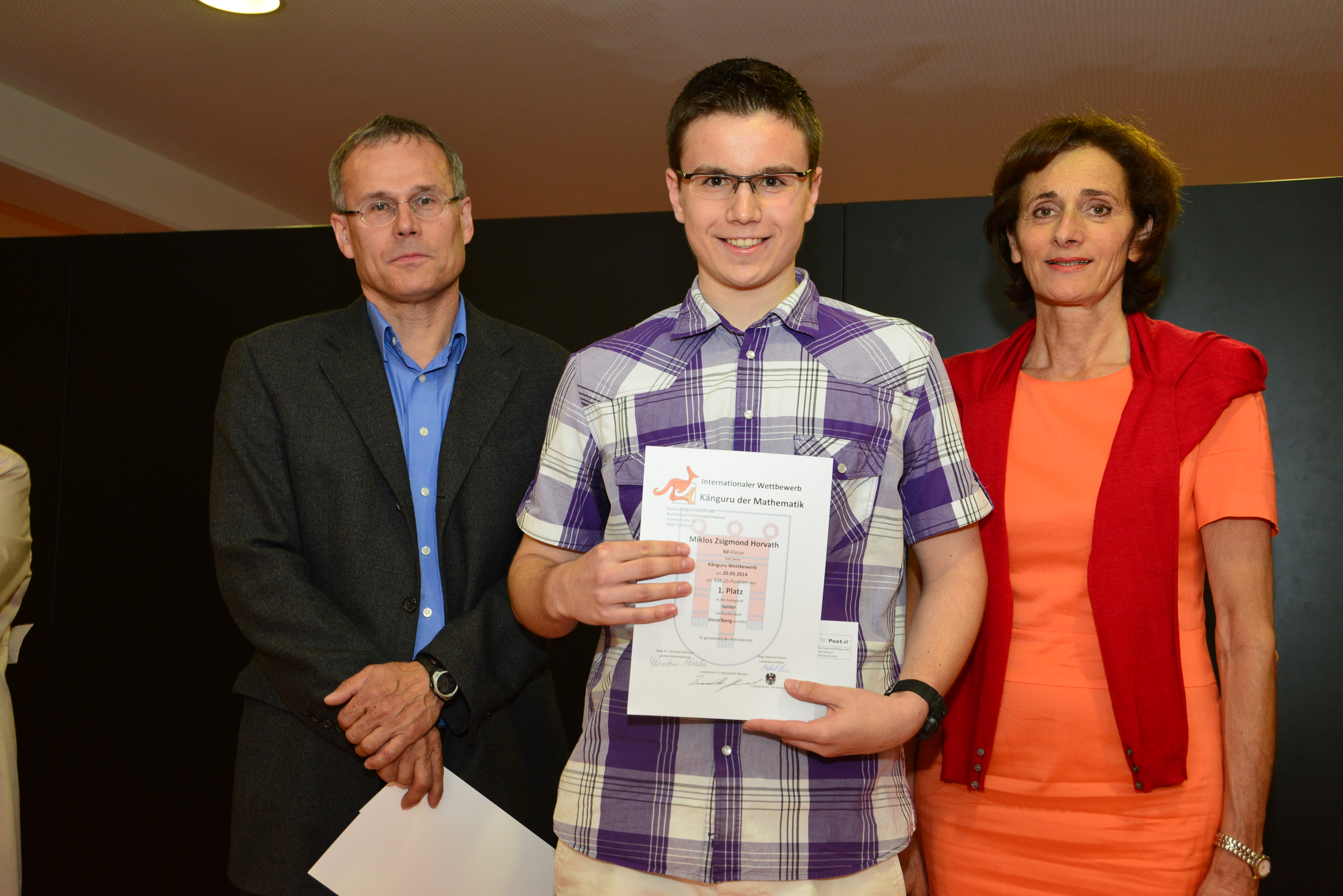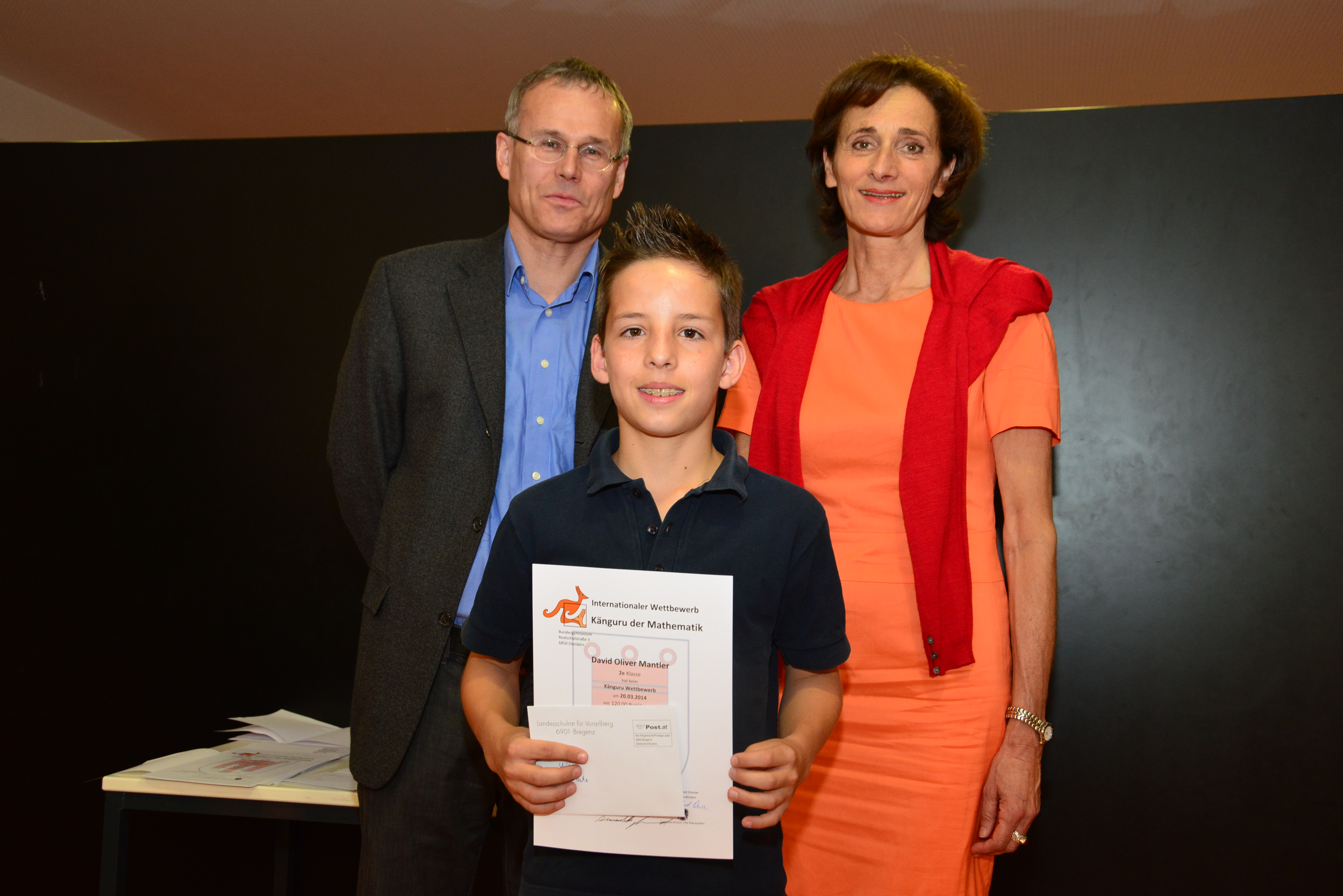 Bregenz (VLK) – Die Siegerinnen und Sieger des Schulwettbewerbs "Känguru der Mathematik" wurden am Donnerstag, 22. Mai 2014, am BG Blumenstraße in Bregenz von Schullandesrätin Bernadette Mennel mit Urkunden und Preisen ausgezeichnet. Im Mittelpunkt standen vor allem David Oliver Mantler vom BG Dornbirn und Miklos Horvath vom BRG/BORG Feldkirch-Schillerstraße. Sie haben nicht nur den Landessieg in ihrer Schulstufe geholt, sondern auch den 1. Platz im Österreich-Ranking.