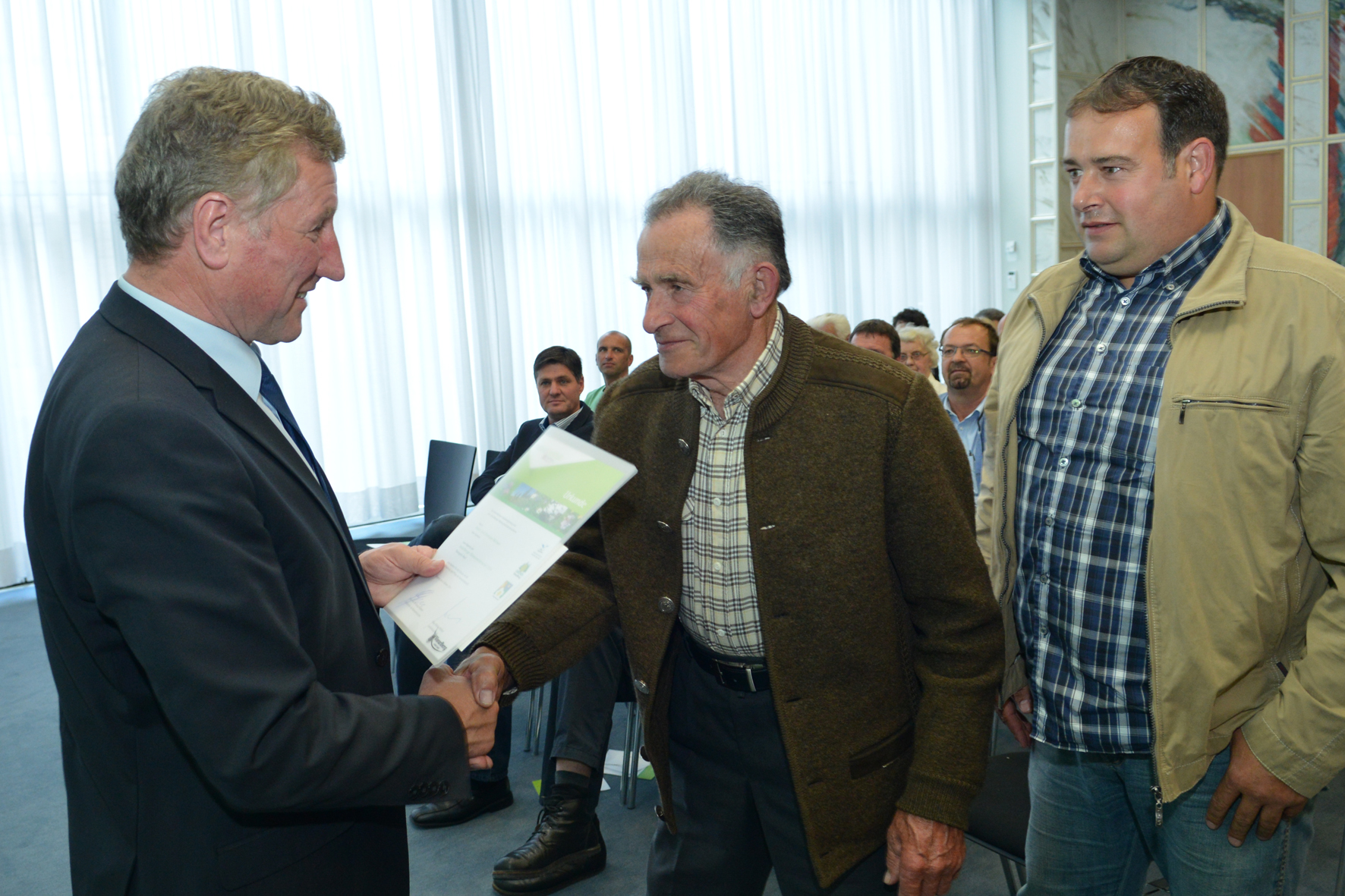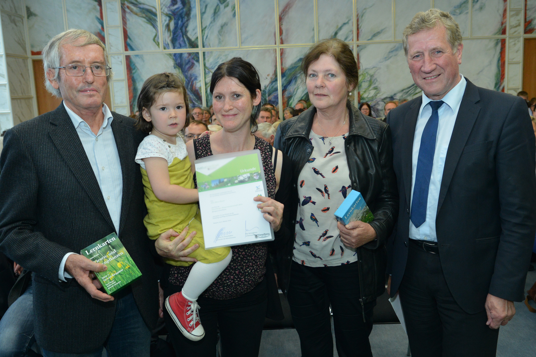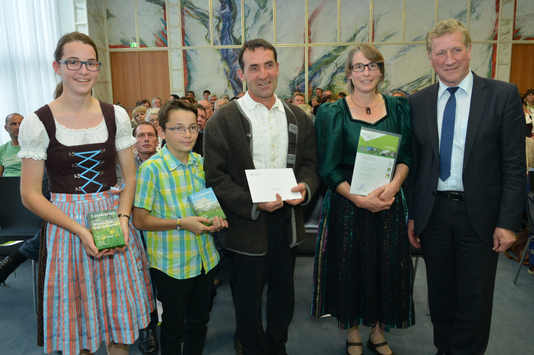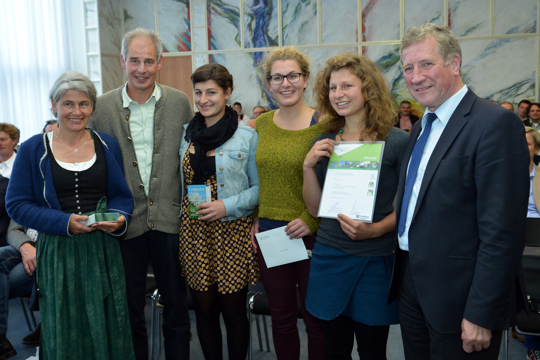 Bregenz (VLK) – Agrarlandesrat Erich Schwärzler und Naturschutzrats-Vorsitzender Professor Georg Grabherr nahmen am Montag, 6. Oktober 2014, im Landhaus die Siegerehrung der Vorarlberger Wiesenmeisterschaft 2014 vor. Insgesamt 19 bäuerliche Betriebe wurden im Rahmen des Bewerbes für vorbildliche ökologische Leistungen auf ihren Wiesen und Alpen ausgezeichnet.