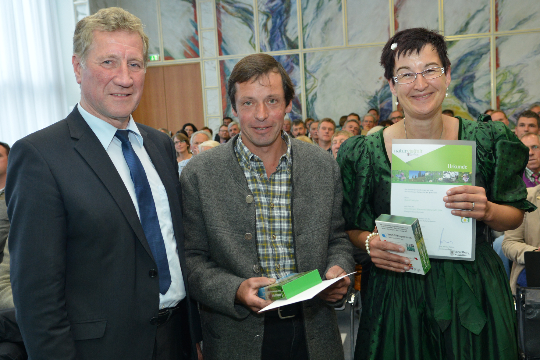 Agrarlandesrat Erich Schwärzler und Naturschutzrats-Vorsitzender Professor Georg Grabherr nahmen am Montag, 6. Oktober 2014, im Landhaus die Siegerehrung der Vorarlberger Wiesenmeisterschaft 2014 vor. Insgesamt 19 bäuerliche Betriebe wurden im Rahmen des Bewerbes für vorbildliche ökologische Leistungen auf ihren Wiesen und Alpen ausgezeichnet.