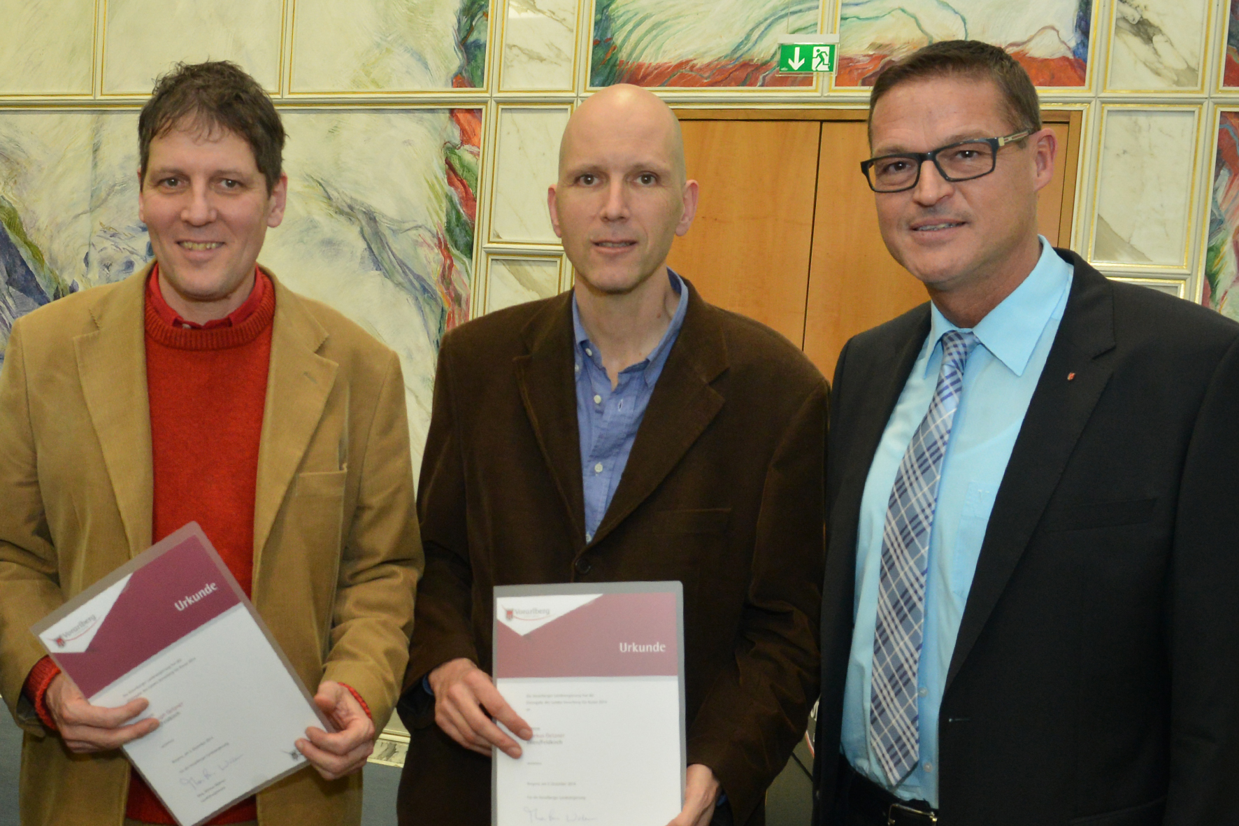 Bregenz (VLK) – Kulturlandesrat Christian Bernhard überreichte am Dienstag (2. Dezember) im Landhaus die Ehren- und Fördergaben für Kunst 2014. Insgesamt fünf Kunst- und Kulturschaffende wurden ausgezeichnet. Die mit je 4.000 Euro dotierten Ehrengaben für Kunst gingen an die bildenden Künstler Christoph und Markus Getzner und an den Keramikkünstler Thomas Bohle. Die Schriftstellerin Nadine Kegele und der Komponist Markus Nigsch erhielten die Fördergaben für Kunst im Wert von jeweils 2.000 Euro.