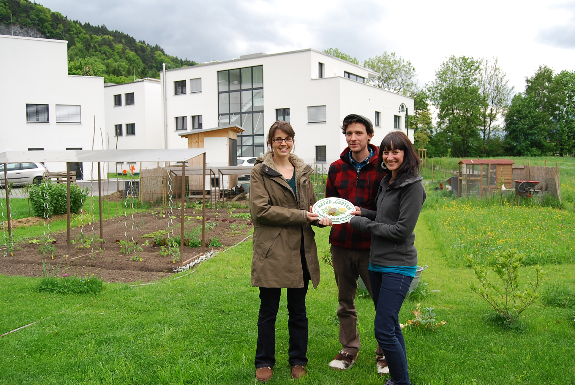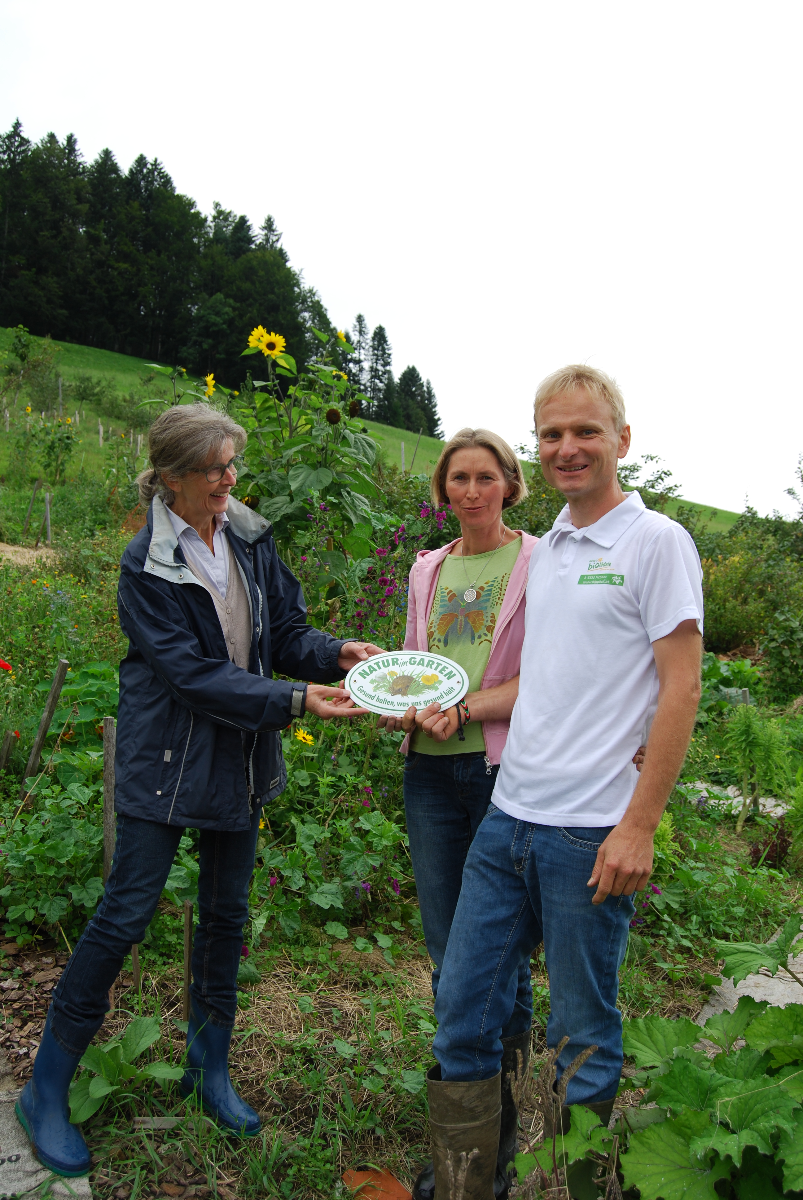 Jutta Mangold von faktor NATUR übergibt die Plakette an Kaufmann Alfons und Daniela, Permakulturhof, Hittisau
