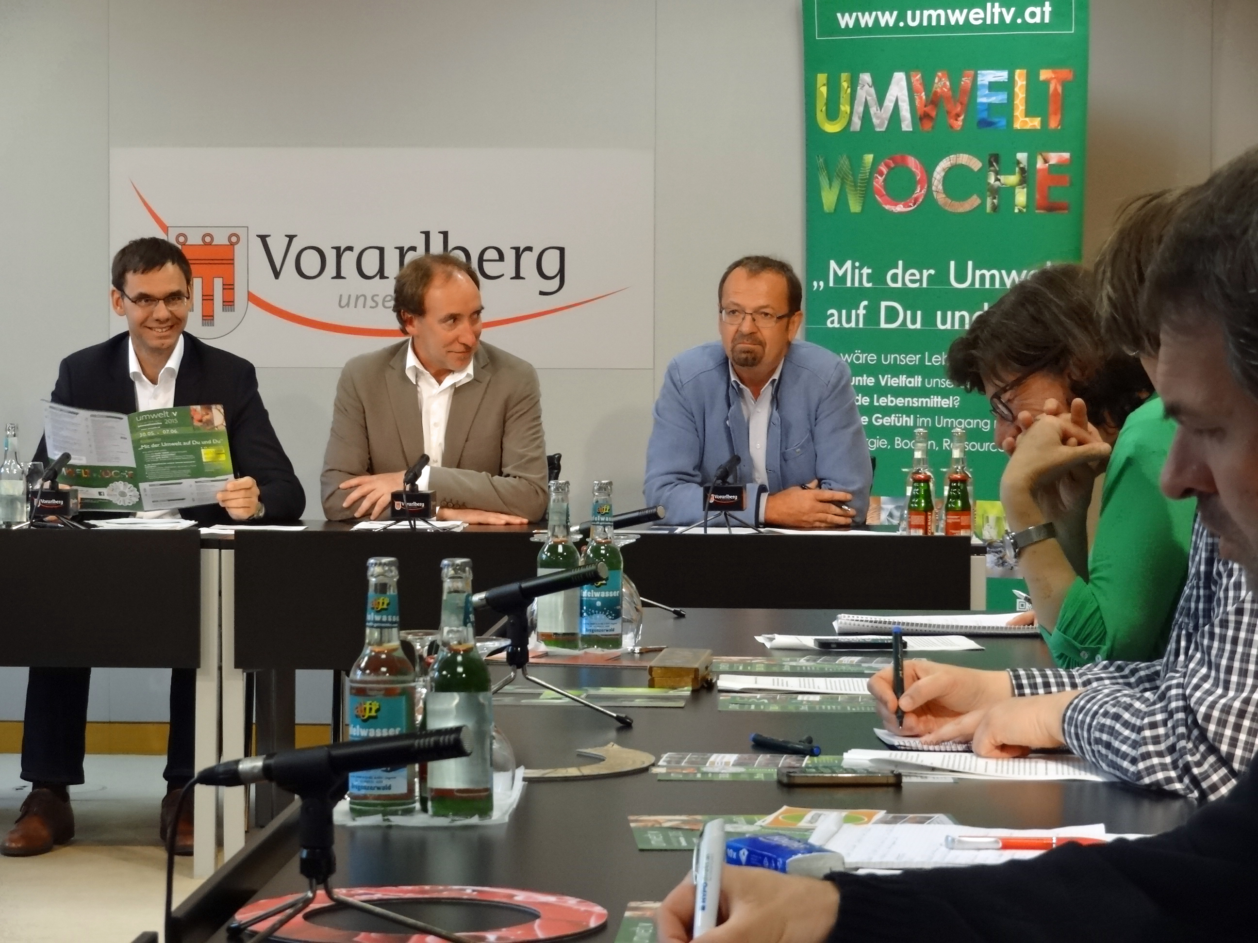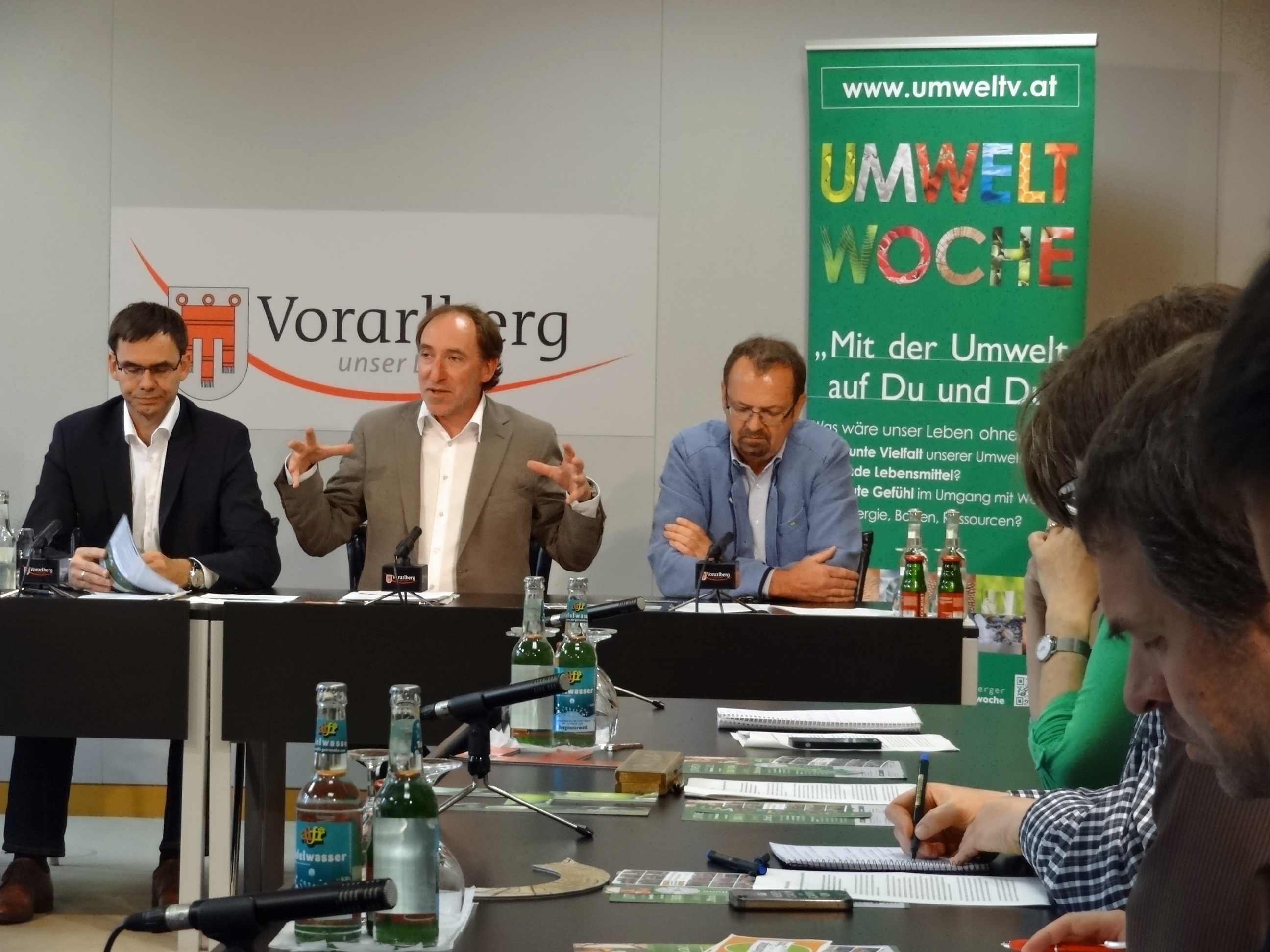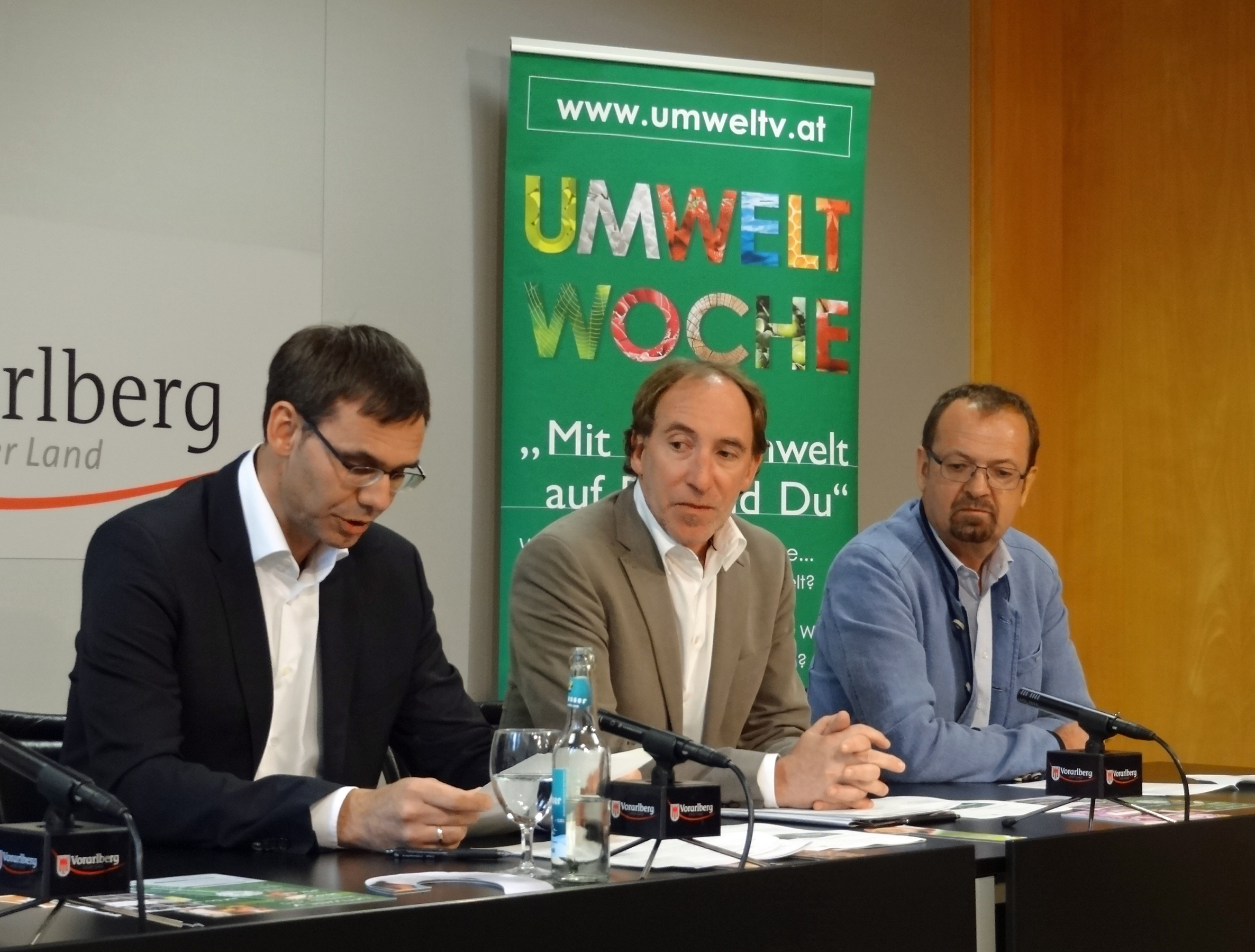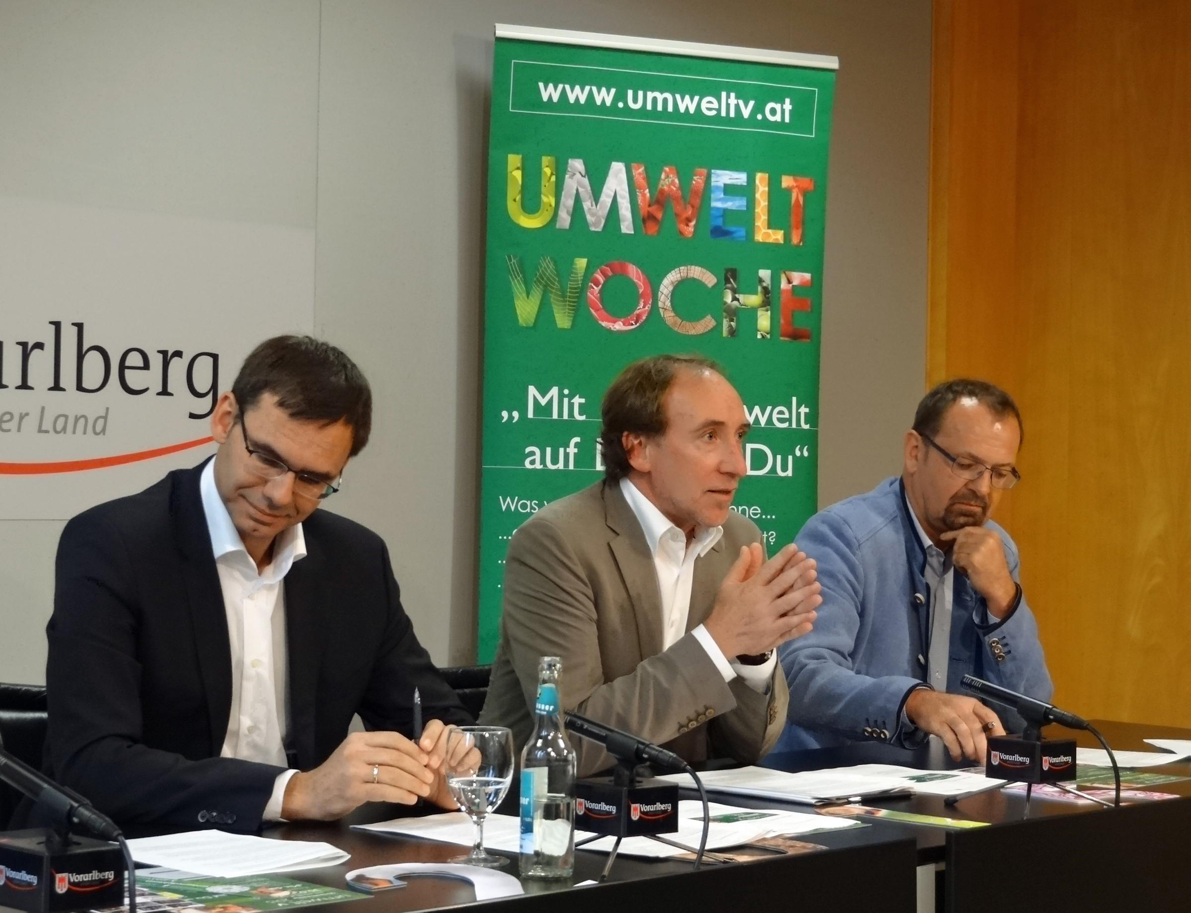 Bregenz (VLK) – Das Thema Nachhaltigkeit, der Umgang mit Wasser, Luft, Energie, Boden und anderen Ressourcen sowie gesunde Lebensmittel – um diese Schwerpunkte dreht sich alles in der Vorarlberger Umweltwoche (30. Mai bis 7. Juni 2015). Landeshauptmann Markus Wallner, Umweltlandesrat Johannes Rauch und Umweltverbandsobmann Rainer Siegele stellten im Pressefoyer am Dienstag, 26. Mai 2015, das umfangreiche Informations- und Veranstaltungsprogramm vor.