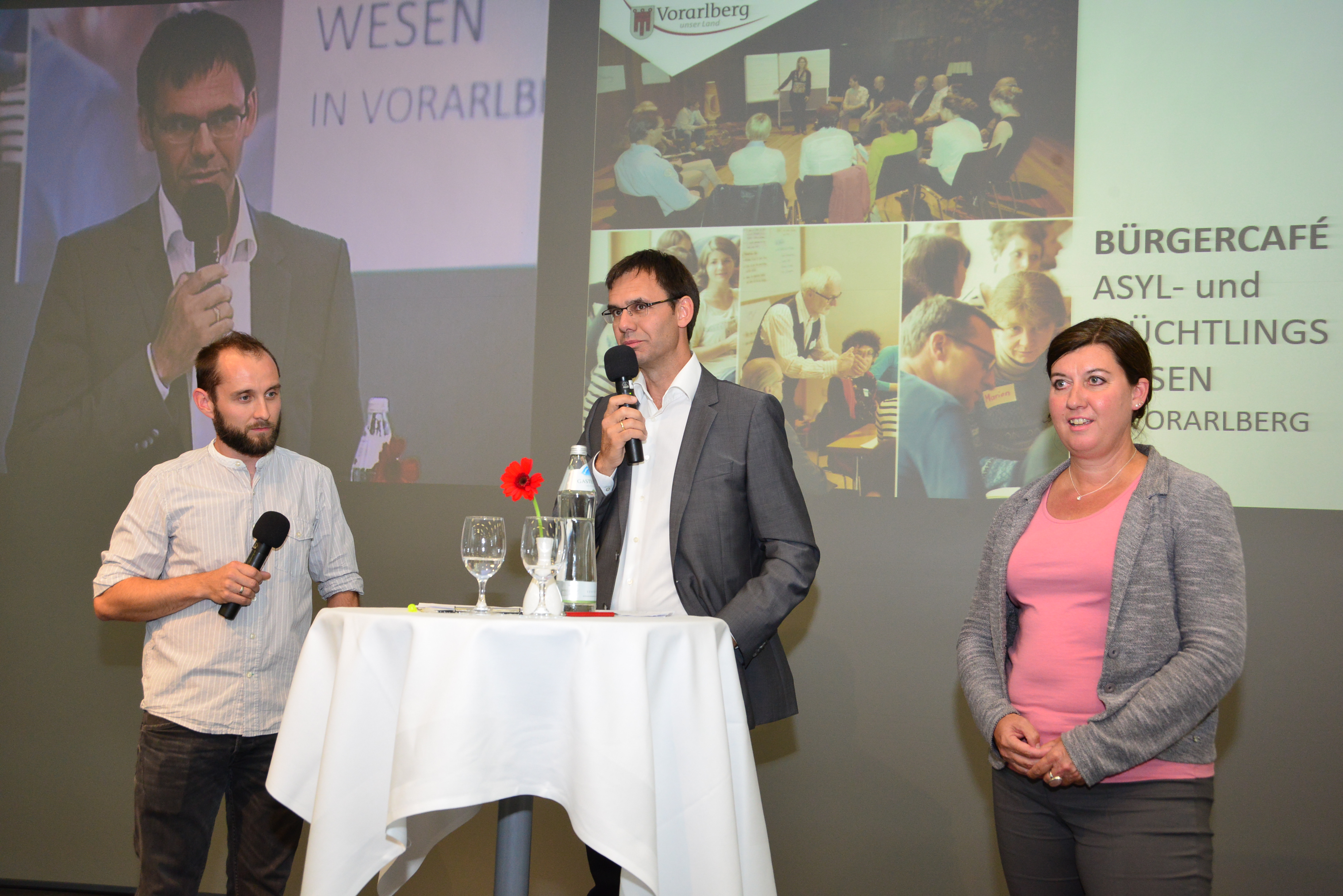 Dornbirn (VLK) – 23 nach dem Zufallsprinzip aus dem Melderegister ausgewählte Bürgerinnen und Bürger haben Anfang Juni einen "BürgerInnen-Rat" gebildet und sich in diesem Forum zwei Tage mit der Asyl- und Flüchtlingsthematik auseinandergesetzt. Im Rahmen von zwei Bürgercafés werden der Öffentlichkeit und der Politik jetzt die Ergebnisse präsentiert. Im Beisein von Landeshauptmann Markus Wallner fand am Montagabend (15. Juni) das erste Bürgercafé in der Fachhochschule Vorarlberg in Dornbirn statt.