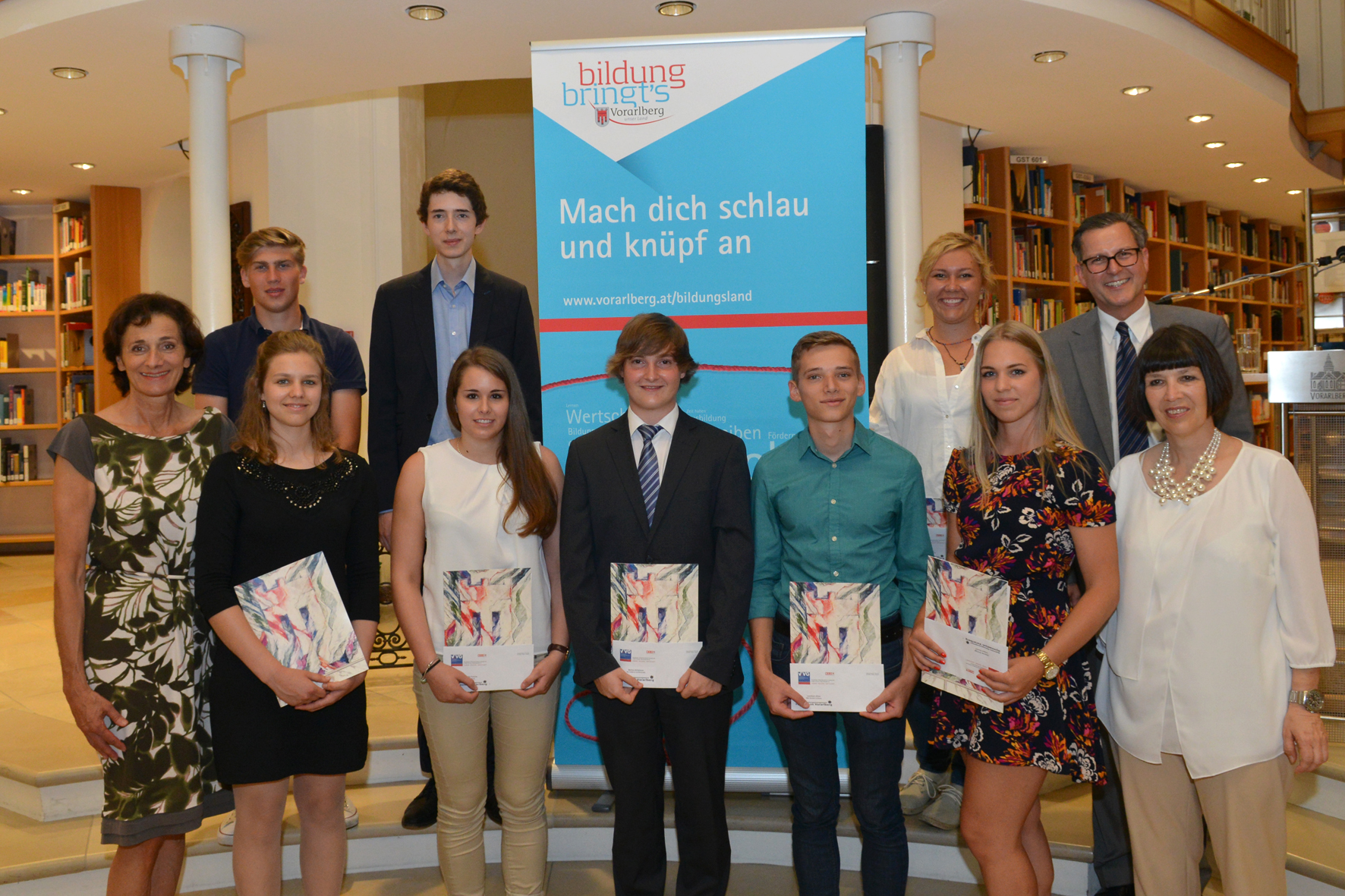 Erstmals wurden am Dienstag, 7. Juli 2015, neun Maturantinnen und Maturanten für ihre "Vorwissenschaftliche Arbeit" ausgezeichnet. Bei der Feier im Kuppelsaal der Vorarlberger Landesbibliothek in Bregenz lobte Schullandesrätin Bernadette Mennel die hohe Qualität der Arbeiten: "Ich gratuliere den Preisträgerinnen und Preisträgern sehr herzlich zu dieser herausragenden Leistung und wünsche ihnen auf ihrem weiteren Weg viel Erfolg."