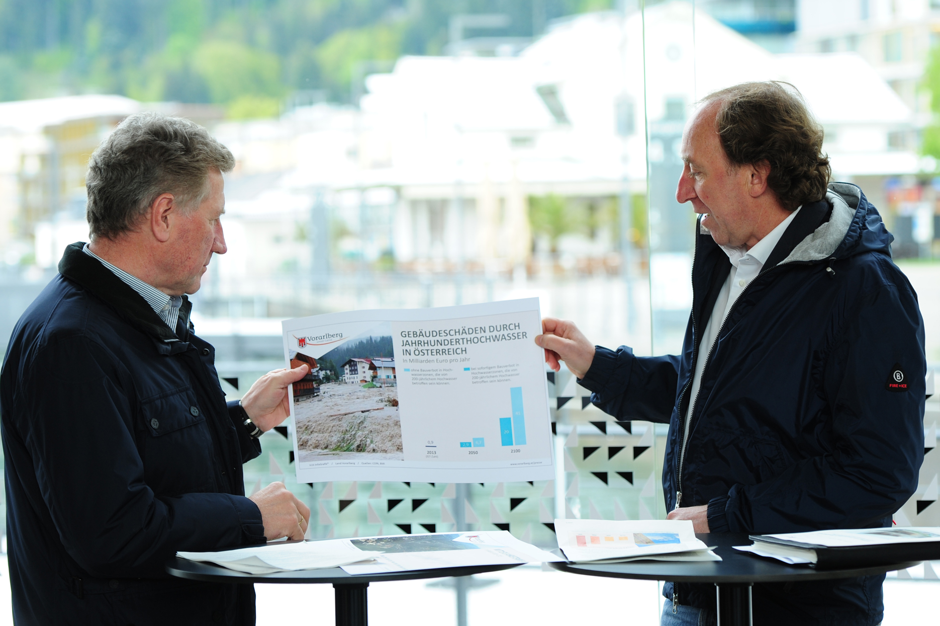 Die Landesräte Johannes Rauch und Erich Schwärzler bei der Präsentation der Vorarlberger Klimawandel-Anpassungsstrategie im Hafen Bregenz.