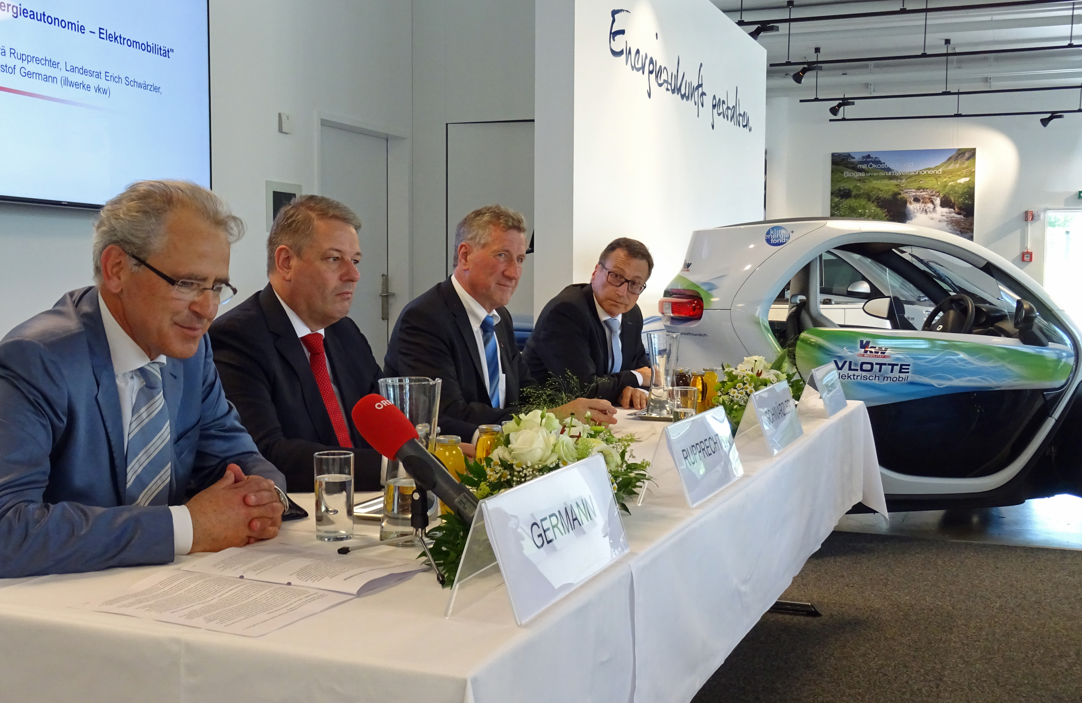 Bregenz (VLK) – Die Elektromobilität zählt zu jenen Bereichen, die auf dem Weg in Richtung Energieautonomie Vorarlberg neue vielversprechende Möglichkeiten offenbaren. Im ersten Halbjahr 2016 wurden in Vorarlberg in in etwa gleich viele Elektroautos zugelassen wie in den vergangenen zwei Jahren insgesamt. In dieser Entwicklung ist aber immer noch viel Luft nach oben, betonten Bundesminister Andrä Rupprechter und Landesrat Erich Schwärzler sowie die illwerke vkw-Vorstände Christof Germann und Helmut Mennel vor Journalisten am Mittwoch, 20. Juli. Die gemeinsamen Bemühungen sollen daher weiter intensiviert werden.