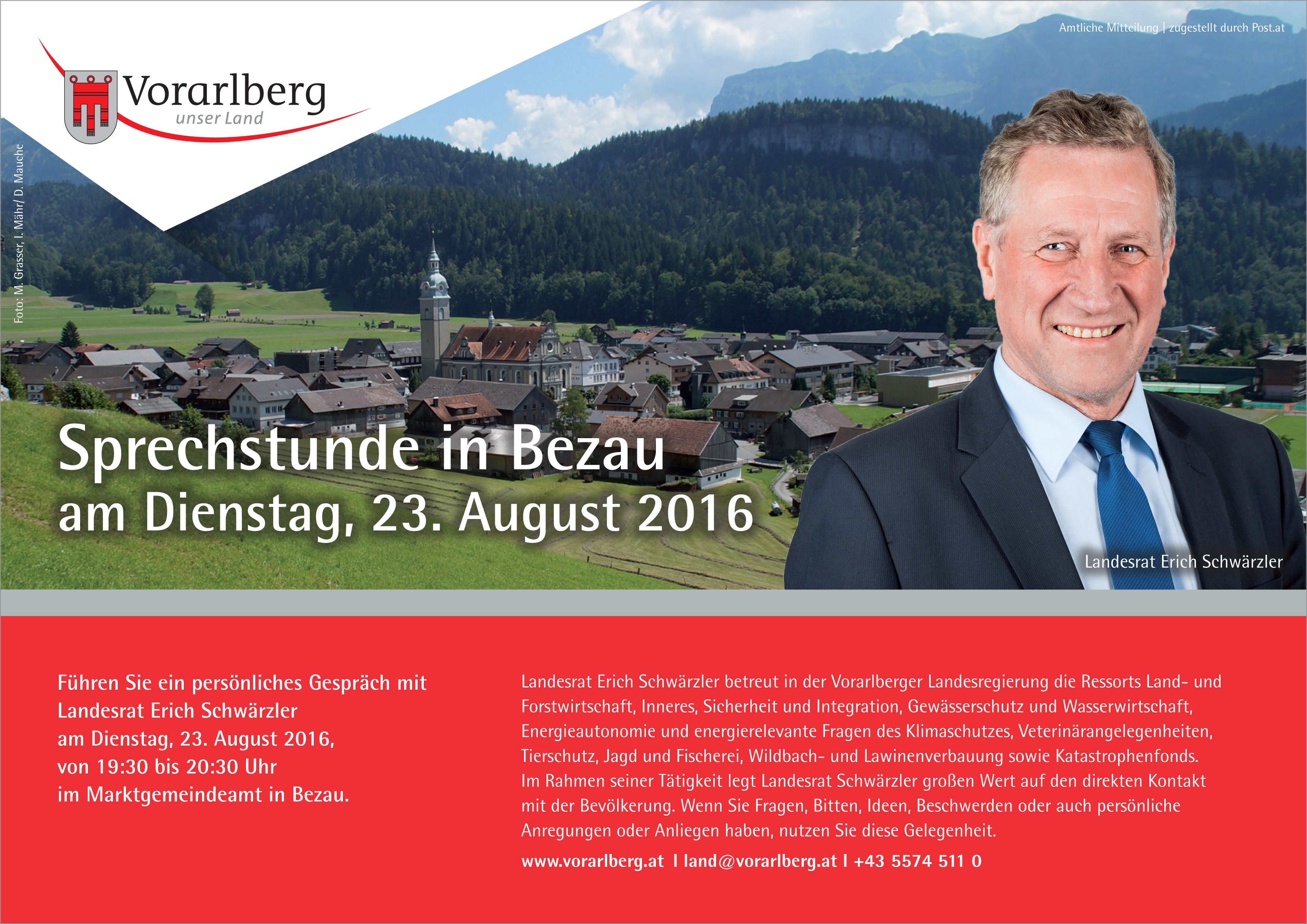 Bezau (VLK) - Am Dienstag, 23. August 2016 wird Landesrat Erich Schwärzler von 19:30 bis 20:30 Uhr im Marktgemeindeamt in Bezau eine öffentliche Sprechstunde abhalten. Bei der Sprechstunde können dem Landesrat dabei auch allgemeine und persönliche Probleme vorgetragen werden.