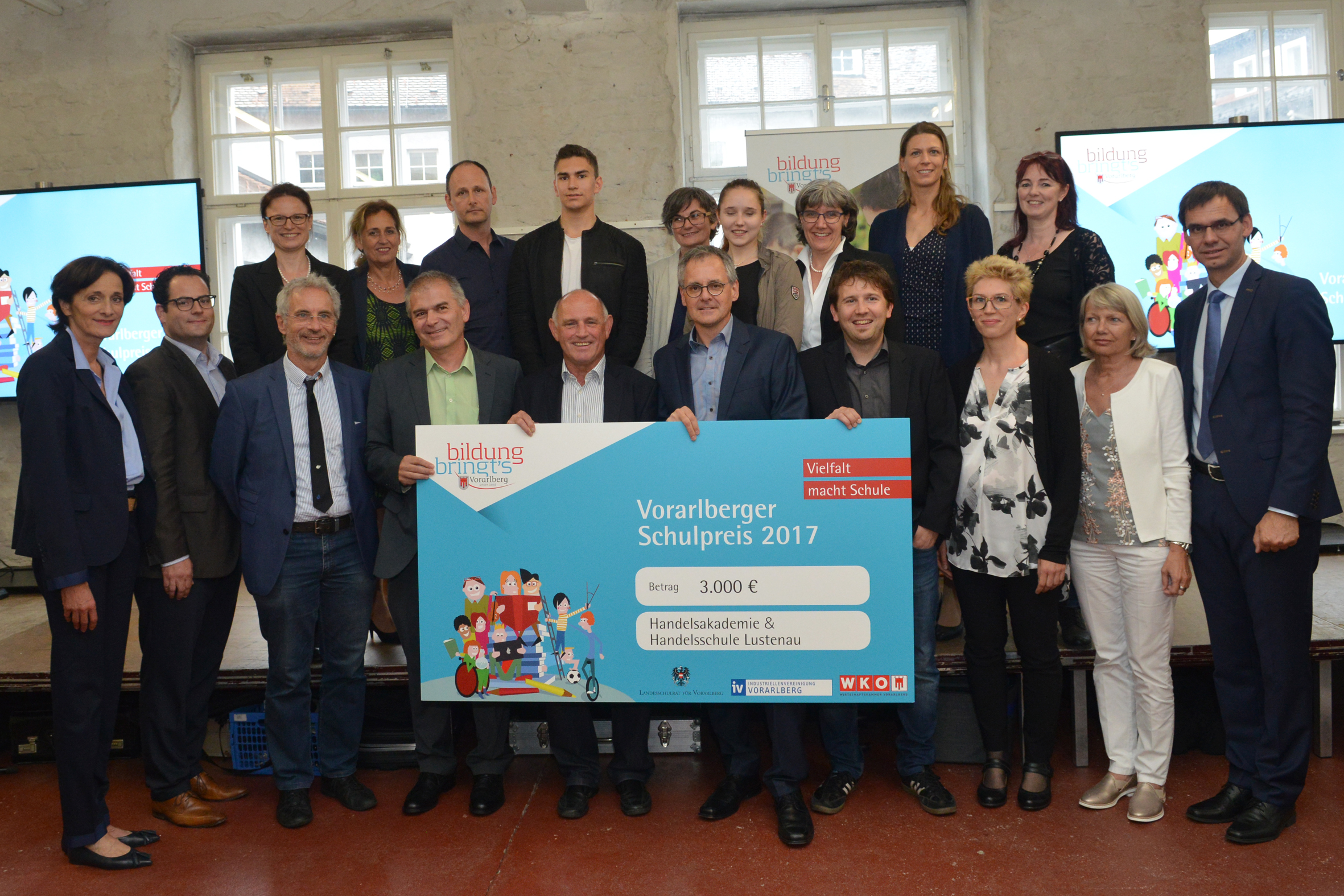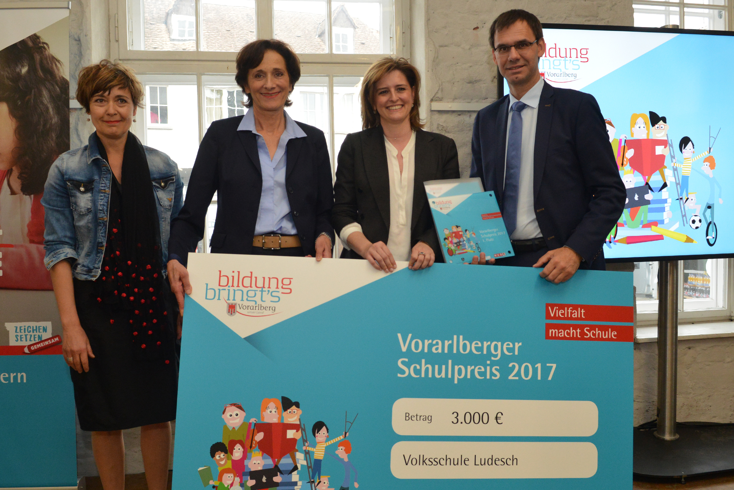 Lauterach (VLK) – „Vielfalt macht Schule“: Unter diesem Motto sind die Volksschule Ludesch, die Mittelschule Höchst und die Handelsakademie/Handelsschule Lustenau heute (Freitag) in der Alten Seifenfabrik in Lauterach mit dem Vorarlberger Schulpreis 2017 ausgezeichnet worden. Die Preise wurden von Landeshauptmann Markus Wallner und Schullandesrätin Bernadette Mennel überreicht: „Dieser Preis ist eine öffentliche Anerkennung für die herausragende pädagogische Arbeit, die diese Schulen leisten. Dazu gratulieren wir den Schulleitungen, Lehrpersonen und den Schulgemeinschaften ganz herzlich.“