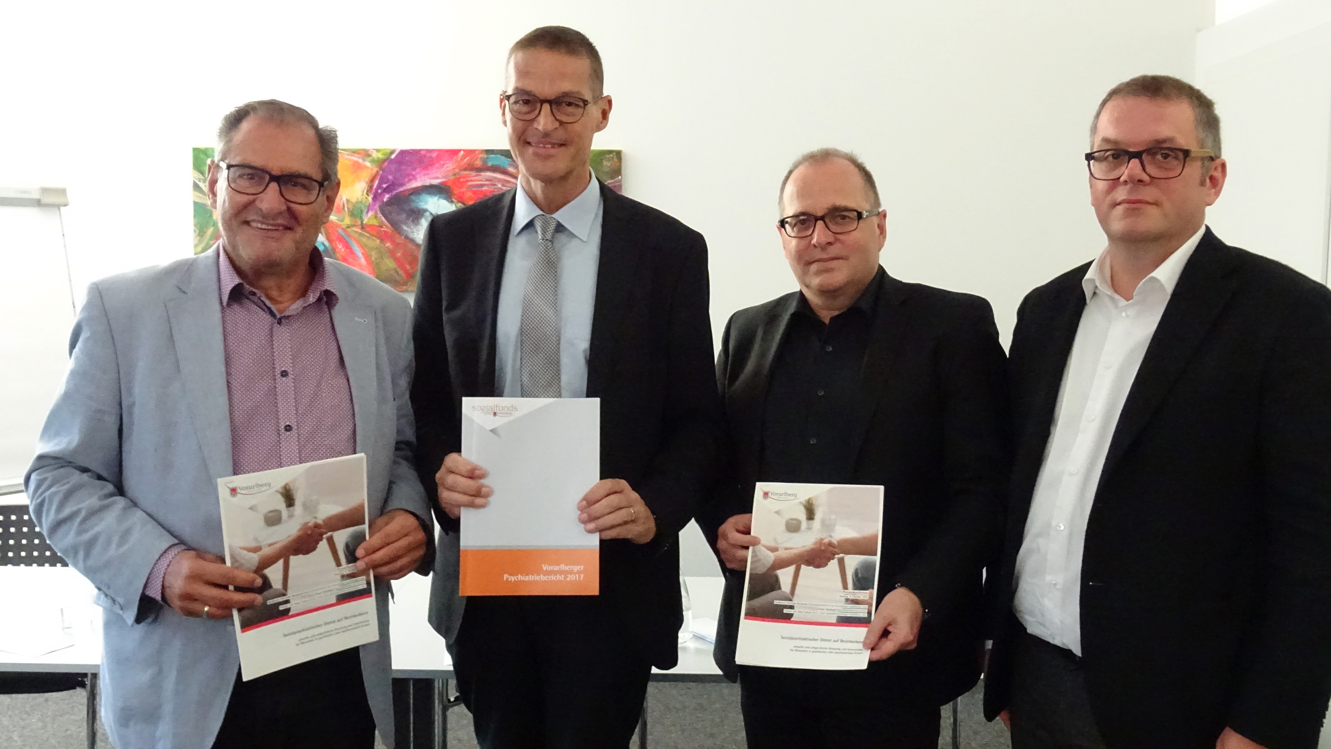 Landesrat Christian Bernhard mit Primar a.D. Hans Concin (aks), pro-mente-Geschäftsführer Elmar Weiskopf und Psychiatrie-Koordinator Joachim Hagleitner