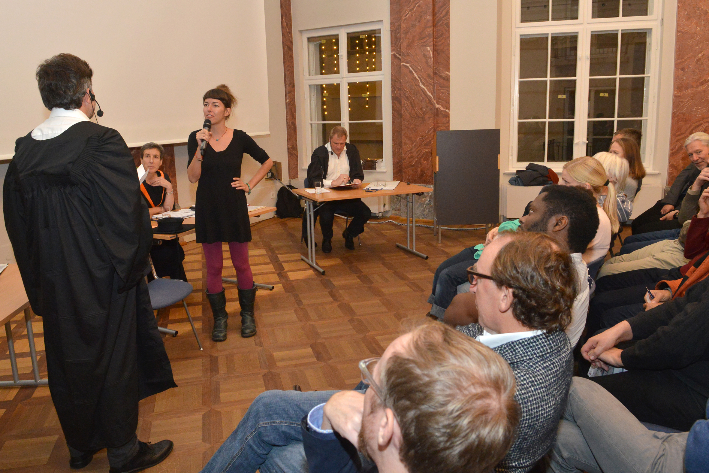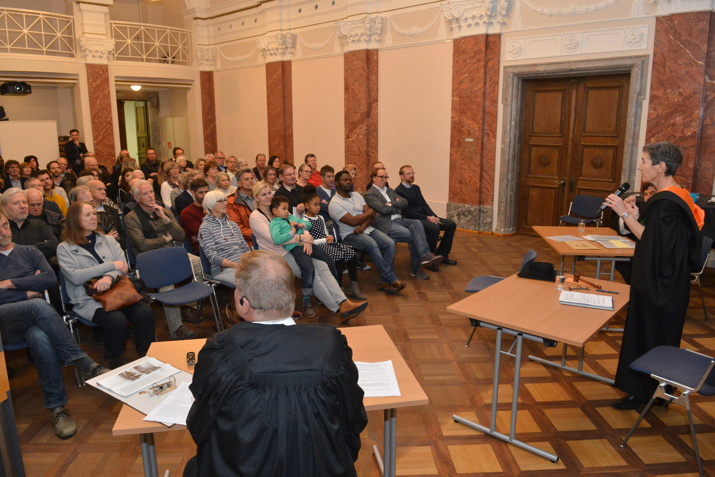 Entwicklungszusammenarbeit auf der Anklagebank: Mehr als 100 interessierte Personen waren der Einladung des Landes zu dieser ungewöhnlichen Veranstaltung gefolgt.