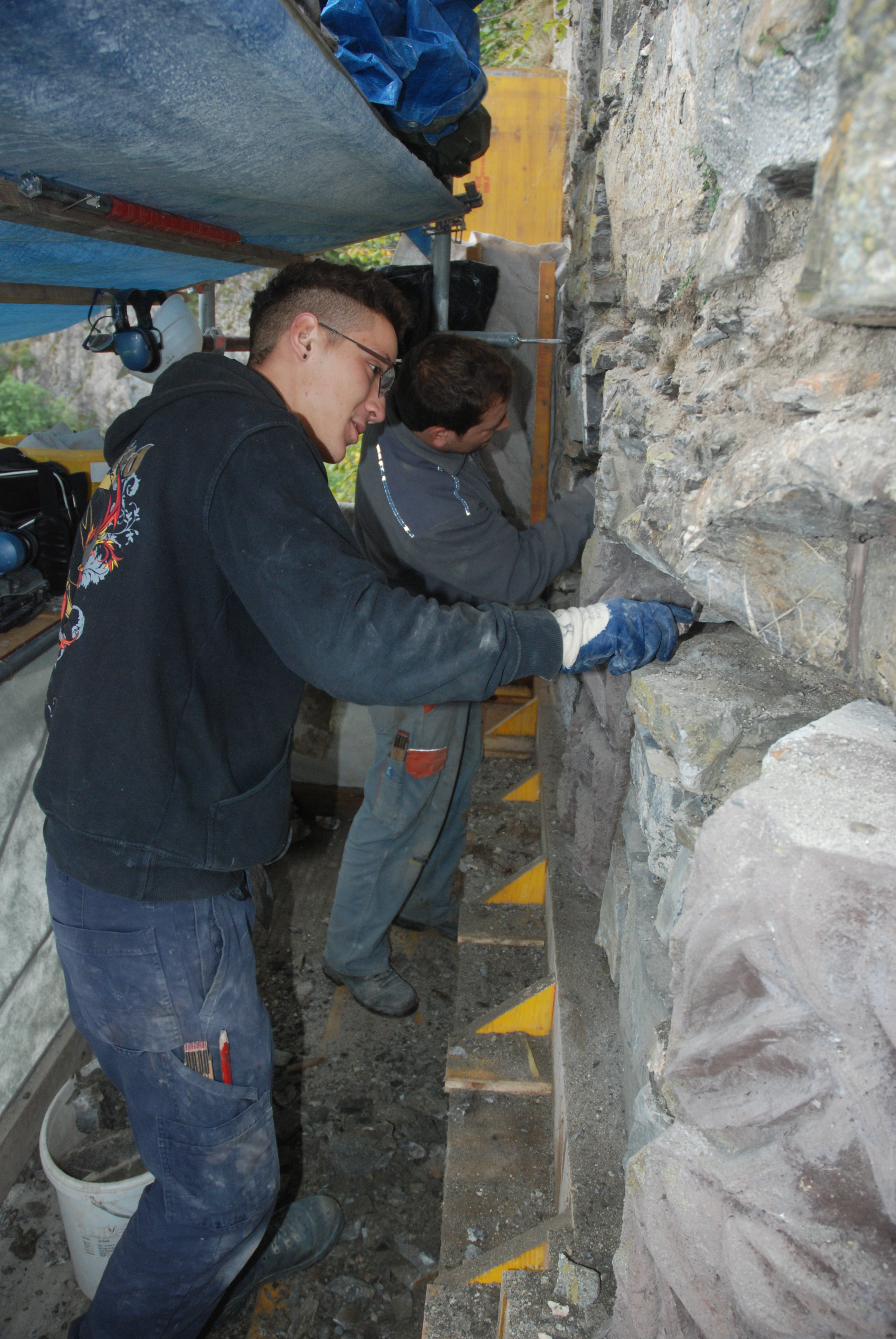 Arbeiten-Ruine-Neu-Montfort-Goetzis.jpg: Bei der Ruine Neu-Montfort in Götzis wurden Betonreste einer Restaurierung aus den 1960er Jahren entfernt und die mürben Mauerfugen erneuert.