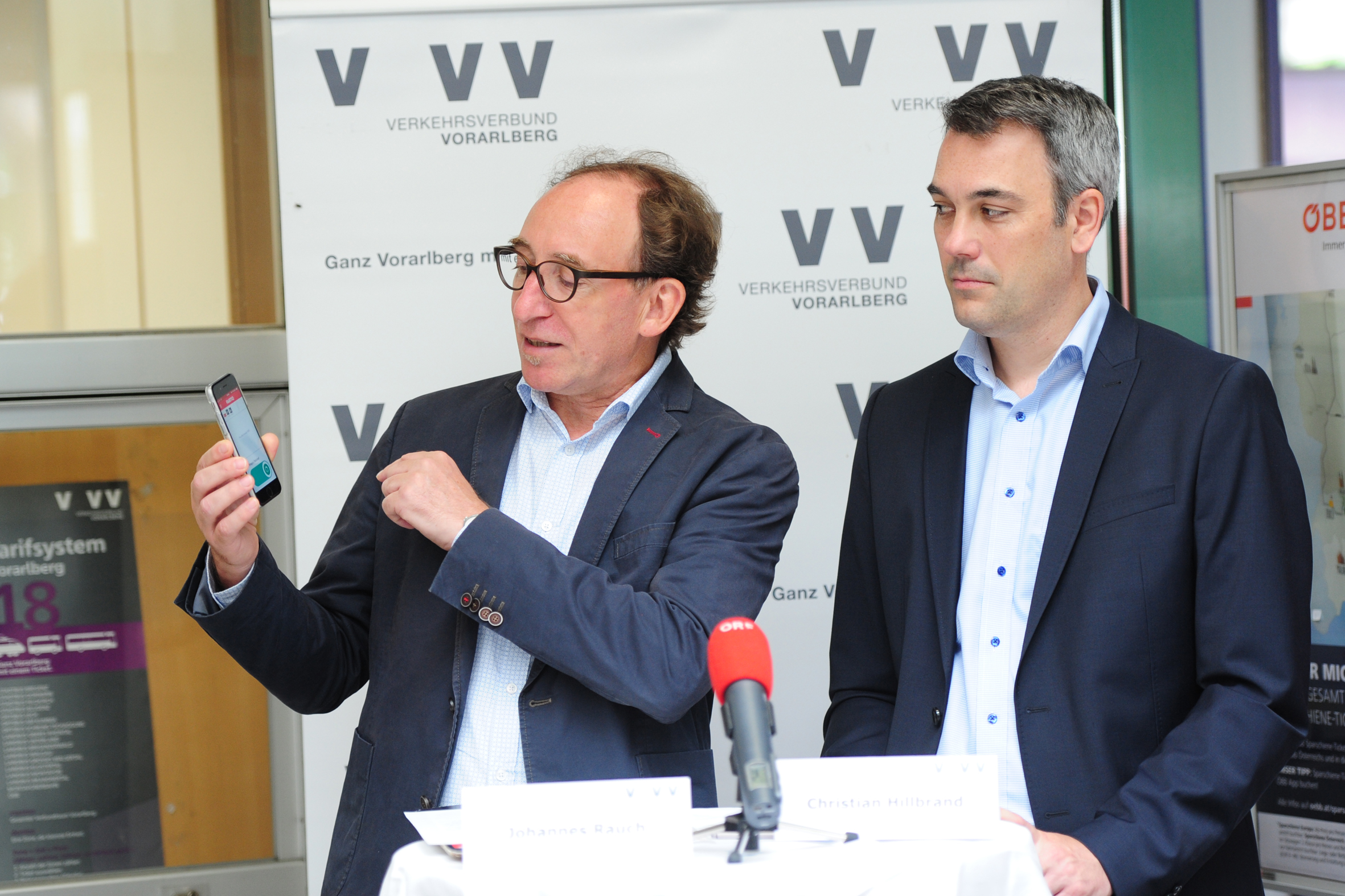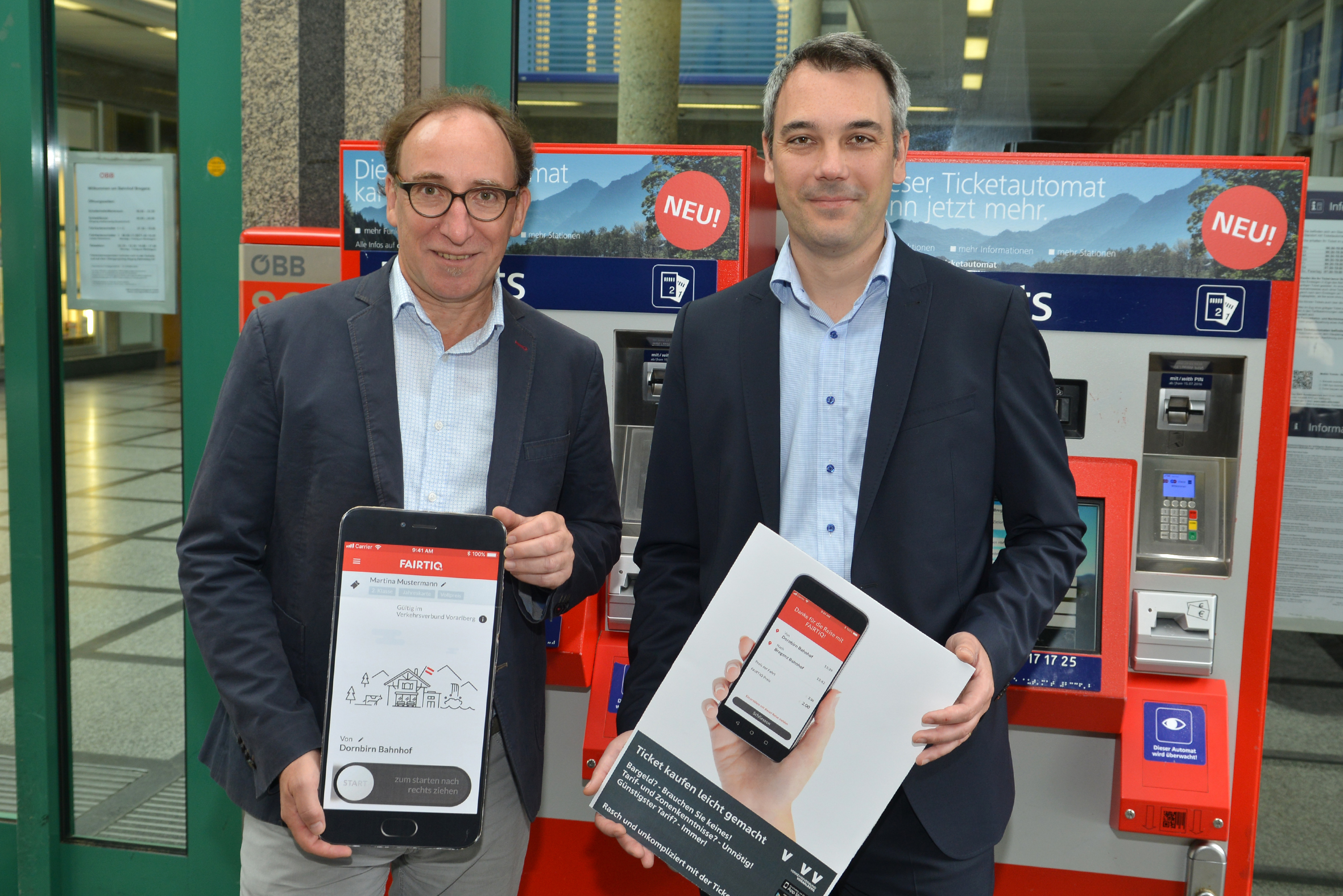 Mobilitätslandesrat Johannes Rauch und VVV-Geschäftsführer Christian Hillbrand stellten am Bahnhof Bregenz die neue Handy-App FAIRTIQ vor