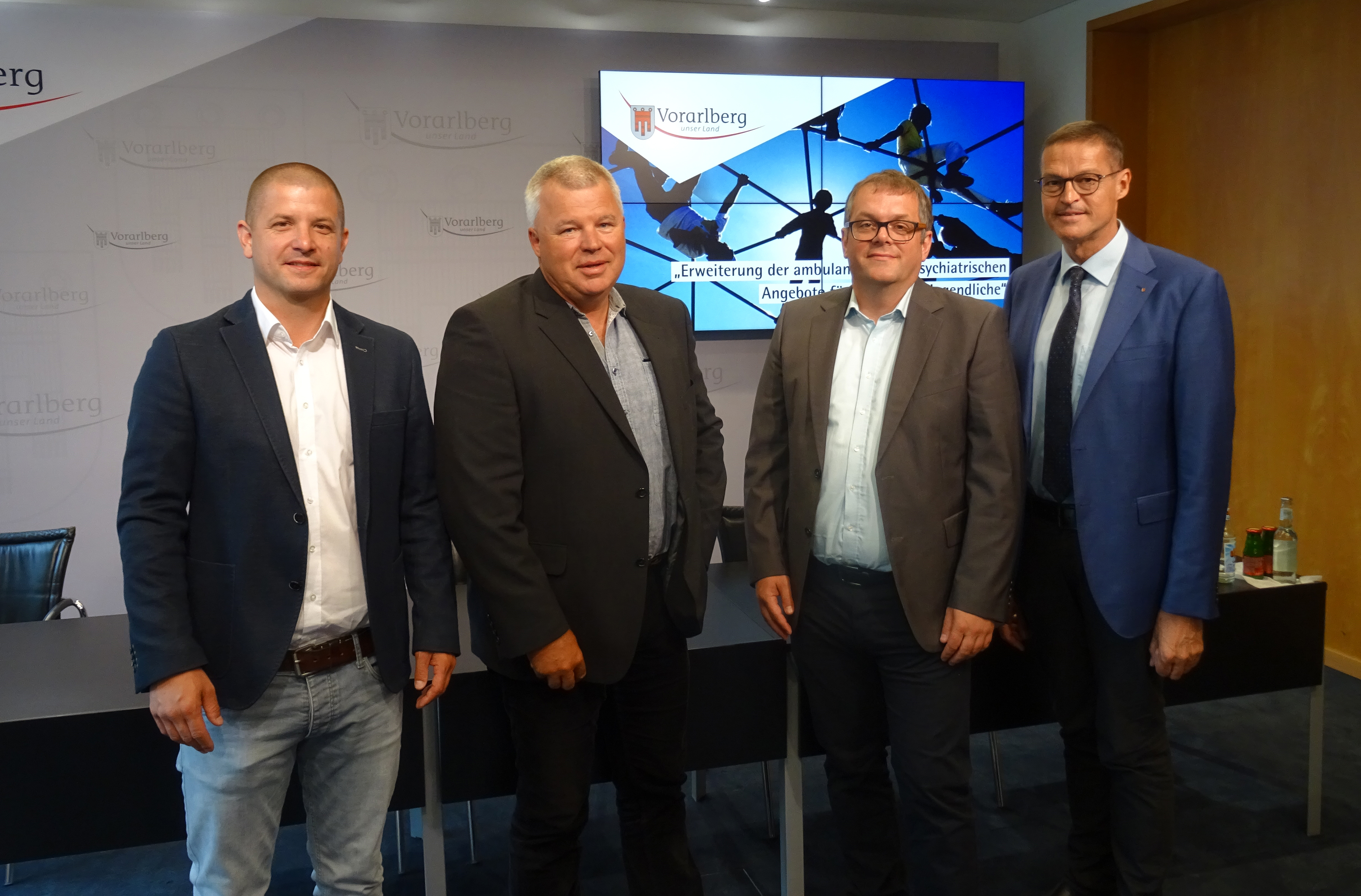 (v.l.) Martin Schumacher (pro mente), Wolfram Metzger (Facharzt für Kinder- und Jugendpsychiatrie), Psychiatriekoordinator Joachim Hagleitner, Landesrat Christian Bernhard