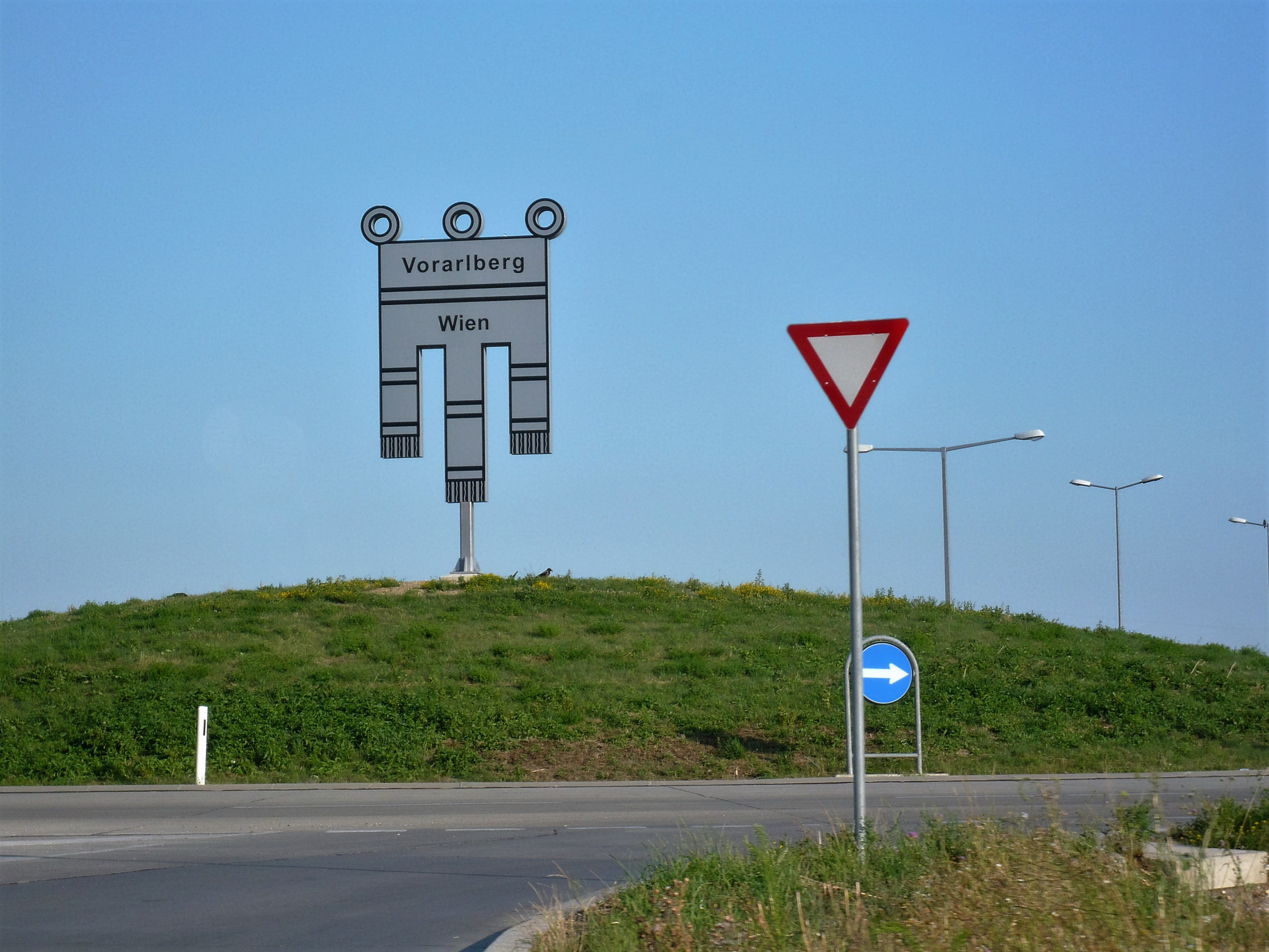 Das Vorarlbergwappen aus Chromstahl beim Kreisverkehr der Autobahnabfahrt "Vorarlberger Allee"