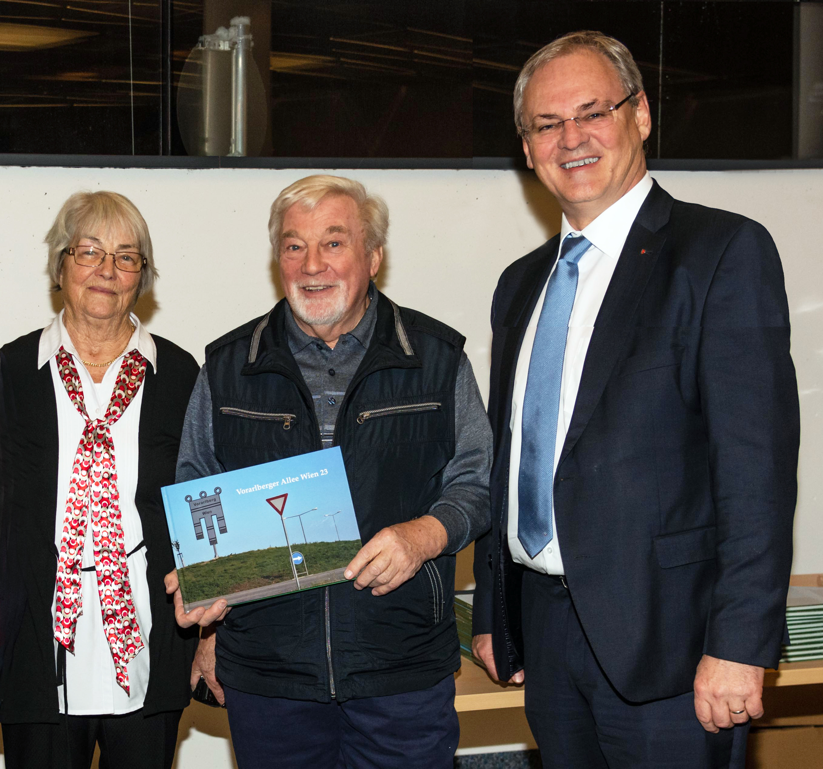 Schwarzach (VLK) – "Eine Erfolgsgeschichte über ein Stück Vorarlberg in Wien", lobte Landtagspräsident Sonderegger bei der gestrigen (Donnerstag, 10. Jänner) Buchpräsentation von "Vorarlberger Allee Wien 23" die Initiative von Autor und Mastermind Siegfried Hämmerle. Dessen neu erschienener Bildband beleuchtet die Entstehung der Vorarlberger Allee und des Vorarlberger Waldes im 23. Wiener Gemeindebezirk.