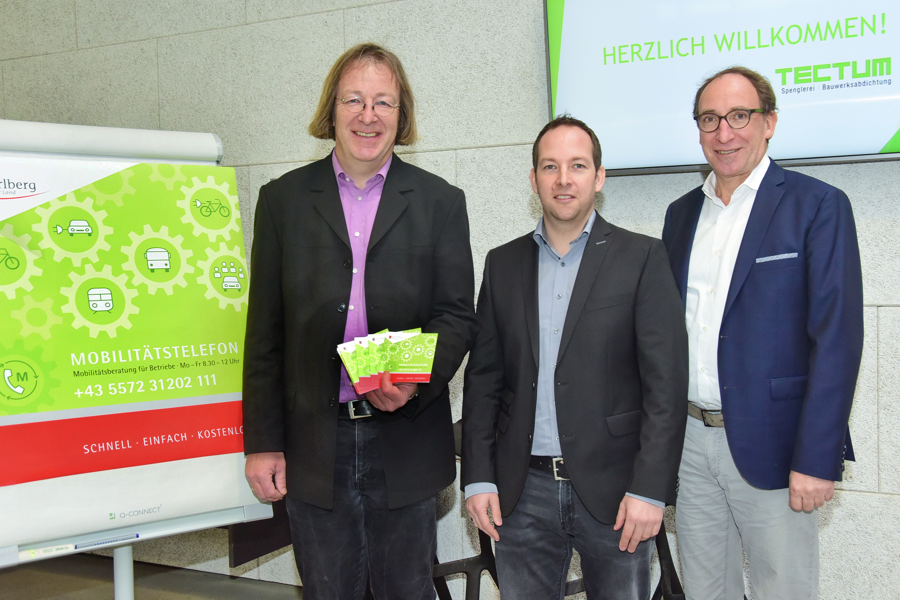 Die Hohenemser Bauspenglerei TECTUM, die im Flachdach und Fassadenbereich tätig ist, hat sich als Ökoprofit-Betrieb auch mit Mobilitätsfragen beschäftigt. Einer von vier Firmen-Pkw ist heute bereits ein Elektrofahrzeug. Bei Neuanschaffungen von Fahrzeugen wird heute bereits auf möglichst niedrige CO2-Werte geachtet. Mitarbeiterinnen und Mitarbeiter, die mit öffentlichem Verkehr und/oder Fahrrad zur Arbeit kommen, erhalten eine Jahreskarte für die öffentlichen Verkehrsmittel. „Da sich im Mobilitätssektor derzeit sehr viel tut, macht es Sinn, dass es einen Ansprechpartner gibt, mit dem man offene Fragen klären kann. Die Einrichtung eines Mobilitätstelefons für Betriebe ist hier sicher ein geeignetes Instrument für unkomplizierte und schnelle Hilfe“, zeigte sich TECTUM-Geschäftsführer Udo Waibel überzeugt.