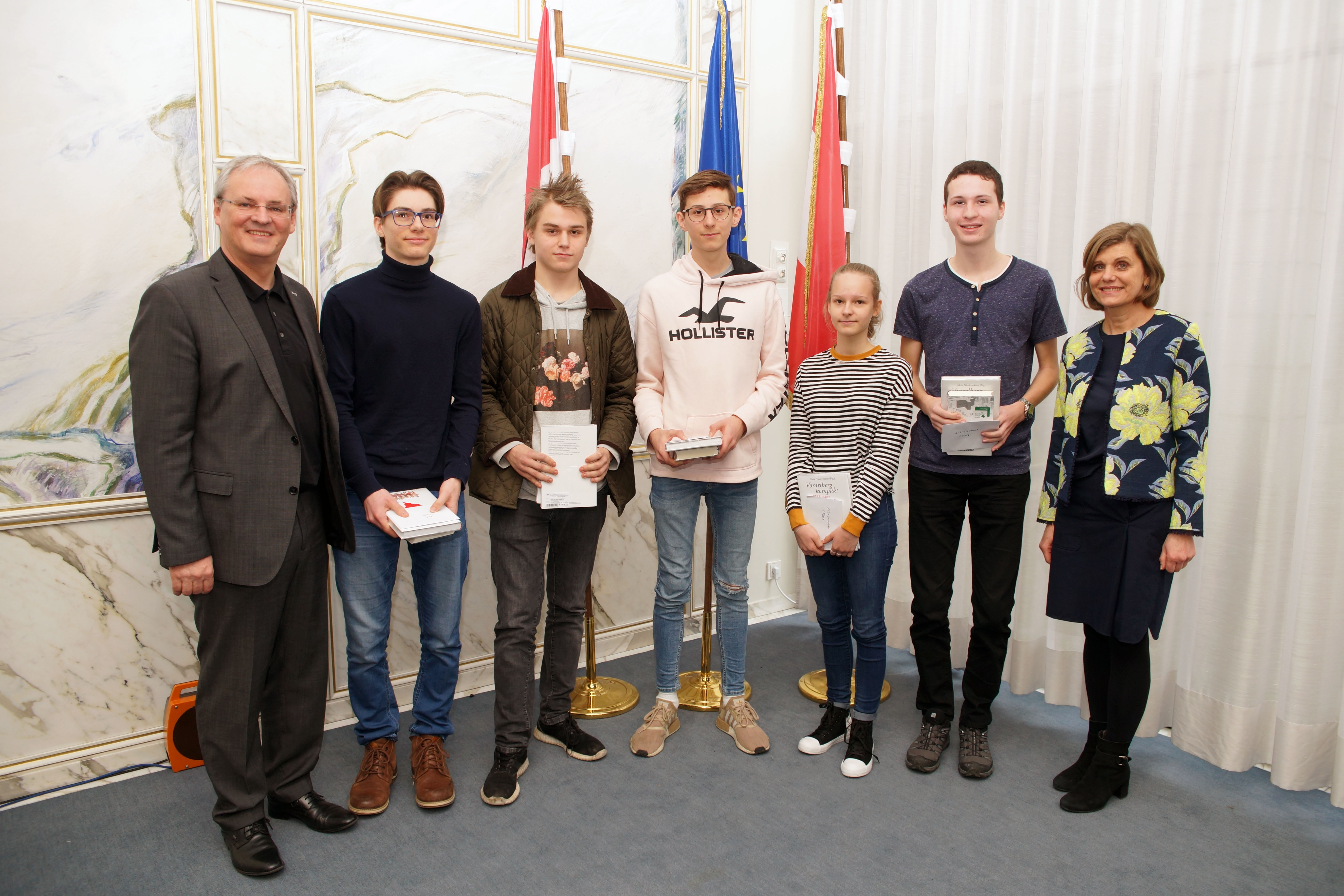 Landtagspräsident Harald Sonderegger und Bildungslandesrätin Barbara Schöbi-Fink mit den Erstplatzieren des EuropaQuiz.