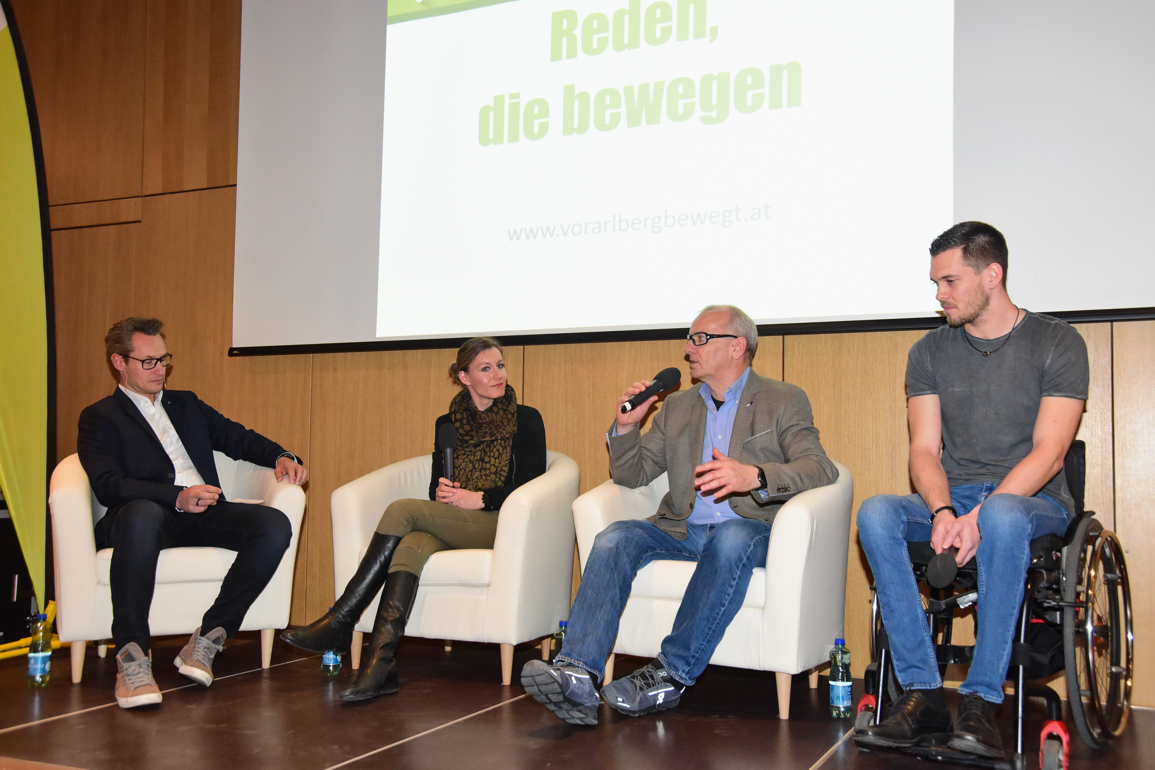 Altach (VLK) – Mit einer Veranstaltung zum Thema "Geschichten aus dem Leben – Vorarlberger Sportlerinnen und Sportler mit Handicap" ging am Donnerstag, 28. März, in Altach die Vorarlberg >>bewegt-Reihe "Reden die bewegen" zu Ende. Die Monoskifahrerin Heike Eder, der ehemalige Präsident des Vorarlberger Versehrtensportverbandes Christian Häusle und der Leichtathlet Manuel Riedmann, alle nach Unfällen im Rollstuhl, berichteten über ihr Schicksal, ihren persönlichen Umgang damit und ihre sportliche Aktivität trotz Handicap.