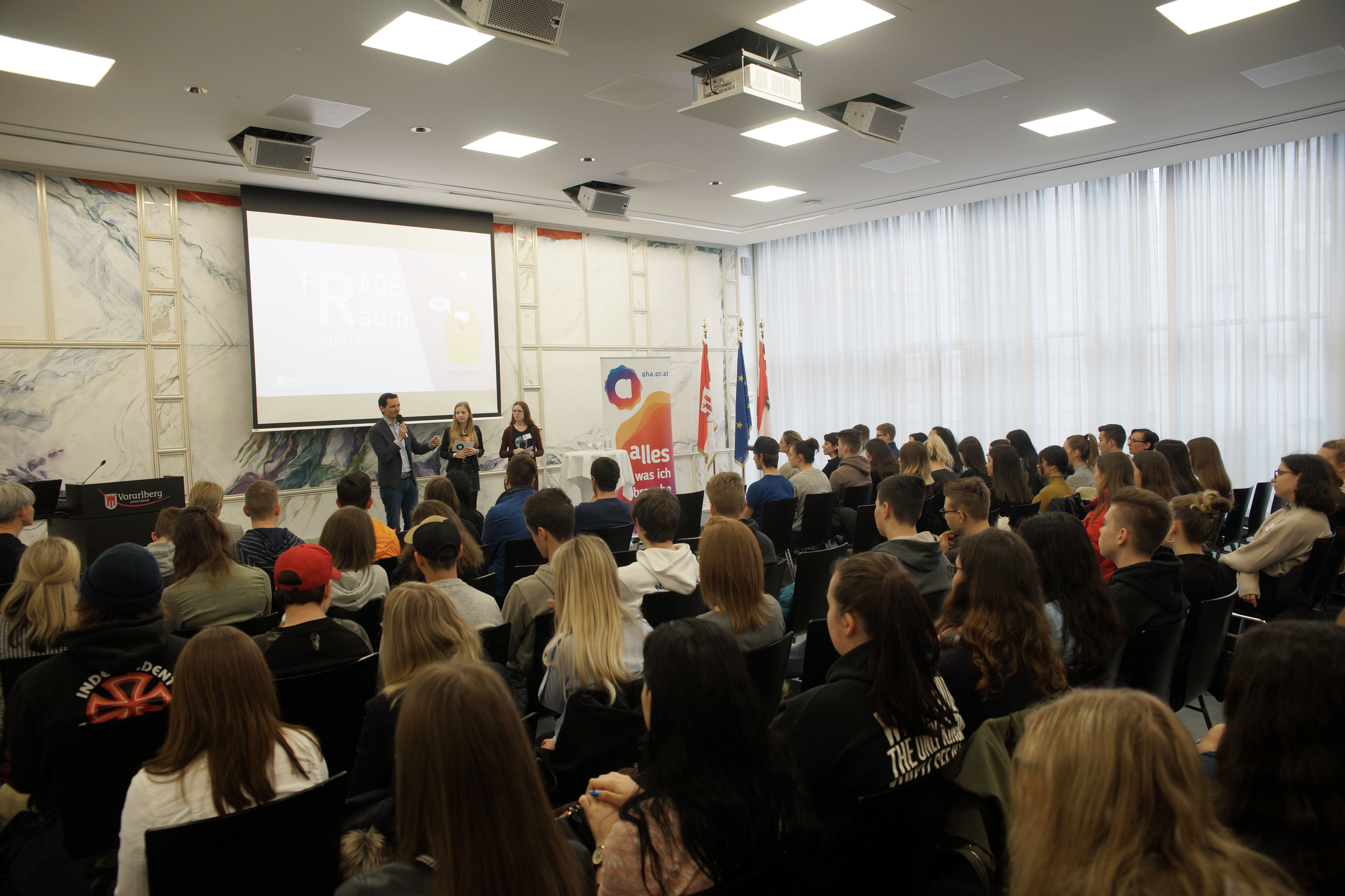 Mit Unterstützung von erwachsenen Moderatorinnen und Moderatoren erarbeiteten die Jugendlichen in den fünf „FrageRäumen“ im Bregenzer Landhaus konkrete Fragen. Jeder dieser Räume wurde danach von je einer Politikerin bzw. einem Politiker der fünf im Landtag vertretenen Fraktionen besucht: Monika Vonier (VP), Christof Bitschi (FPÖ), KO Adi Gross (Die Grünen), KO Michael Ritsch (SPÖ) und Daniel Matt (NEOS) standen den Jugendlichen abwechselnd Rede und Antwort, bis sie die Fragen aller fünf Gruppen beantwortet hatten. So erfuhren die Lehrlinge mehr über Politik in Vorarlberg, die Positionen der jeweiligen Partei und über die Tätigkeit als PolitikerIn an sich. Am Ende der Veranstaltung kamen alle Gruppen wieder zusammen. Besprochen wurde dabei die Zielerreichung der Veranstaltung – das „Informiertsein über die Landespolitik“. Außerdem bestand auch noch die Möglichkeit, persönliche Fragen an die Vertreterin und die Vertreter der Fraktionen zu richten.