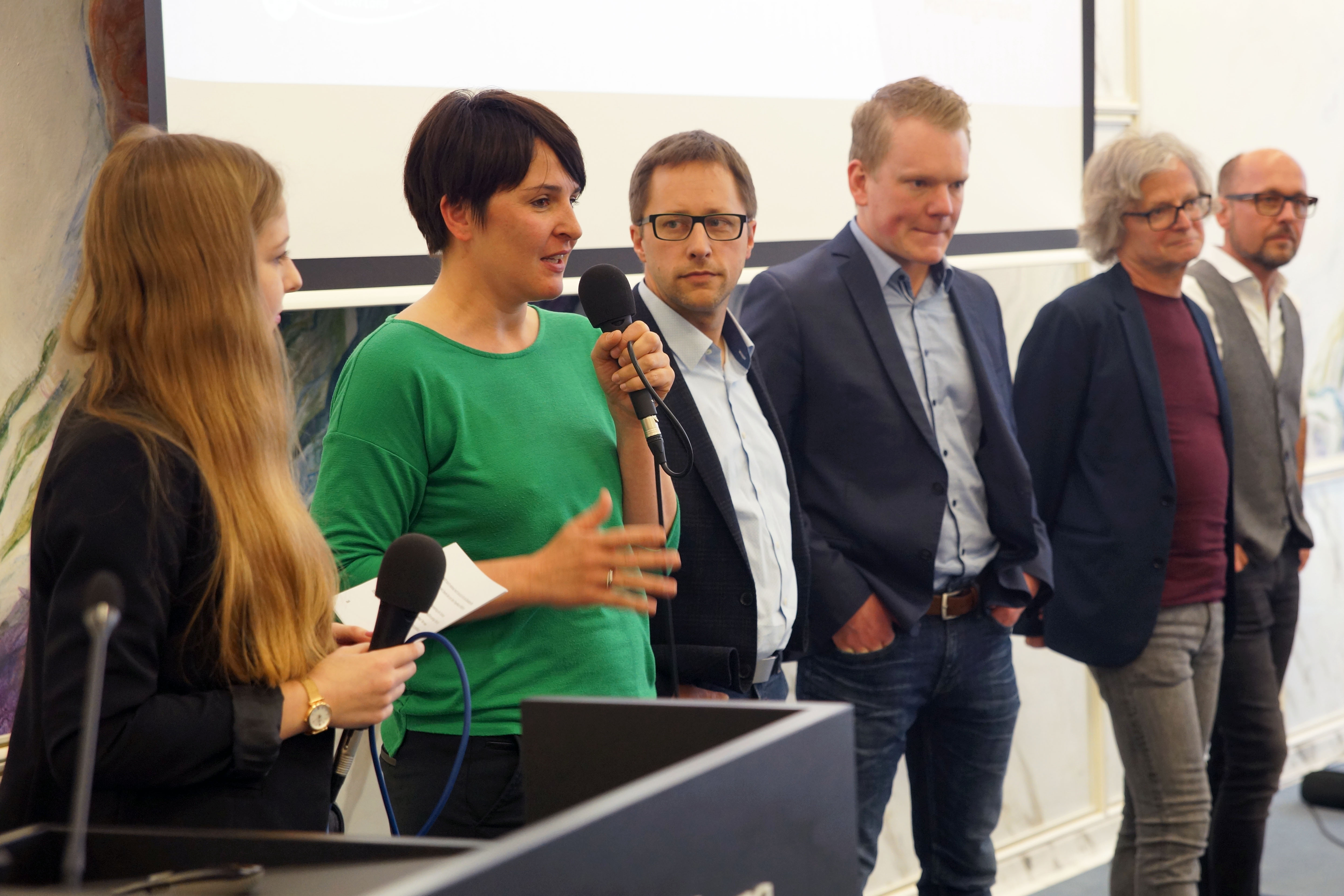Organisatorin Judith Thurnher, die Moderatorinnen Carolin Mathies und Sandra Kraxner, Landtagsabgeordneter Julian Fässler sowie Landtagsdirektorin Borghild Goldgruber-Reiner.