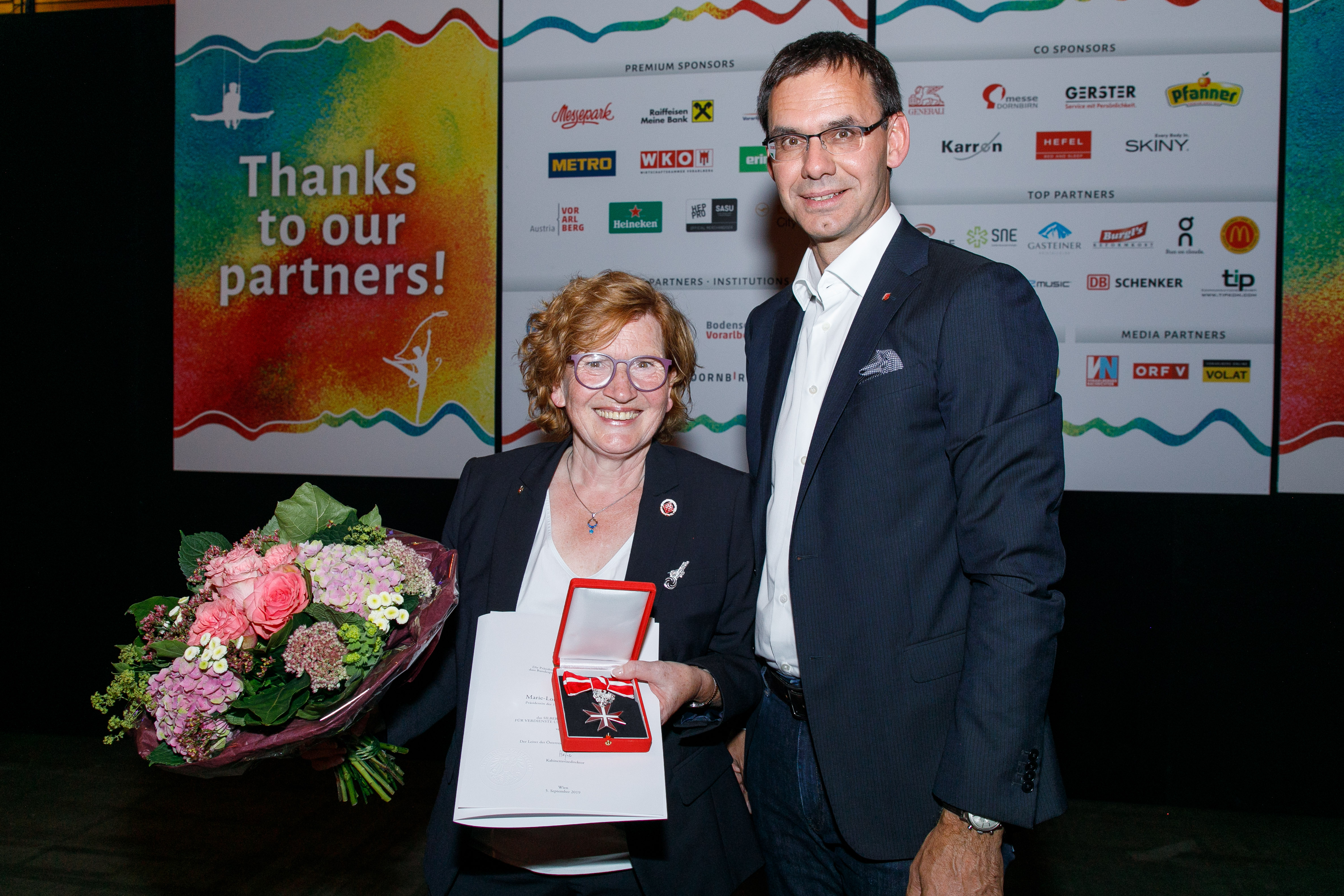 „Eine Veranstaltung in dieser Größenordnung so erfolgreich zu bewältigen, ist eine organisatorische und logistische Meisterleistung“, so der Landeshauptmann. Im Rahmen des Danke-Abends wurden die beiden Hauptorganisatoren OK-Präsidentin Marie-Louise Hinterauer und Gymnaestrada-Geschäftsführer Erwin Reis mit dem „Silbernen Ehrenzeichen für Verdienste um die Republik Österreich“ ausgezeichnet. Nach dem „Große Verdienstzeichen des Landes Vorarlberg“ – welches beide bereits im Jahr 2007 für die Organisation der ersten Gymnaestrada in Vorarlberg erhalten haben – ist dies nun auch eine verdiente Anerkennung des Bundes, führte Wallner weiter aus. „Die langjährige Vorbereitungs- und Planungsphase hat sich auf jeden Fall gelohnt“, fand der Landeshauptmann anerkennende Worte für die professionelle und perfekte Organisation durch das engagierte OK-Team um Hinterauer und Reis.