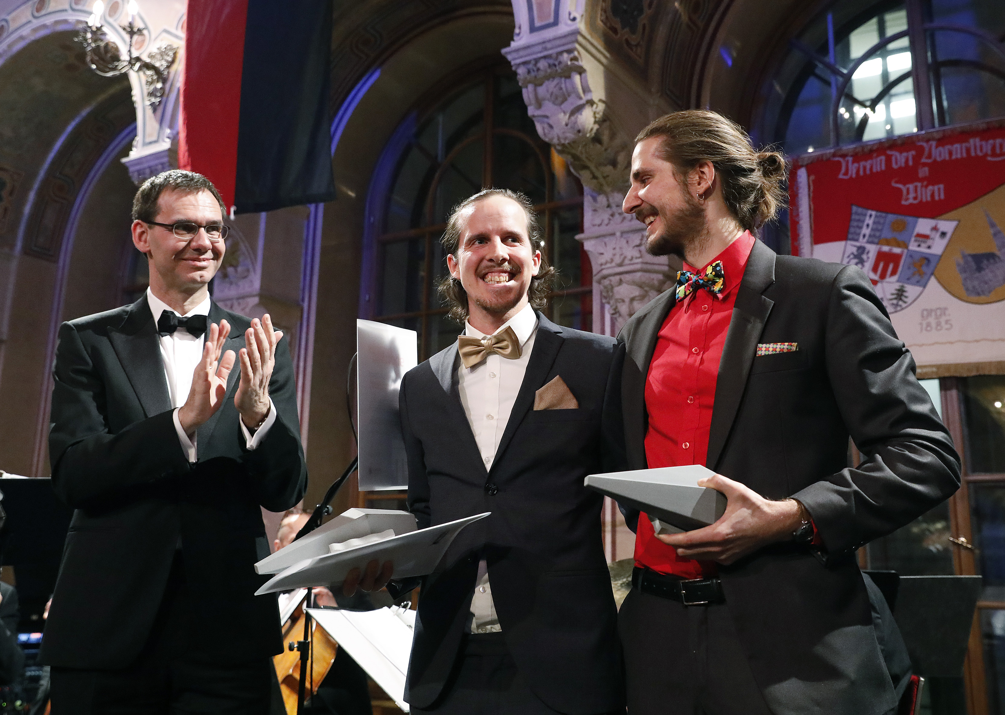 Wien (VLK) – Beim traditionellen Ball der Vorarlberger in der Bundeshauptstadt hat Landeshauptmann Markus Wallner am Samstagabend (25. Jänner) die Initiatoren des Sozialprojekts „Open Piano for Refugees“, Udo Felizeter und Nico Schwendinger, als „Vorarlberger des Jahres z'Wian“ 2019 geehrt. Die beiden Preisträger waren im Vorfeld von einer fünfköpfigen Jury einstimmig ausgewählt und vorgeschlagen worden. Neben Ehrenurkunden überreichte Landeshauptmann Wallner eine Trophäe, die eigens vom in Wien lebenden und arbeitenden Vorarlberger Künstler Marbod Fritsch angefertigt wurde.
