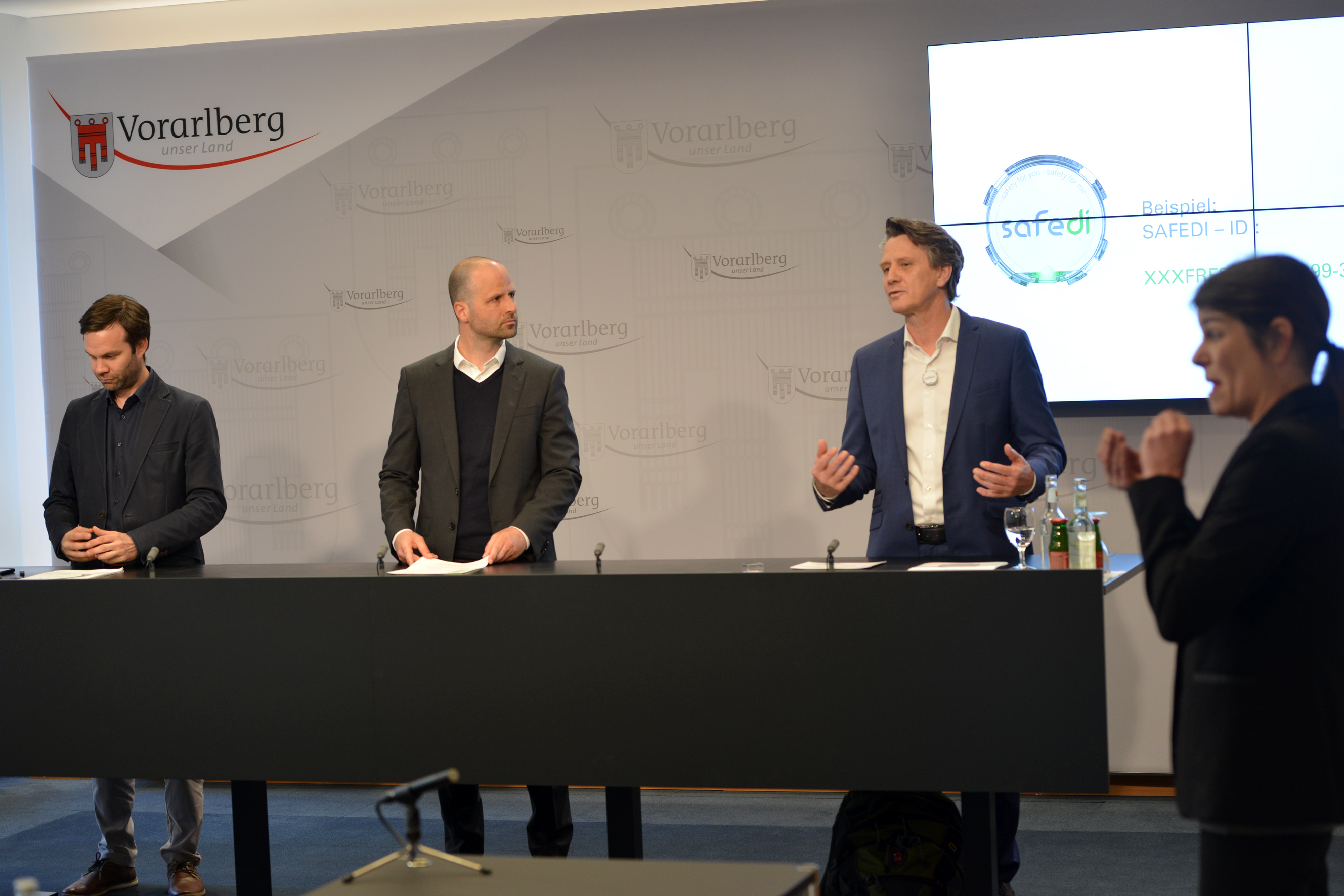 Bregenz (VLK) – Besonders in Zeiten von Virus-bedingten Pandemien ist es wichtig, den erforderlichen Sicherheitsabstand einzuhalten, um das Infektionsrisiko durch persönlichen Kontakt bzw. Tröpfcheninfektion möglichst gering zu halten und so eine Weiterverbreitung der Krankheit zu unterbinden. Die Vorarlberger Firma Safedi Distance Control hat dazu mit „SAFEDI“ einen neuartigen Abstandswarner entwickelt. „Diese Innovation ‚Made in Vorarlberg‘ startet ab 15. April als Feldversuch in mehreren heimischen Unternehmen und wird vom Land gefördert“, informierte Wirtschaftslandesrat Marco Tittler im heutigen (Freitag) Pressegespräch. „Das System ist einfach und robust in der Anwendung“, sagte Christian Beer, Inhaber und Geschäftsführer der Heron-Gruppe.