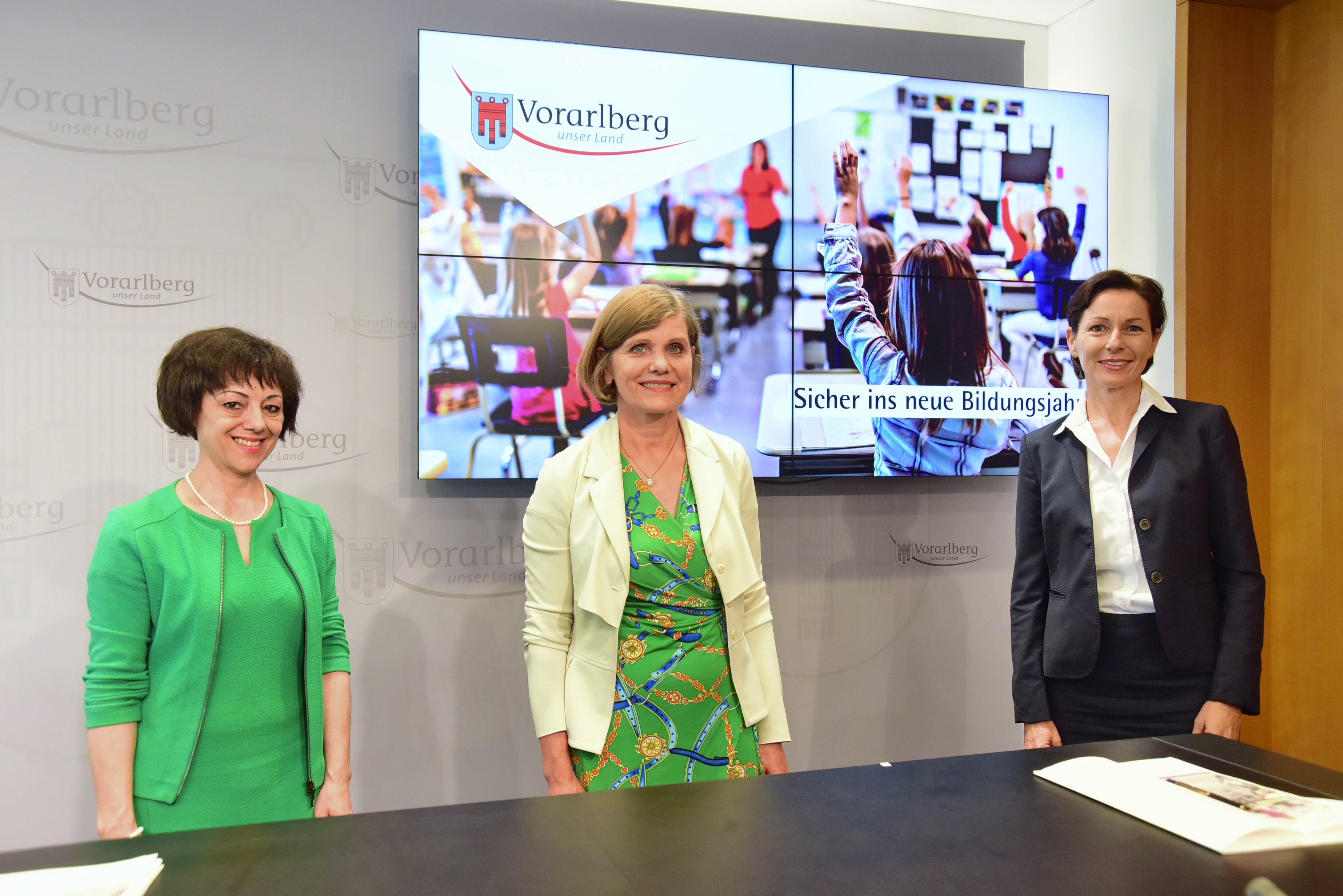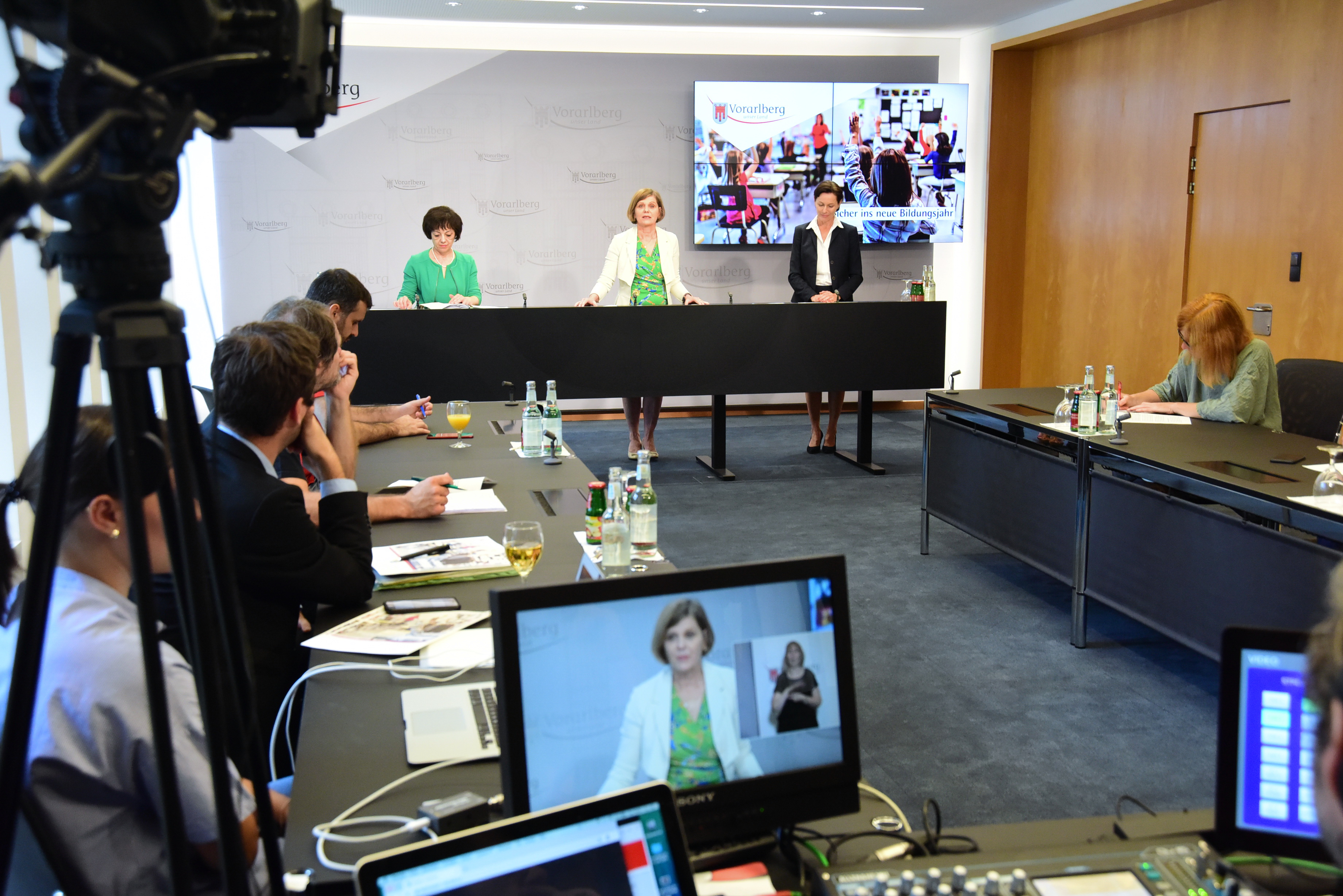 Landesstatthalterin Schöbi-Fink und Landesrätin Rüscher informierten zusammen mit Bildungsdirektorin Evelyn Marte-Stefani über die Ergebnisse des Elementarpädagogik- und Schulgipfels