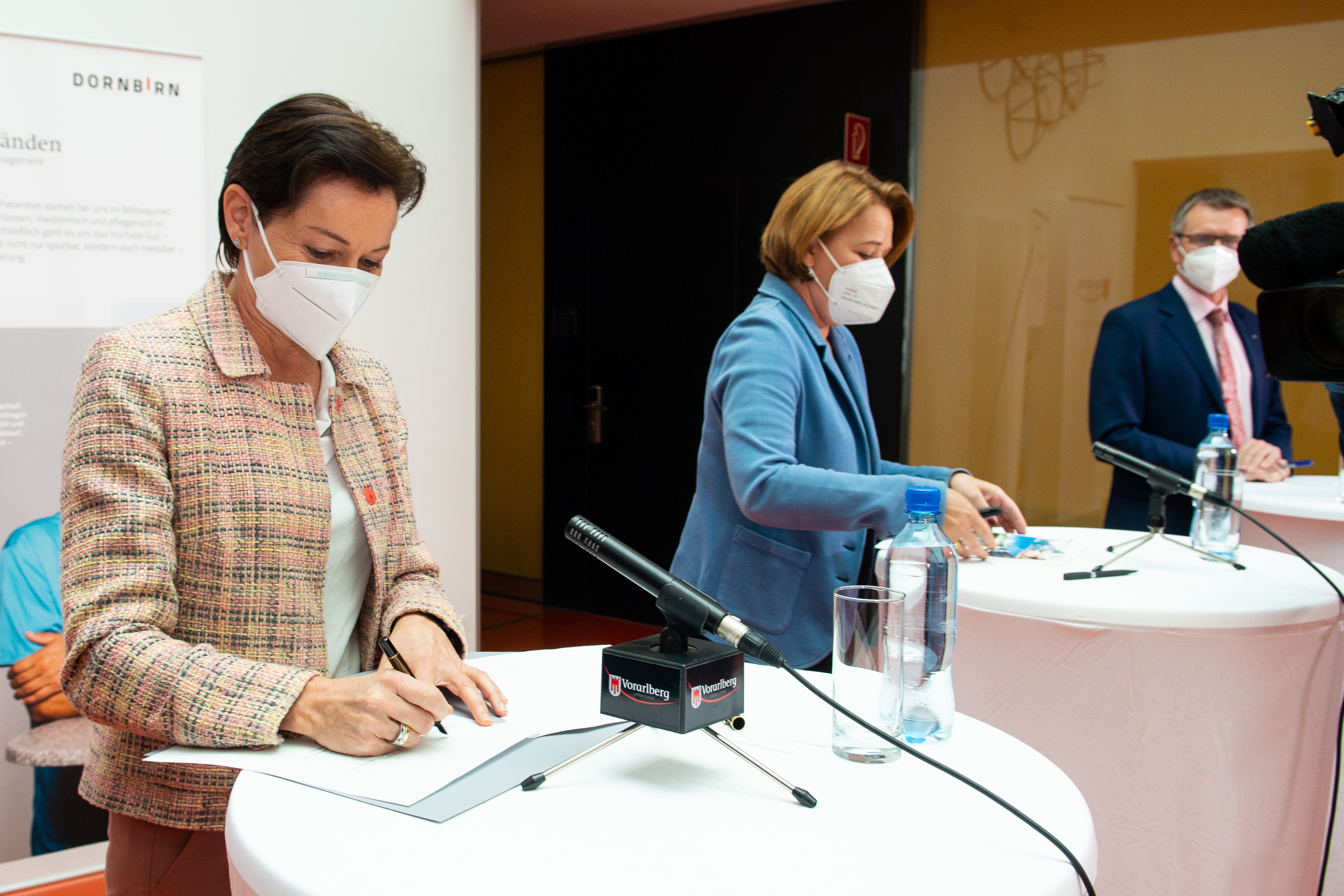Gemeinsam mit den KHBG-Geschäftführern Gerald Fleisch und Peter Fraunberger sowie dem Verwaltungsdirektor des Krankenhauses Dornbirn, Helmut Fornetran, unterzeichneten Landesrätin Martina Rüscher und Bürgermeisterin Andrea Kaufmann die Absichtserklärung