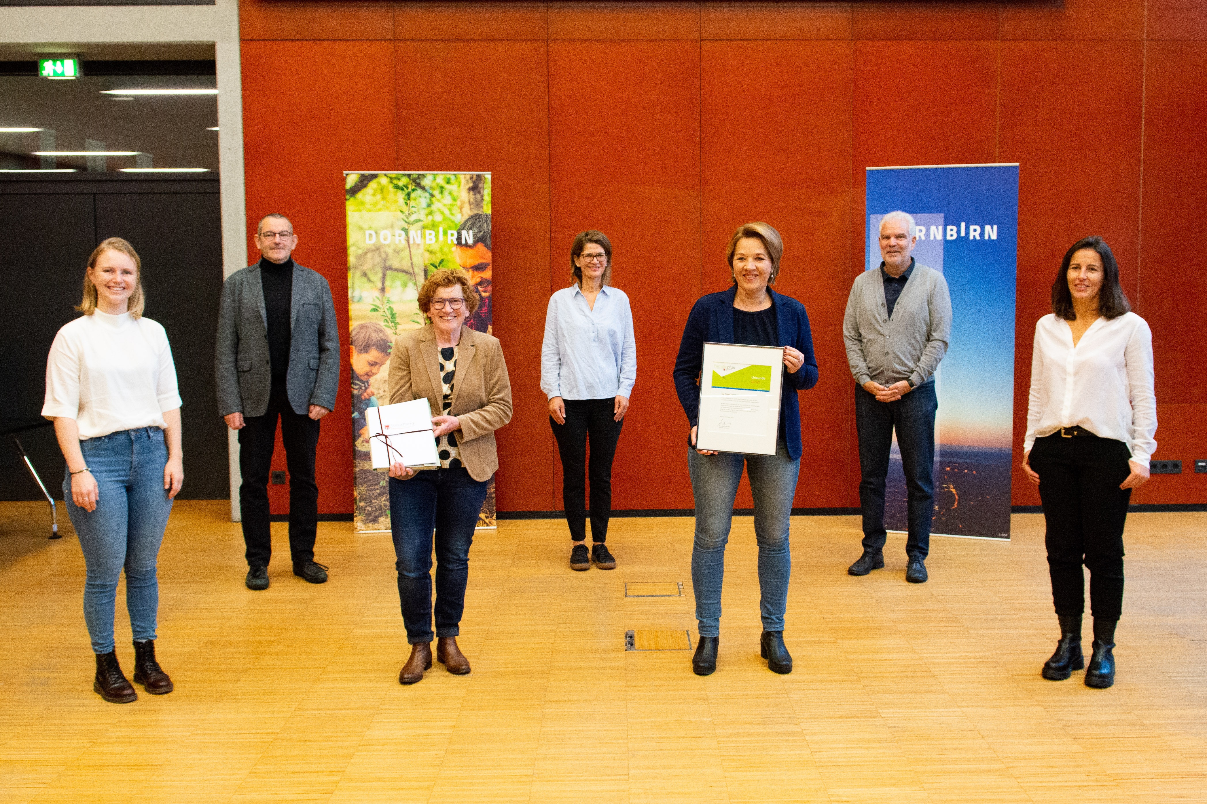 Gütesiegel-Überreichung an die Stadt Dornbirn (im Bild v.l.: Ruth Allgäuer, Matthias Mathis, Marie-Louise Hinterauer, Heike Mennel-Kopf, Bürgermeisterin Andrea Kaufmann, Thomas Müller (Fachbereichsleiter Jugend und Familie, Land Vorarlberg) und Monika Thaler)