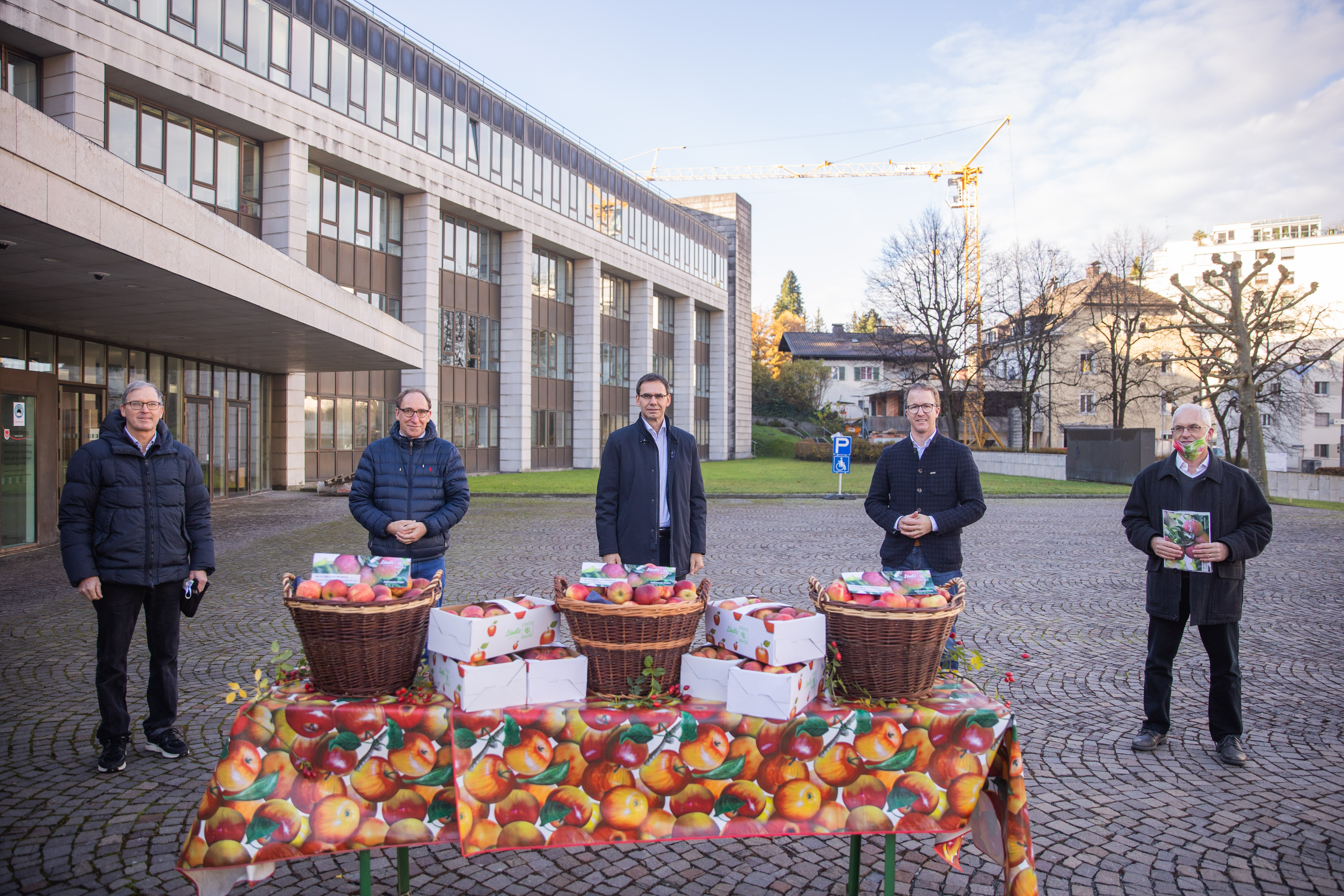 Eine Abordnung von Vorarlberger Obstbauern fand sich zum bevorstehenden Tag des Apfels (Freitag, 13. November 2020) vor dem Landhaus ein (im Bild v.l.: Jens Blum, Obmann der ARGE Erwerbsobstbauern, Landesrat Johannes Rauch, Landeshauptmann Markus Wallner, Landesrat Christian Gantner und Geschäftsführer der ARGE Erwerbsobstbauern Ulrich Höfert)