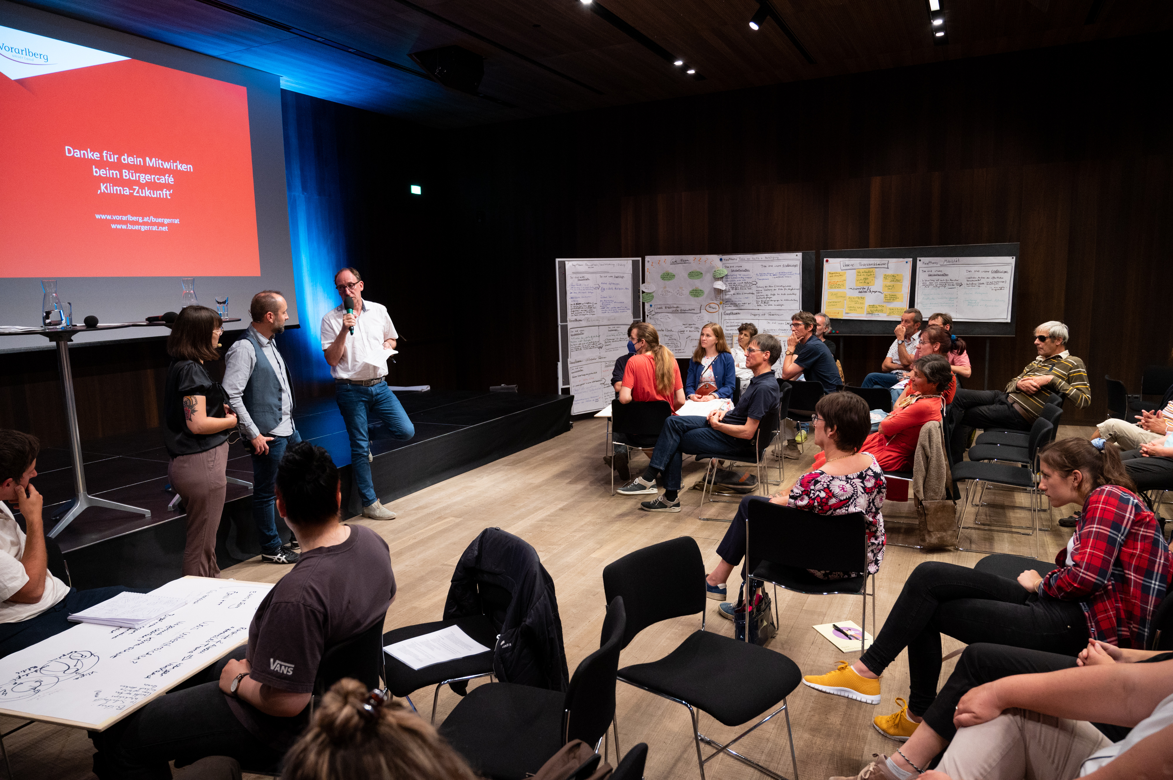 Bregenz (VLK) – Im Rahmen eines sogenannten Bürgercafés am Dienstagabend (6. Juli), im vorarlberg museum wurde der interessierten Bevölkerung die Möglichkeit geboten, die Ergebnisse des Bürgerinnen- und Bürgerrates vom vergangenen Wochenende zu ergänzen und zu vertiefen. Landeshauptmann Markus Wallner und Klimaschutzlandesrat Johannes Rauch informierten sich aus erster Hand, welche Themen den Teilnehmer:innen besonders am Herzen lag. Die Sorge um die Klima-Zukunft und die Erhaltung des Lebensraumes für künftige Generationen standen dabei im Mittelpunkt.