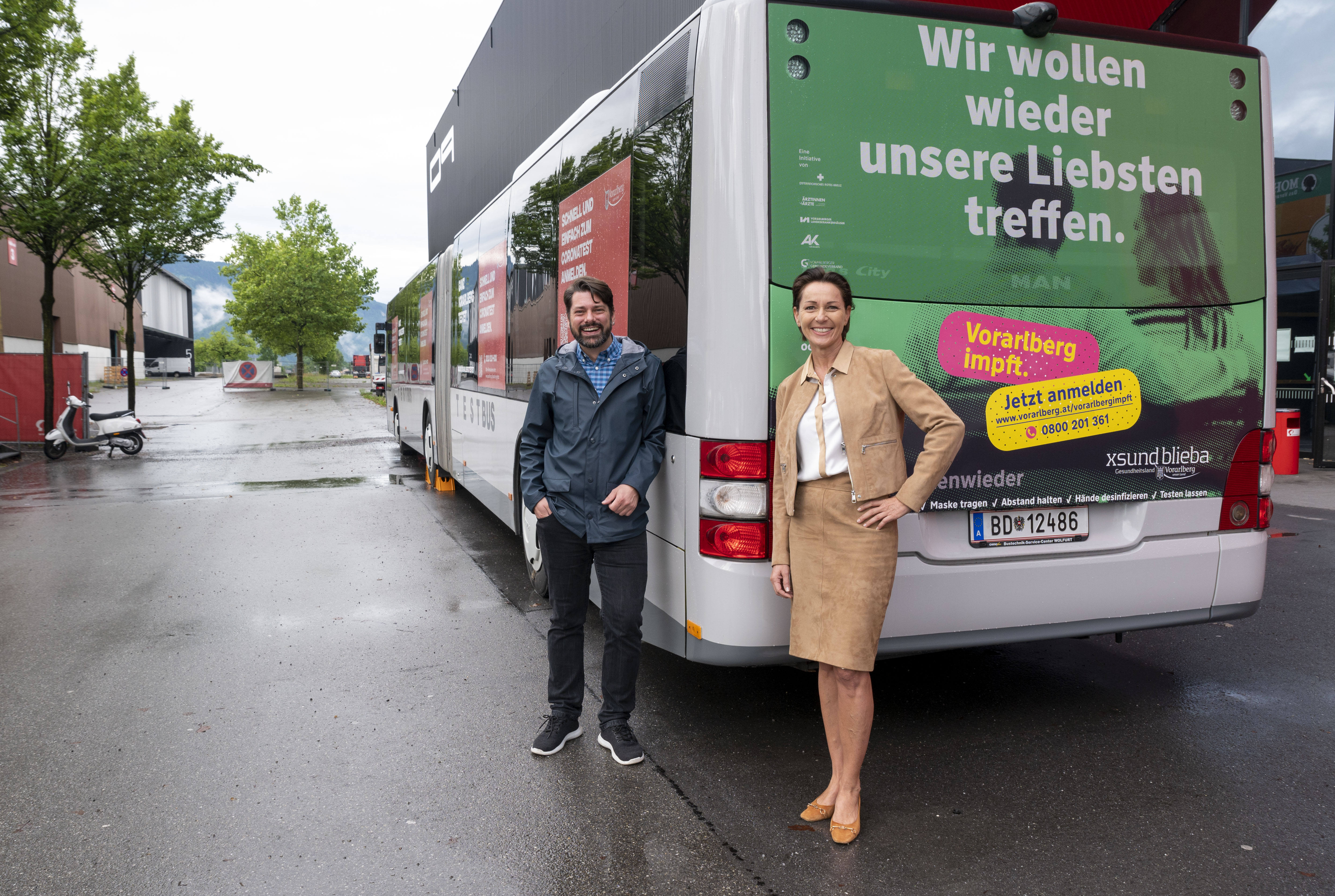 Am Sonntagvormittag (18. Juli 2021) steht der mobile Impfbus des Landes beim poolbar-FESTIVAL in Feldkirch von 10:00 Uhr bis 12:00 Uhr erstmalig im Einsatz (im Bild v.l.: Landes-Impfkoordinator Sebastian Wöß mit Gesundheitslandesrätin Martina Rüscher)
