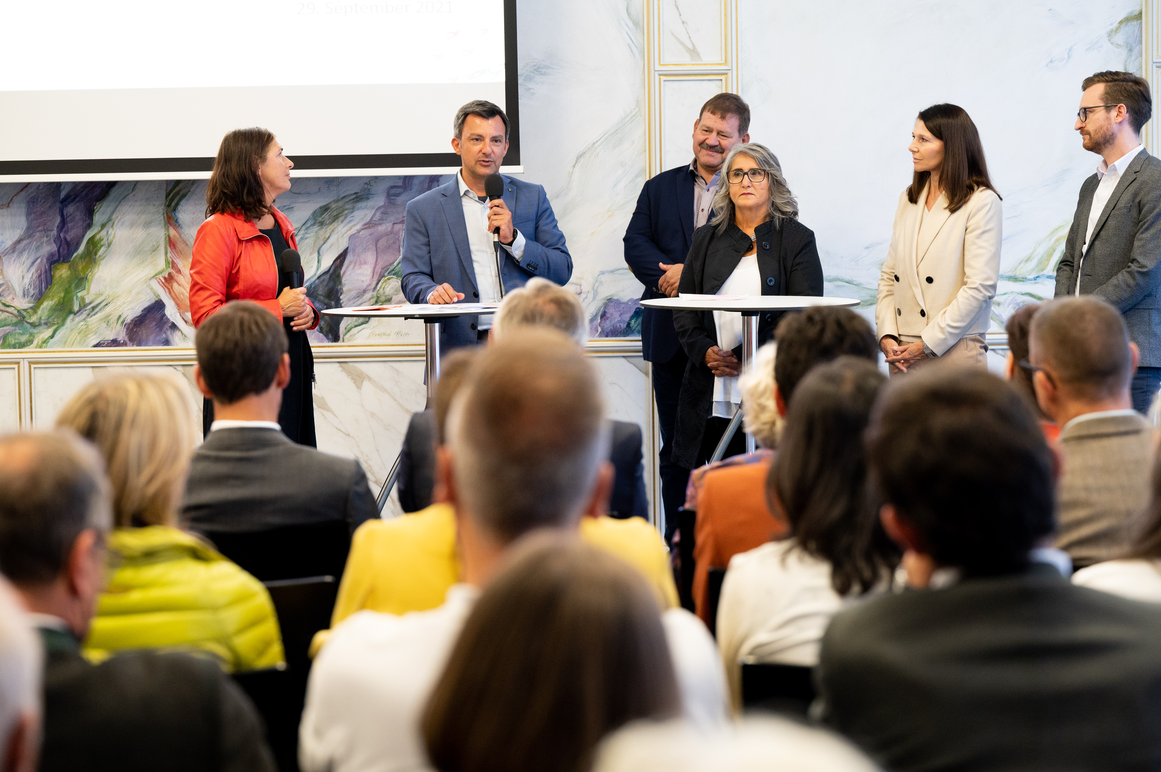Bregenz (VLK) – Im Montfortsaal konnte am Mittwoch (29. September) das seit dem Frühjahr 2019 in einem breiten und partizipativen Prozess ausgearbeitete Leitbild für ein inklusives Vorarlberg der Öffentlichkeit vorgestellt werden. Landtagspräsident Harald Sonderegger, Landeshauptmann Markus Wallner und Gesundheitslandesrätin Martina Rüscher bedankten sich gemeinsam mit Gemeindeverbandspräsidentin Bürgermeisterin Andrea Kaufmann und den Inklusionssprecher:innen der im Landtag vertretenen Fraktionen bei allen Akteur:innen, die an der Leitbilderstellung engagiert mitgewirkt haben. „Wenn es jetzt an die Umsetzung geht, ist erneut die Mitwirkung möglichst vieler Menschen gefragt“, hielt Wallner zum Auftakt fest.