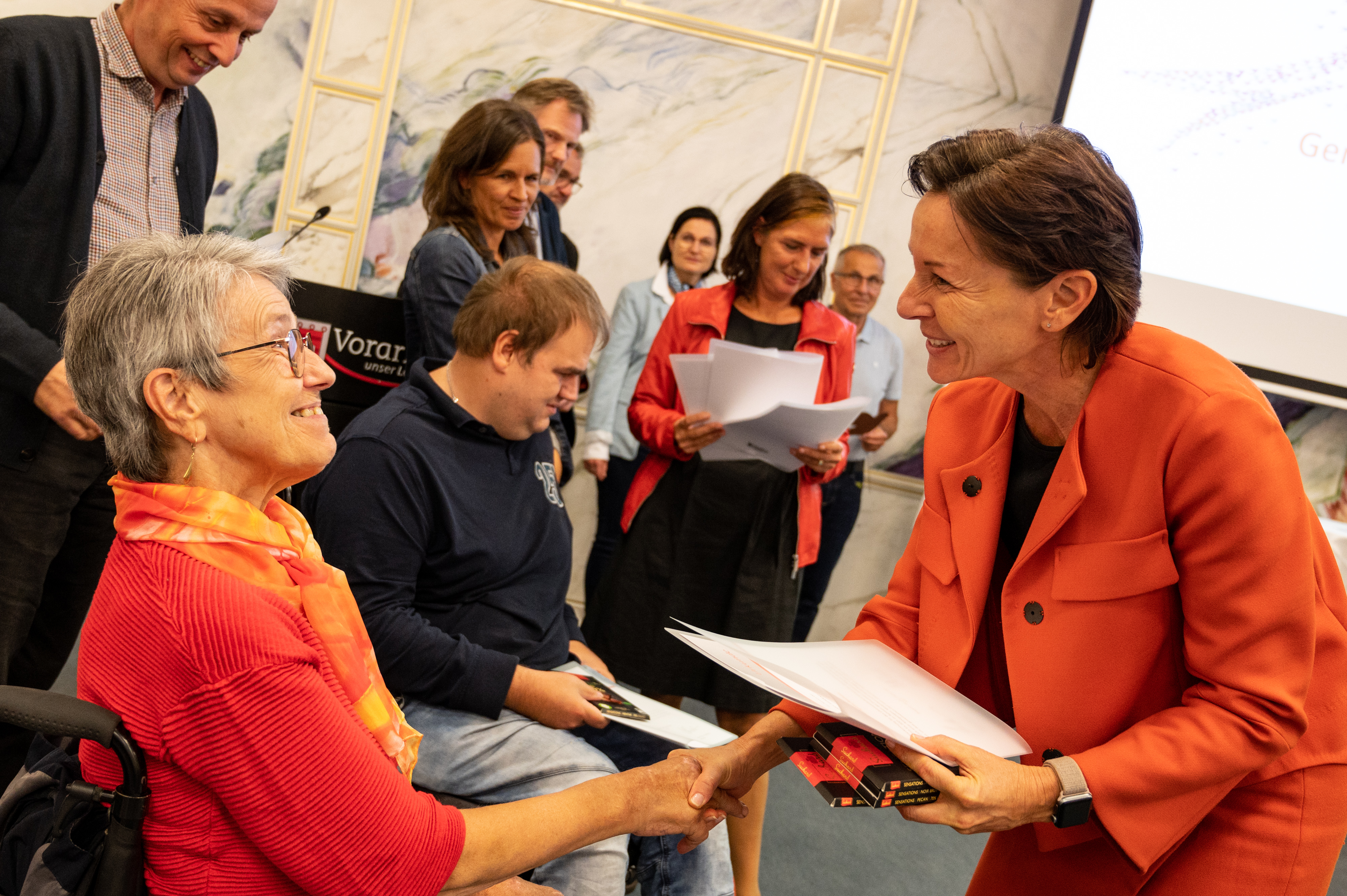 Auf die hohe Bürgerbeteiligung während der Leitbild-Entwicklung und -Ausarbeitung verwies die ressortzuständige Gesundheitslandesrätin. Rund 300 Menschen mit unterschiedlichen Hintergründen und aus verschiedensten Tätigkeitsfeldern, darunter auch viele Betroffene und Angehörige, haben sich im Rahmen von Veranstaltungen oder Arbeitsgruppen aktiv in den Prozess eingebracht. Es sei gelungen, die Stimmen und Erfahrungswelten sehr vieler Menschen einzubeziehen, bilanzierte Rüscher zufrieden: „Als Ergebnis herausgekommen ist ein kraftvolles, weil bereichsübergreifendes Leitbild für ein inklusives Vorarlberg“. Federführend begleitet wurde der Leitbild-Prozess vom Fachbereich Chancengleichheit unter der Leitung von Elisabeth Tschann. Mit viel Partizipationserfahrung und Moderations-Know-how leistete das Büro für Freiwilliges Engagement und Beteiligung (FEB) wichtige Unterstützung.
