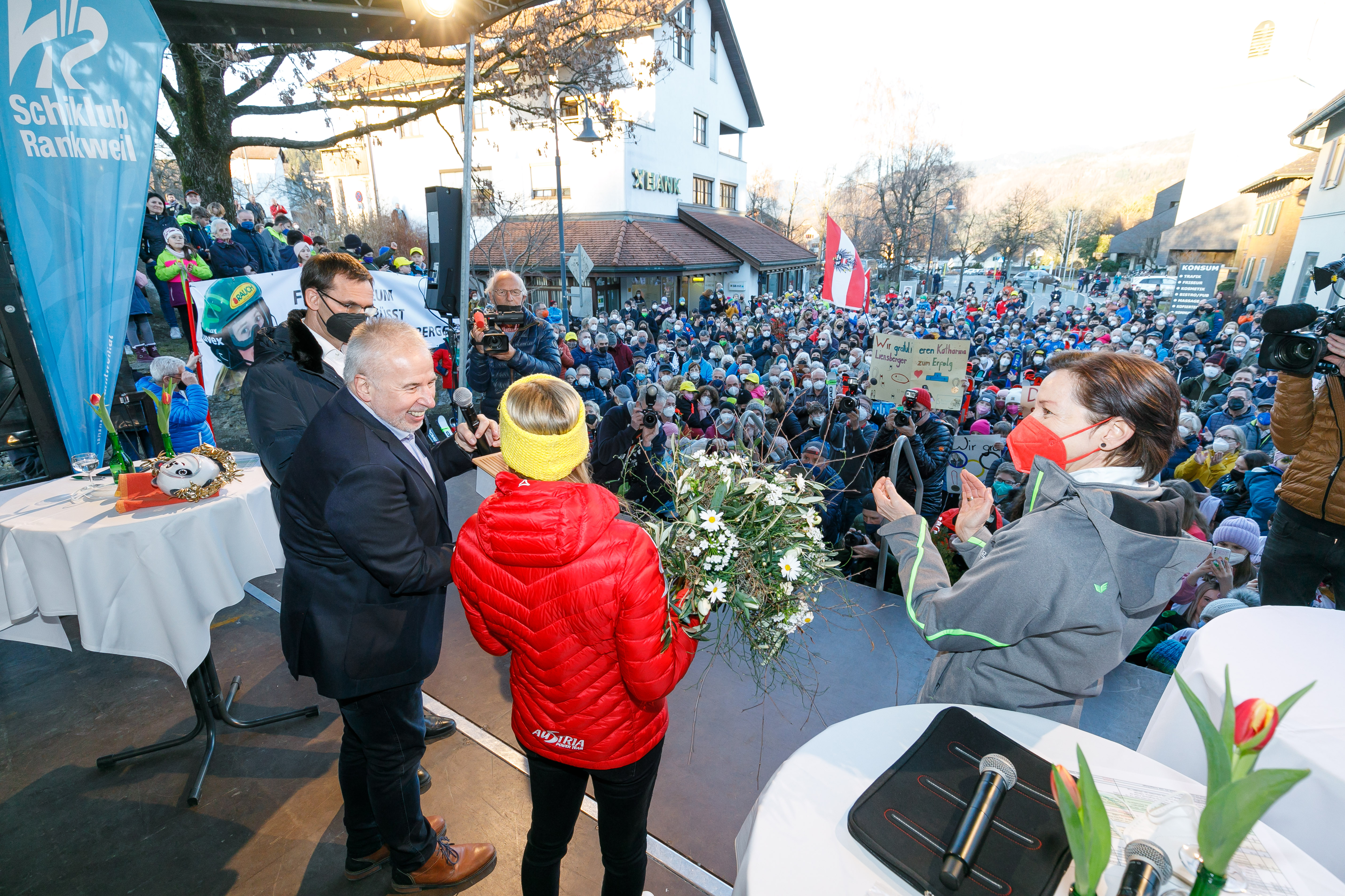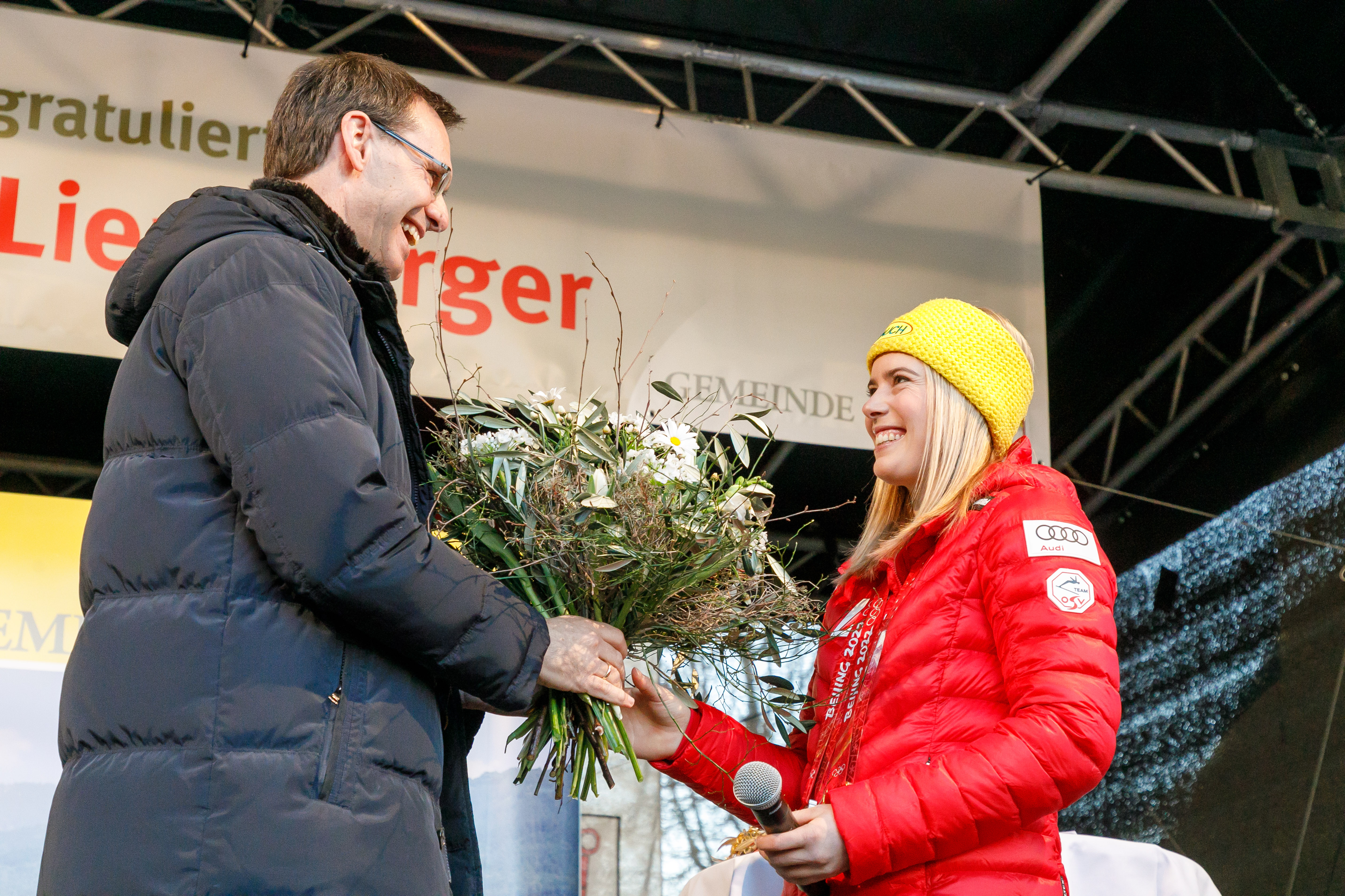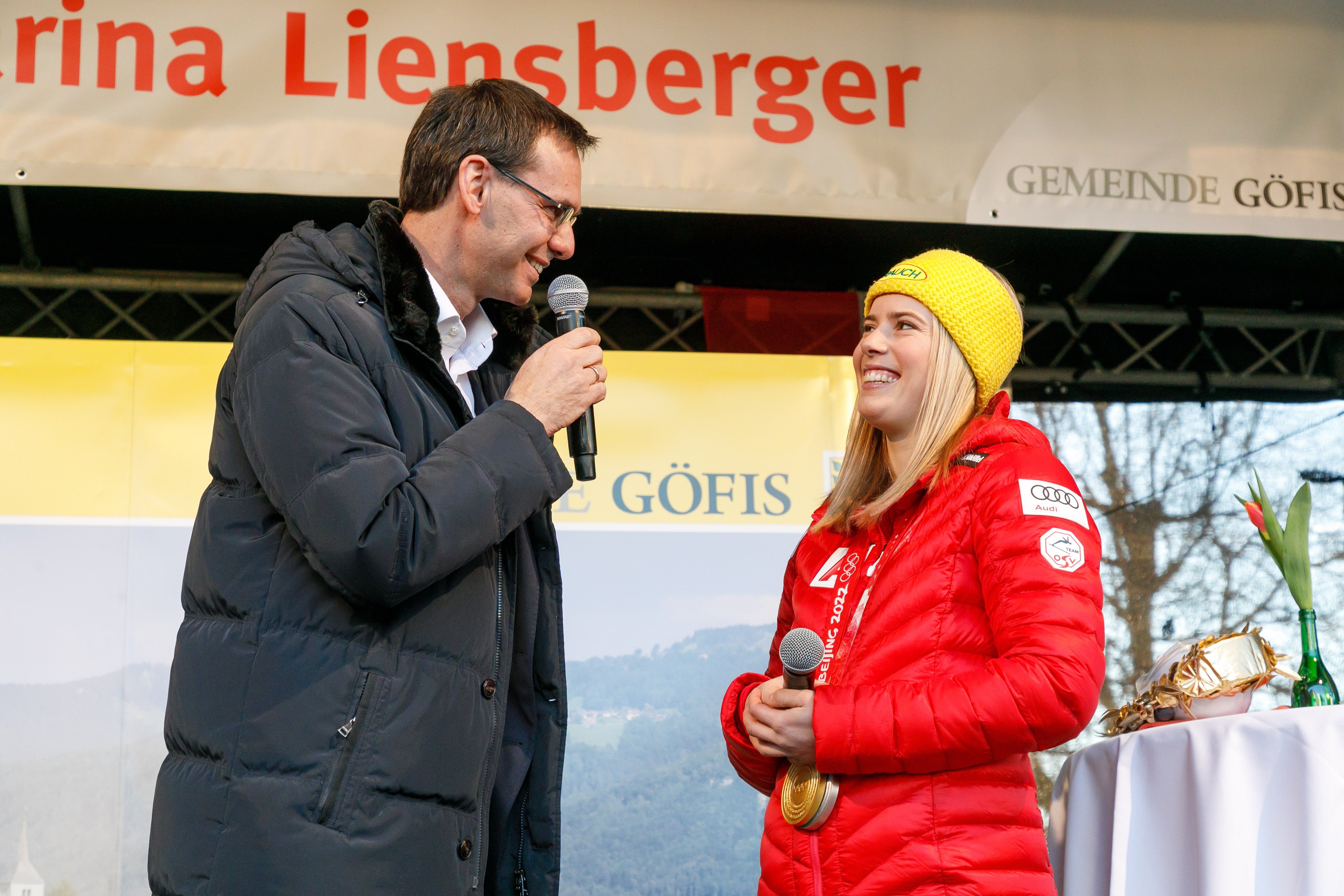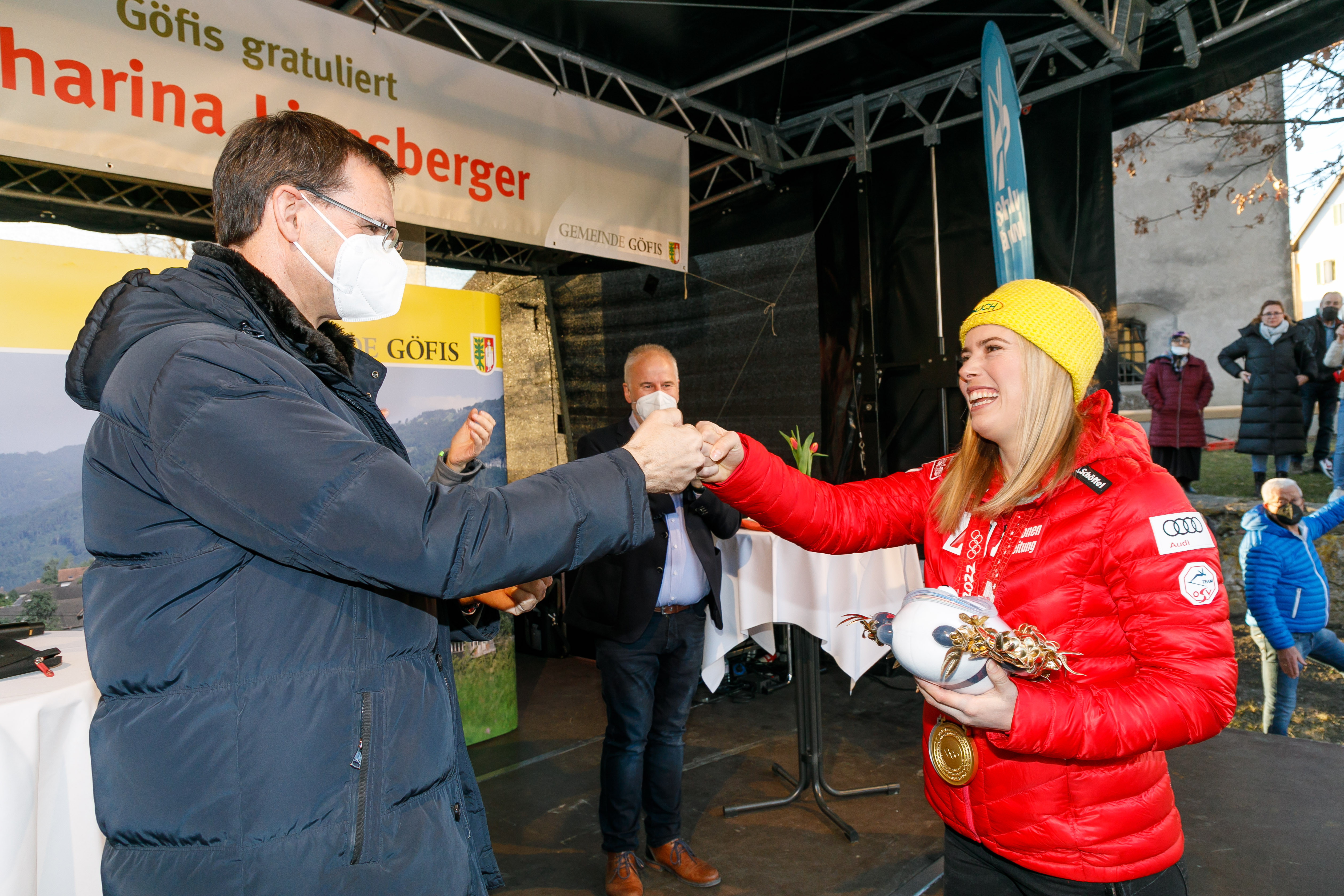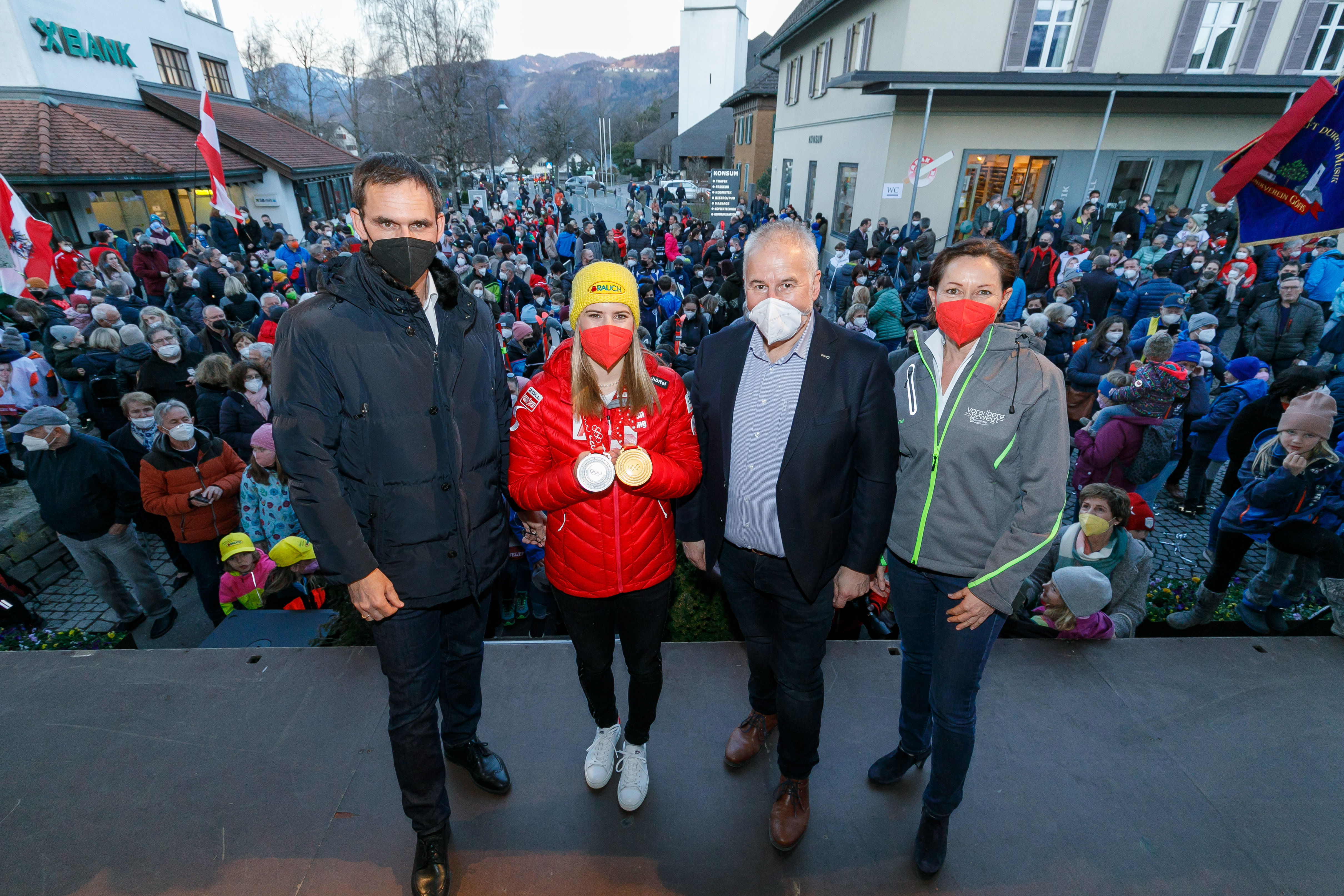 Göfis (VLK) – „Herzliche Gratulation zur fantastischen Leistung von Katharina Liensberger. Sie ist ein großes Vorbild für unsere sportbegeisterte junge Generation in Vorarlberg.“ Das sagte Landeshauptmann Markus Wallner am Mittwoch (23. Februar) beim großen Empfang für die Olympiaheldin in ihrer Heimatgemeinde Göfis. Bei den 24. Winterspielen hatte sich Liensberger sensationell die Goldmedaille im alpinen Mixed-Teambewerb und die Silbermedaille im olympischen Damen-Slalom geholt. Zusammen mit Sportlandesrätin Martina Rüscher nützte der Landeshauptmann die Feier am Dorfplatz, um auch noch persönlich die Glückwünsche des Landes zu überbringen.