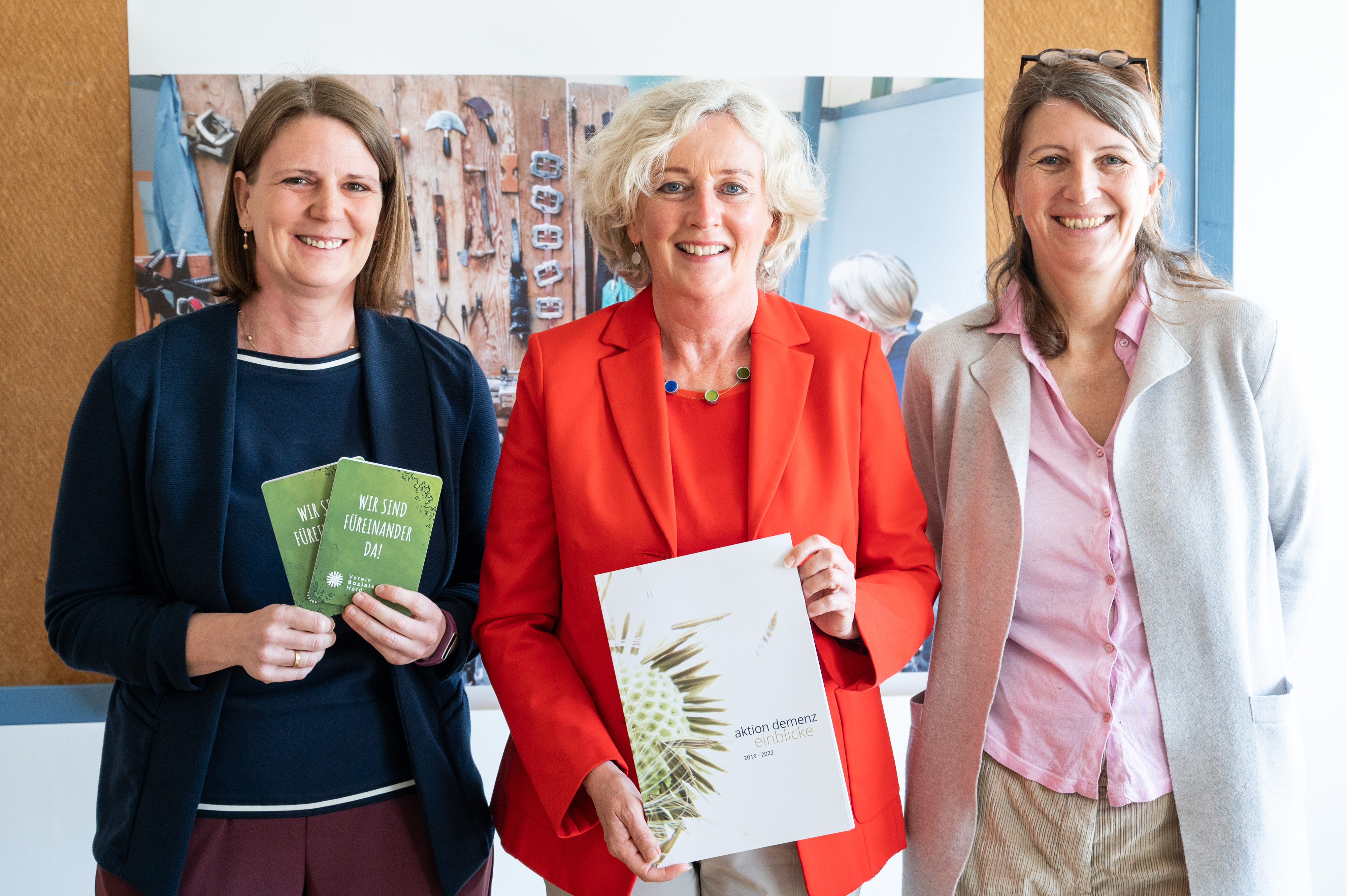 Hard (VLK) – Menschen mit Demenz und ihre An- und Zugehörigen sind in der ersten Zeit nach der Diagnose sehr gefordert und oft alleine. Dabei brauchen sie gerade in dieser Phase ein intaktes Gemeinwesen und gesellschaftliche Teilhabe. Um Betroffenen und deren Familien eine gute Begleitung und Unterstützung anbieten zu können, wurde auf Anregung und Initiative der Aktion Demenz das innovative Projekt „Begleitung nach der Diagnose Demenz“ entwickelt. Es soll in der zweiten Jahreshälfte 2022 in einer Stadt und in einer Region mit mehreren Gemeinden gestartet werden, so Landesrätin Katharina Wiesflecker bei der Vorstellung am Mittwoch, 20. April, in Hard. Gemeinsam mit Projektleiterin Daniela Egger und Sozialsprengel Hard-Geschäftsführerin Cornelia Reibnegger präsentierte sie dabei auch den aktuellen Jahresbericht der Aktion Demenz.