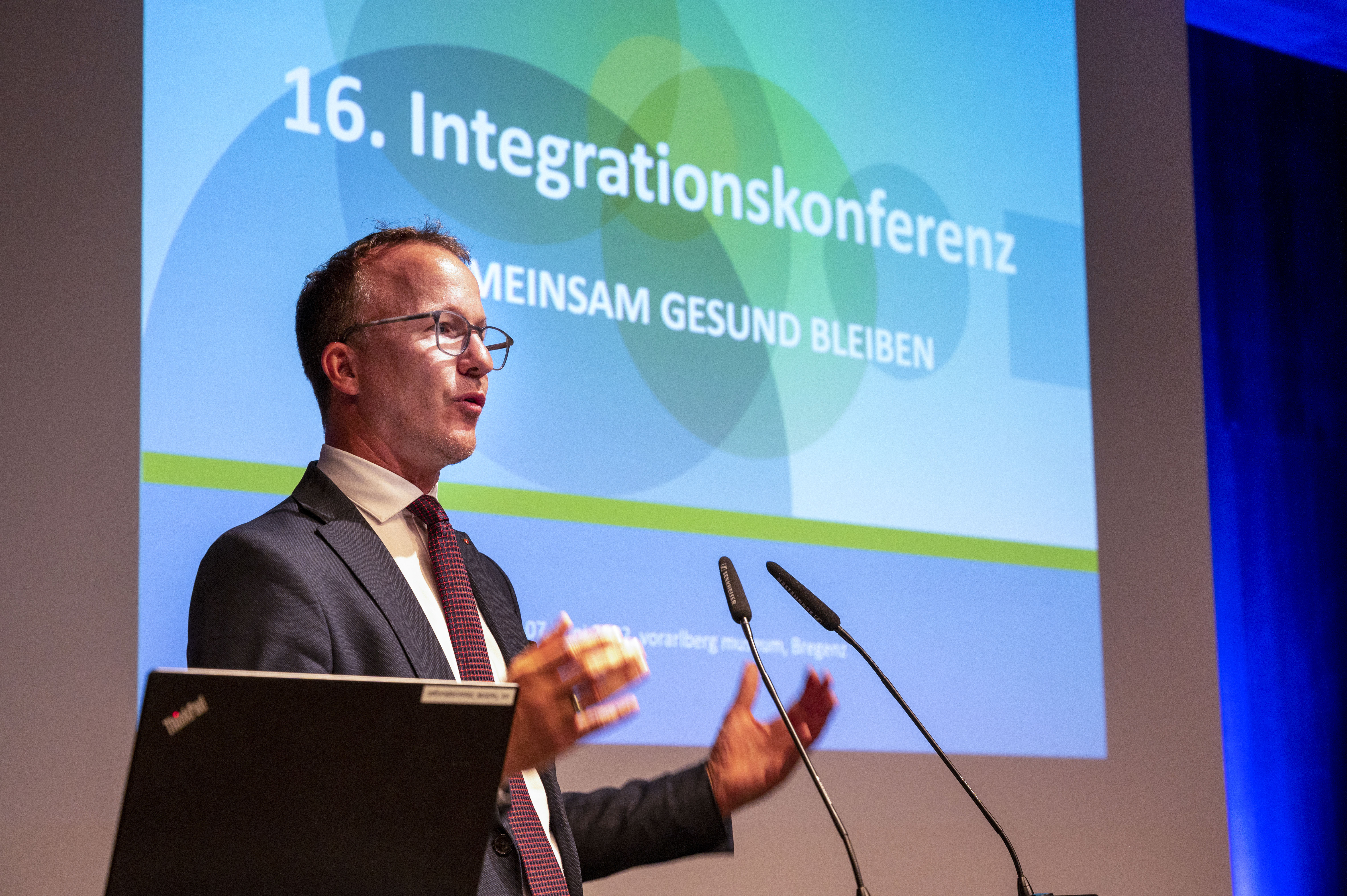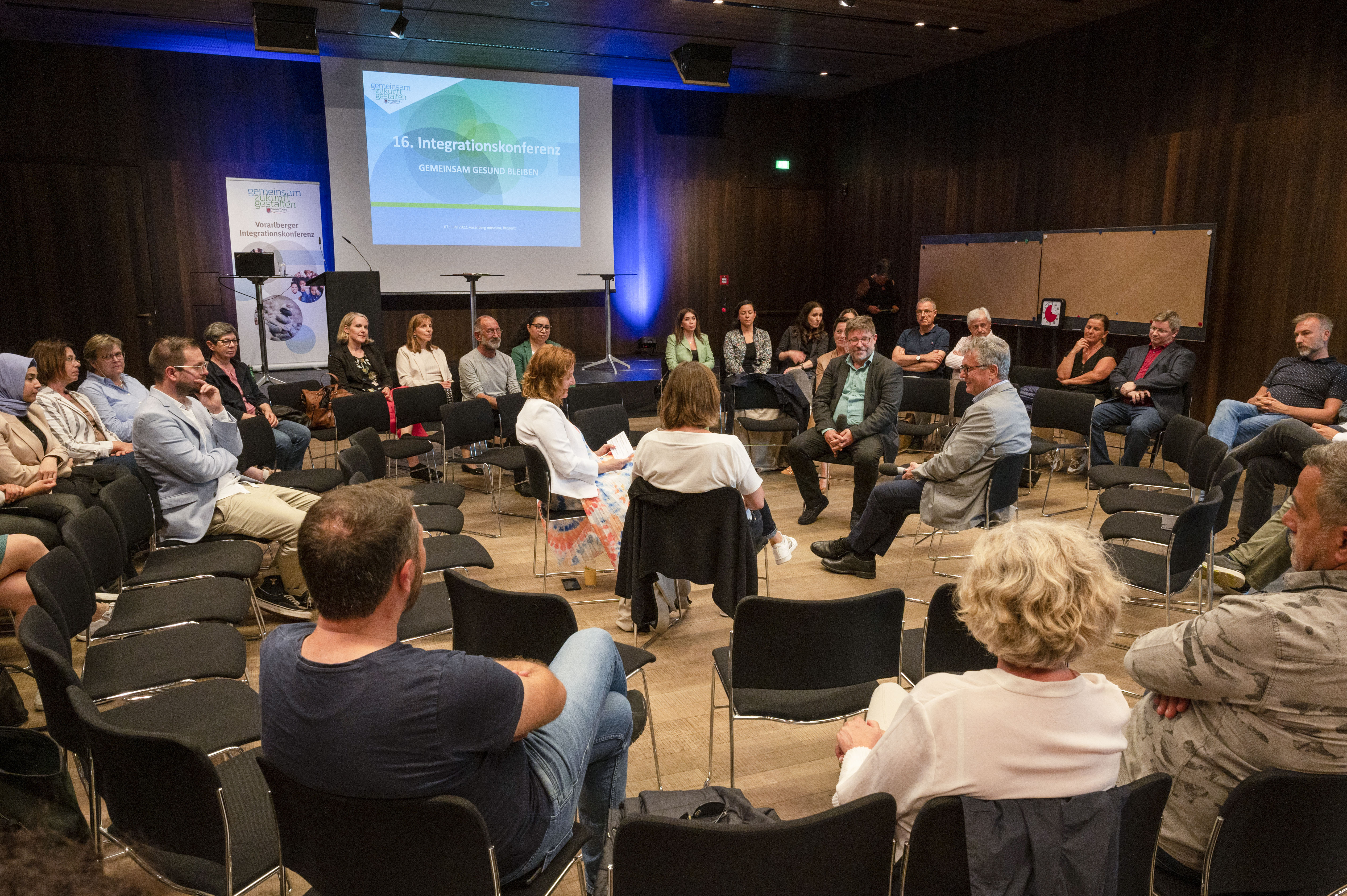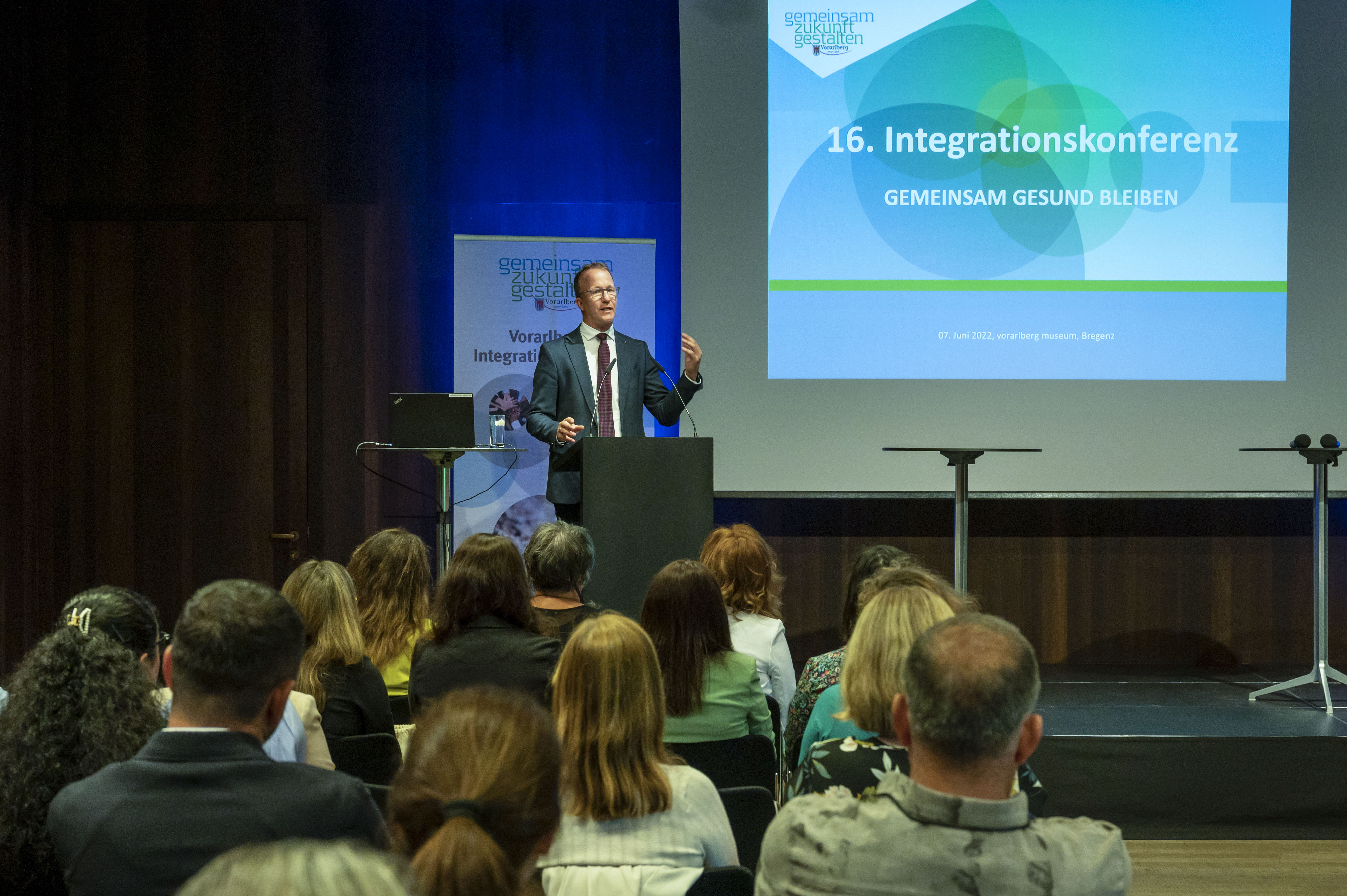 Bregenz (VLK) – Das Thema Gesundheit von Zugewanderten und ihren Nachkommen aus unterschiedlichen Perspektiven zu beleuchten, darum ging es bei der 16. Integrationskonferenz am Dienstag, 7. Juni 2022, im 'vorarlberg museum' in Bregenz. Das große gemeinsame Ziel – angelehnt an die Österreichischen Gesundheitsziele – ist auch in Vorarlberg mehr Gesundheit, Lebensqualität und Wohlbefinden für alle, betonten Landesrat Christian Gantner und Landesrätin Martina Rüscher: „Wer in Vorarlberg lebt, soll die gleichen Chancen auf Gesundheit haben, unabhängig von Alter, Bildung, Einkommen, Herkunft, Wohnumgebung oder Geschlecht. Das kommt sowohl den Einzelnen als auch der Gesellschaft insgesamt zugute. Dieses Ziel für die gesamte Bevölkerung bindet auch die Zugewanderten und ihre Nachkommen ein.“ Bei der Integrationskonferenz wurden aktuelle Informationen auf Basis der Studie „Migration in Österreich – Gesundheitliche und ökonomische Aspekte“ vorgestellt, in Vorarlberg gesetzte gute Praxisbeispiele aufgezeigt und das Gehörte in den Vorarlberger Kontext gestellt und erörtert.