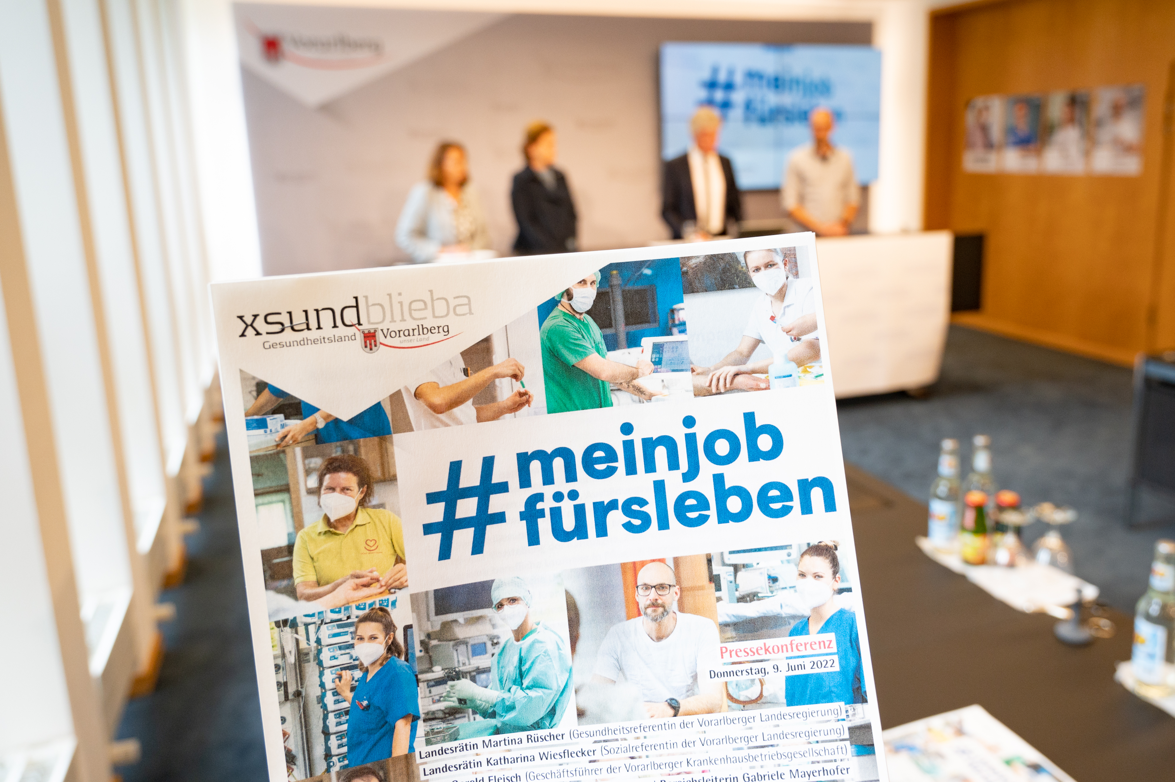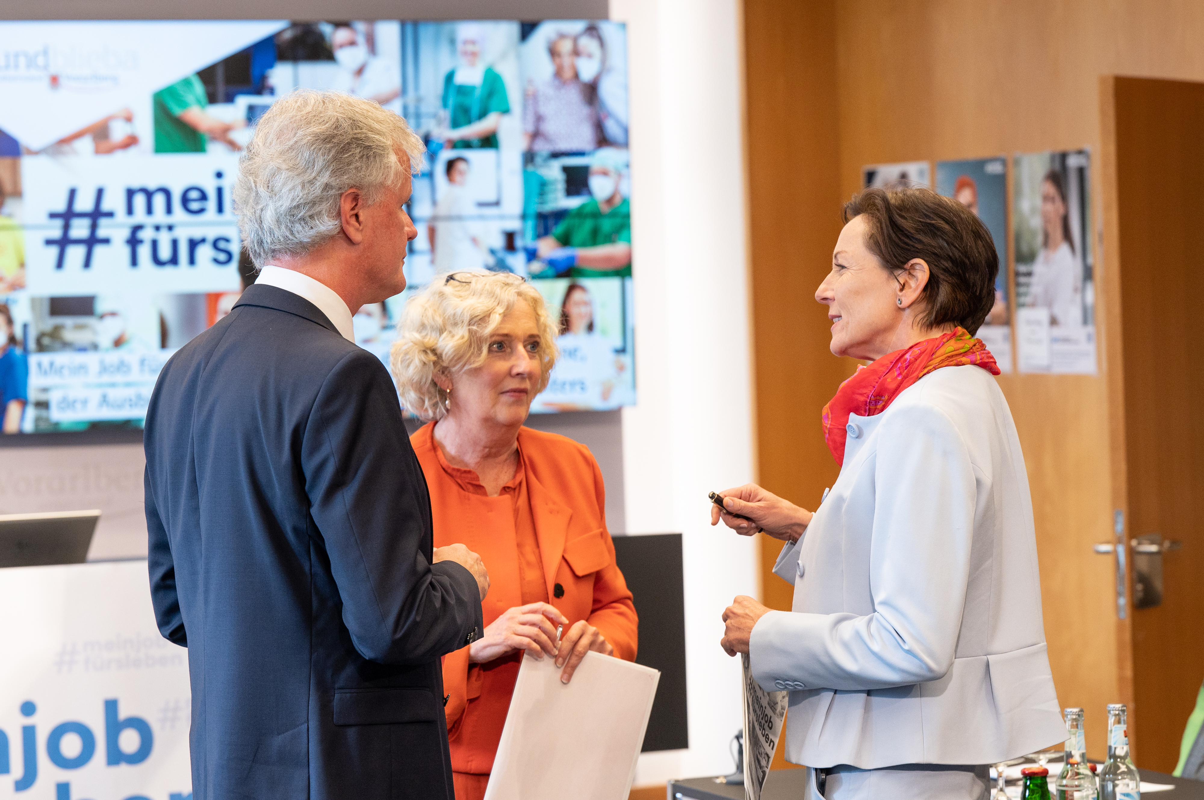 Bregenz (VLK) – Unter dem Titel „Mein Job fürs Leben“ starten die Vorarlberger Landeskrankenhäuser und der Vorarlberger Sozialfonds eine gemeinsame Kommunikationsoffensive für Berufe in Pflege & Betreuung. Außerdem wird für Ausbildungen in diesem Bereich künftig eine großzügige Ausbildungsförderung geboten. Und damit alle, die sich für dieses Berufsfeld interessieren, bestmöglich informiert und beraten werden können, wurden die bewährten Beratungsangebote der connexia Implacementstiftung zu einem Welcome Center für Pflege & Soziales als neutrale Anlaufstelle für die berufliche (Neu-)Orientierung weiterentwickelt. „Wir wollen die vielfältigen Berufsbilder, Ausbildungswege und Karrierechancen aufzeigen und die nötigen Anreize schaffen, um aufgrund des steigenden Bedarfs dringend benötigte Pflegekräfte für Vorarlberg zu gewinnen“, so Gesundheitslandesrätin Martina Rüscher und Soziallandesrätin Katharina Wiesflecker bei der Vorstellung dieser Maßnahmen am Donnerstag, 9. Juni, im Landhaus.