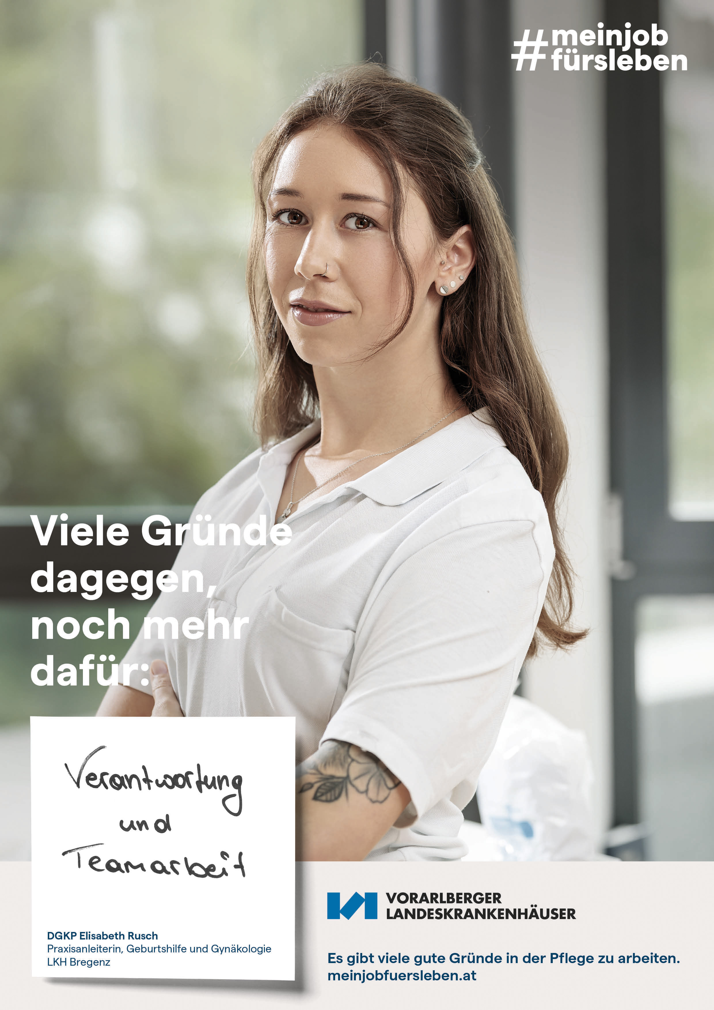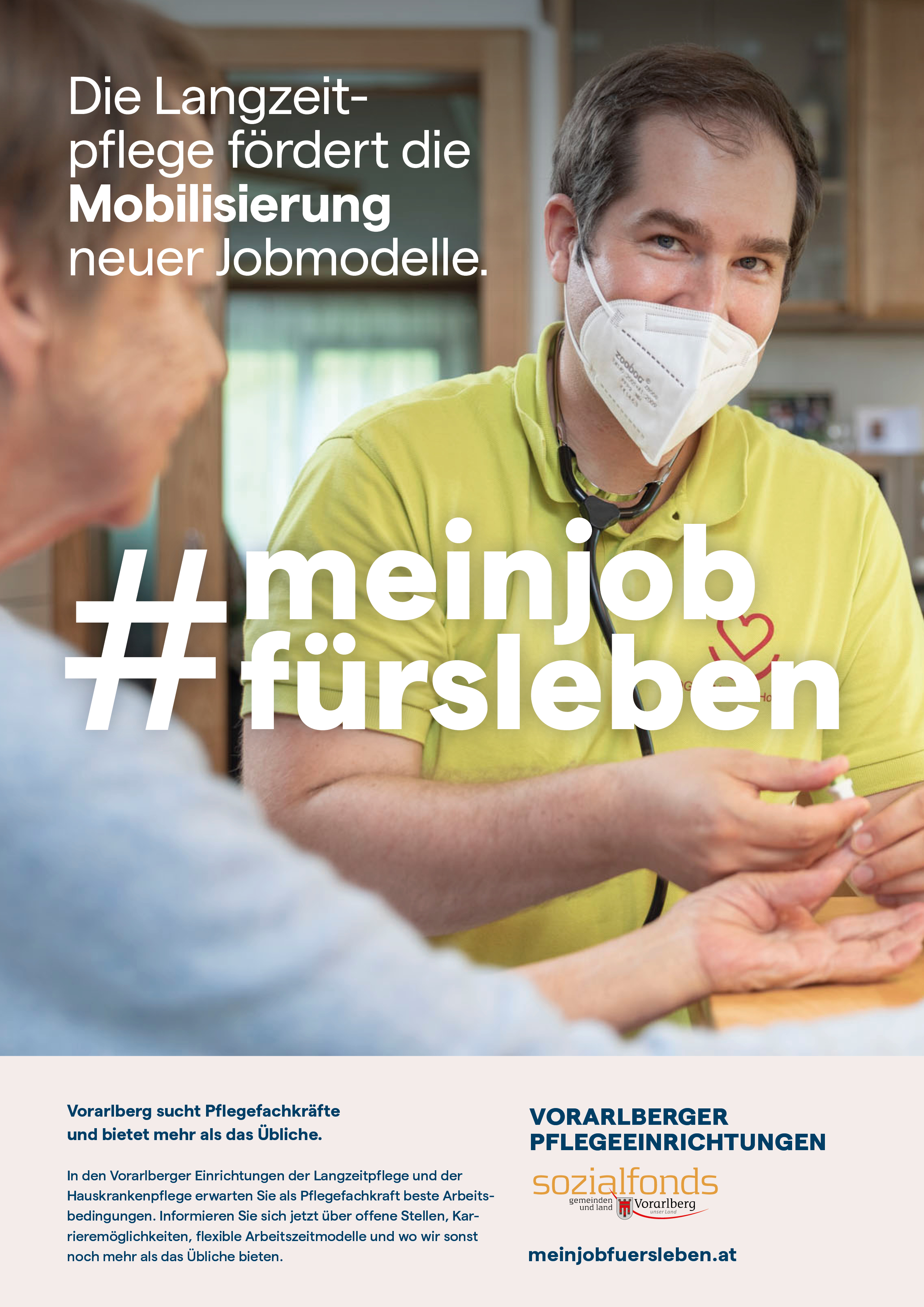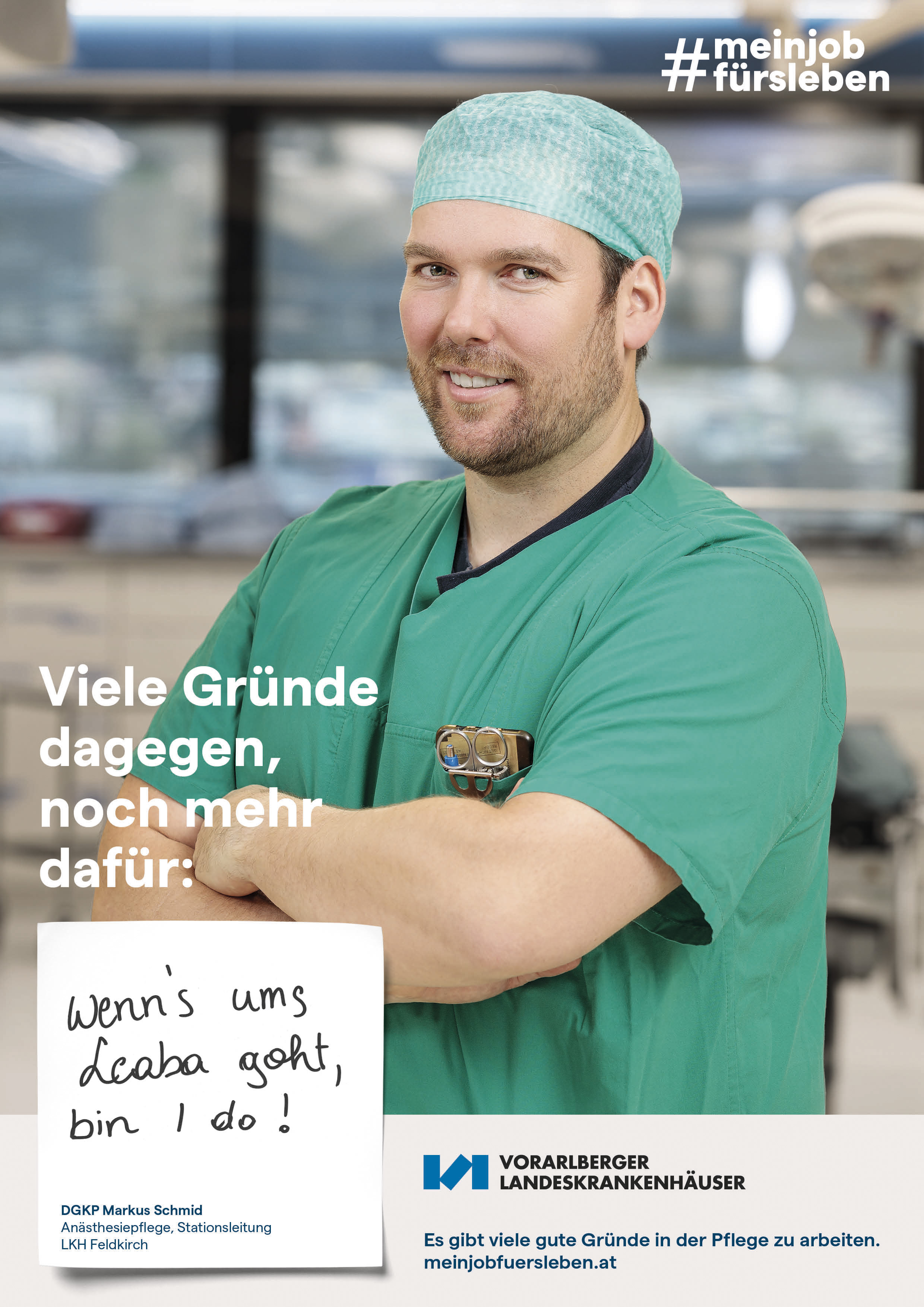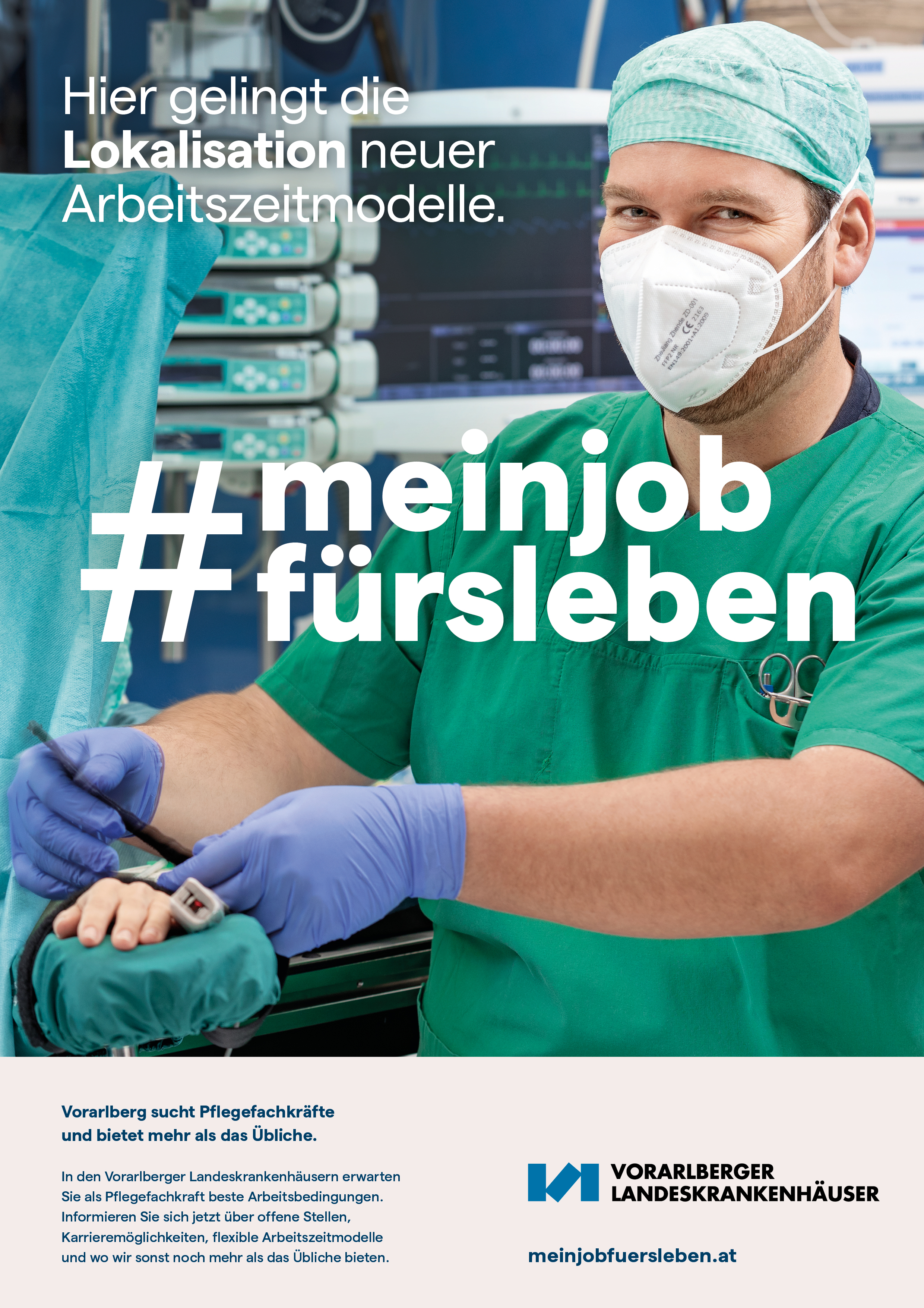 In der Kampagne geht es vorranging darum, die vielfältigen Pflege- und Betreuungsberufe vorzustellen und deren Vorzüge hervorzuheben, erläutert KHBG-Geschäftsführer Gerald Fleisch: „Die enorm sinnstiftende Arbeit, die hohe Zukunftssicherheit, große Jobvielfalt und Karrieremöglichkeiten, die flexiblen Jobmodelle und auch die gute Bezahlung sollen ins rechte Licht gerückt werden – ohne dabei die täglichen Herausforderungen und Anstrengungen schön färben zu wollen.“ Die Kampagne „Mein Job fürs Leben“ bildet alle Berufsmöglichkeiten im Akutbereich, in der stationären Langzeitpflege sowie der mobilen Pflege ab und richtet sich nach innen und nach außen. So stellen sich zum einen aktive Pflegefachkräfte mit ihren unterschiedlichen Motivationen für den oft fordernden Pflegeberuf vor, zum anderen werden Um- und EinsteigerInnen angesprochen, um sie für einen der zahlreichen Ausbildungswege in der Pflege und Betreuung zu begeistern. Im gesamten deutschsprachigen Raum wird mit der Kampagne nach zusätzlichen Pflegefachkräften für Vorarlberg gesucht.